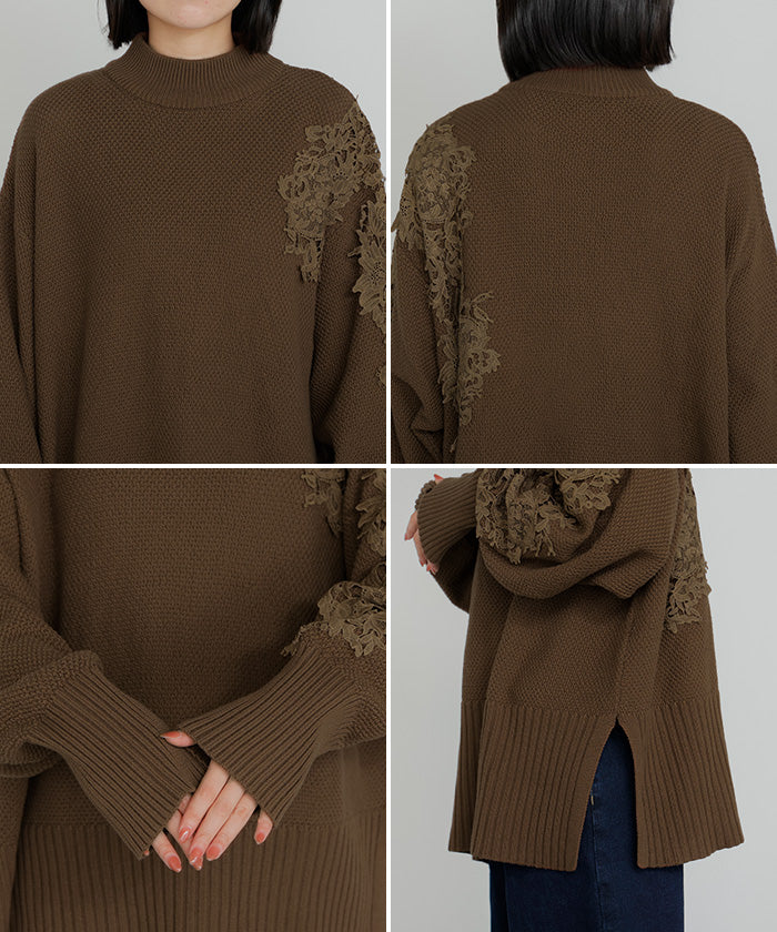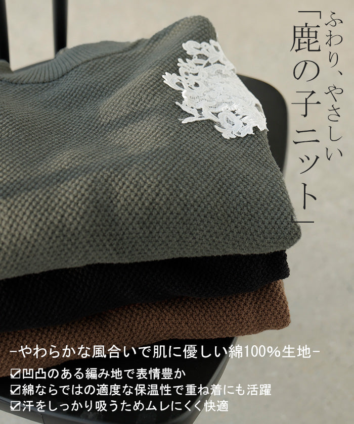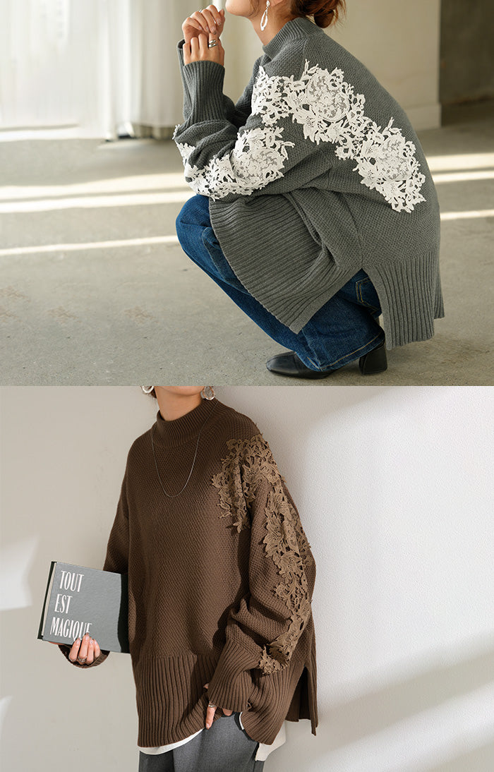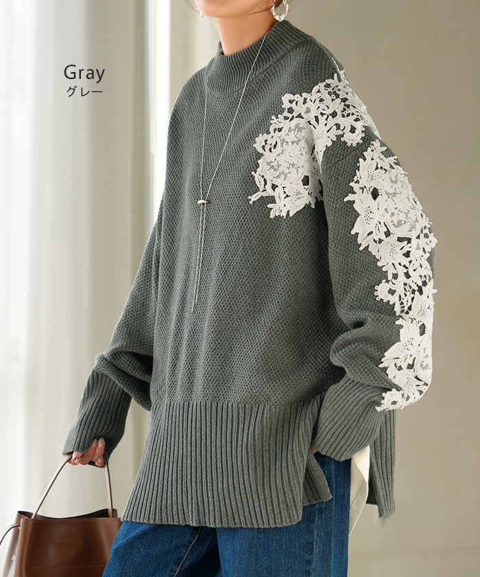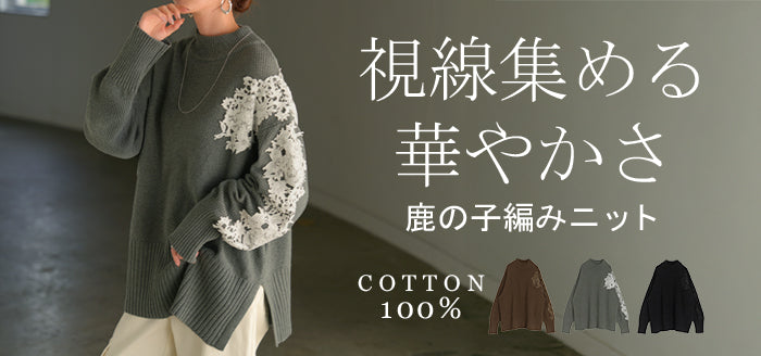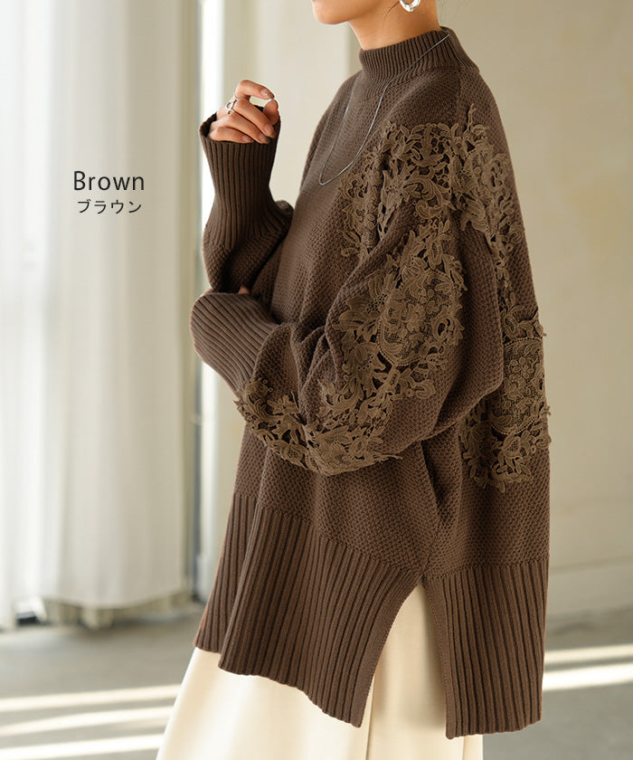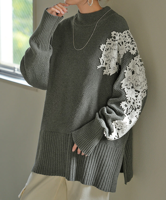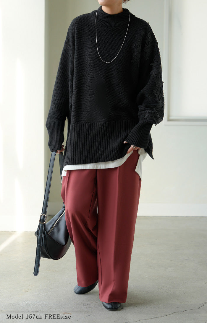 2025AW新作 ニット レース 鹿の子 綿100 レディース トップス ロング セーター オーバー プルオーバー 長袖 長い チクチクしない ハイネック チュニック アシンメトリー リブ ゆったり 体型カバー 大きいサイズ お尻が隠れる カジュアル 黒 グレー 秋 冬 HUG.U