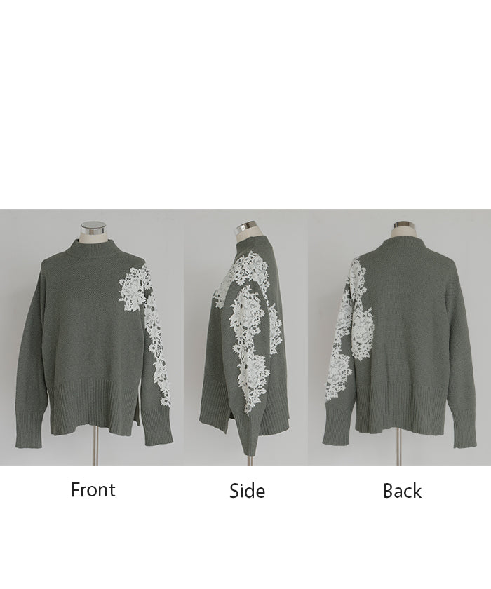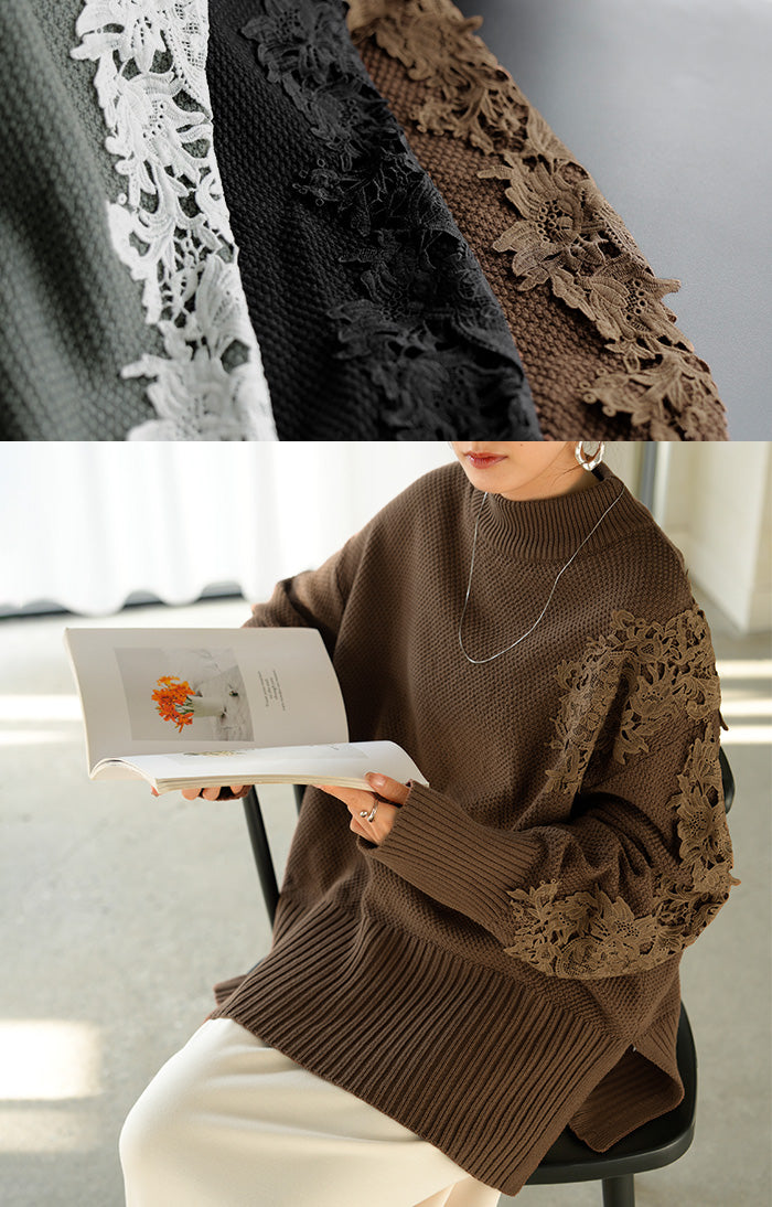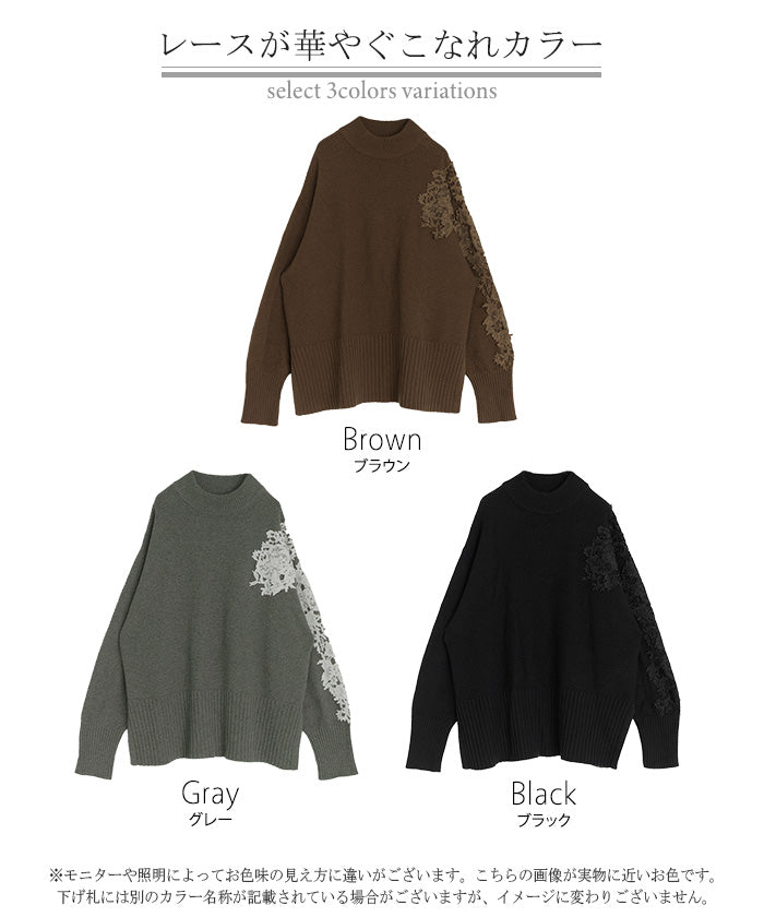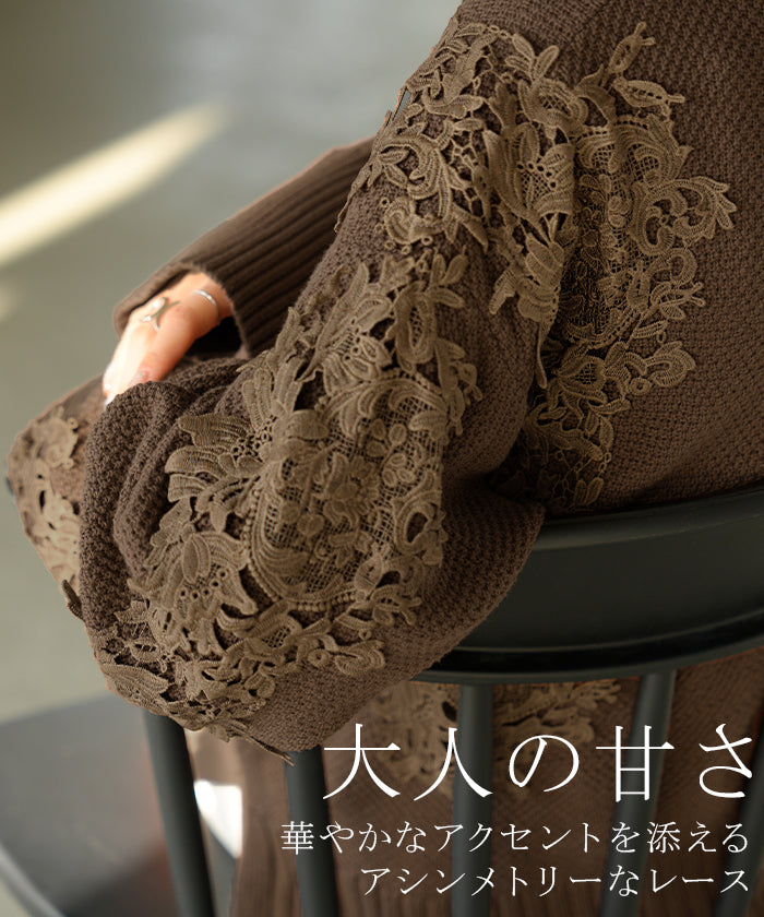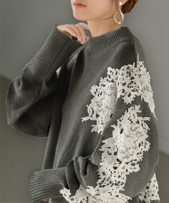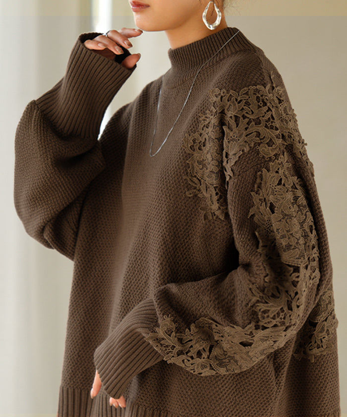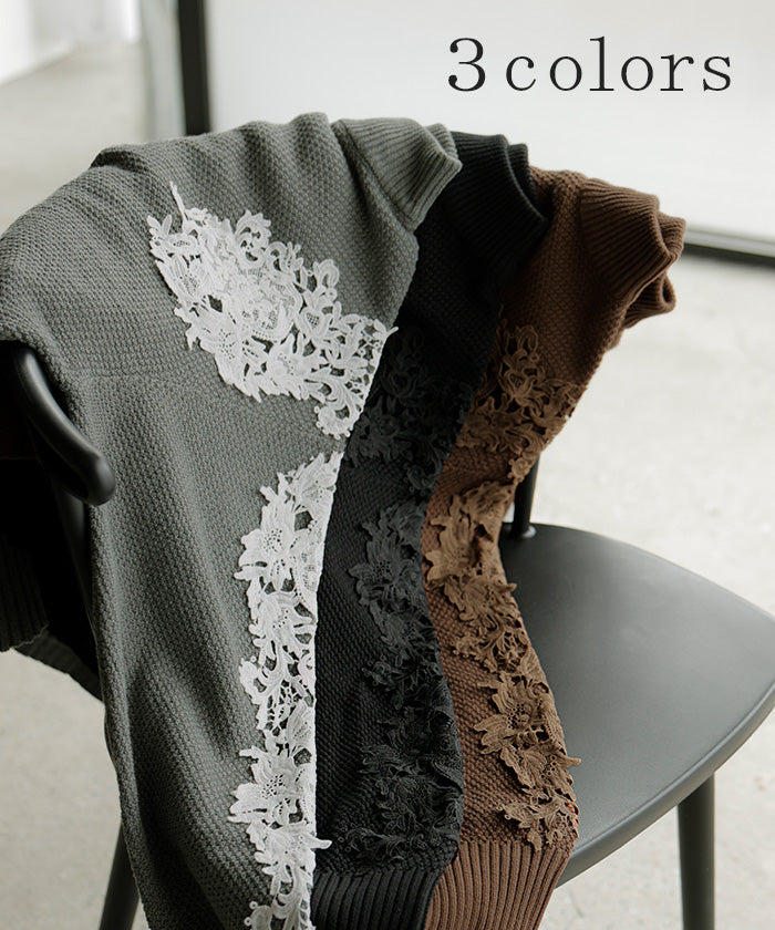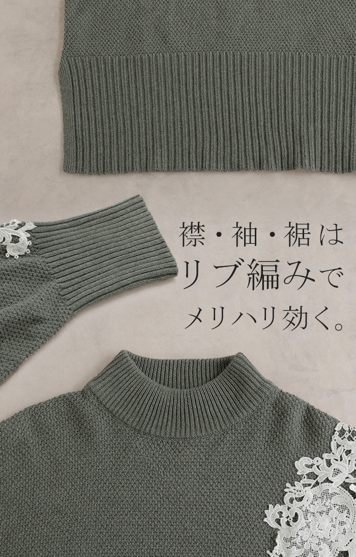 2025AW新作 ニット レース 鹿の子 綿100 レディース トップス ロング セーター オーバー プルオーバー 長袖 長い チクチクしない ハイネック チュニック アシンメトリー リブ ゆったり 体型カバー 大きいサイズ お尻が隠れる カジュアル 黒 グレー 秋 冬 HUG.U