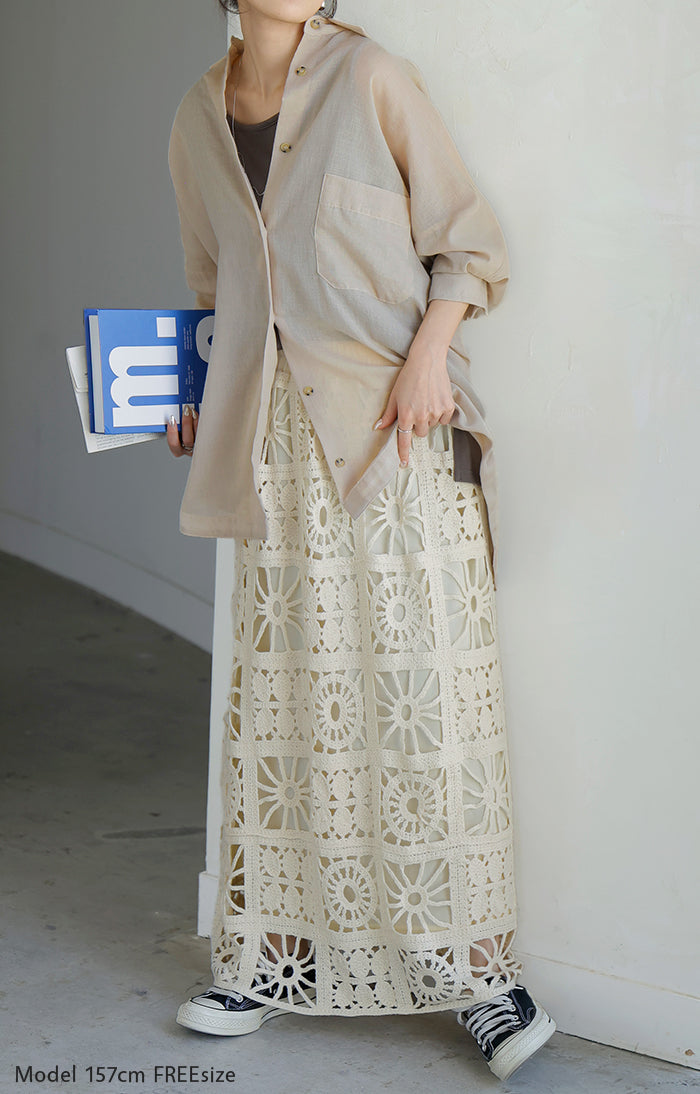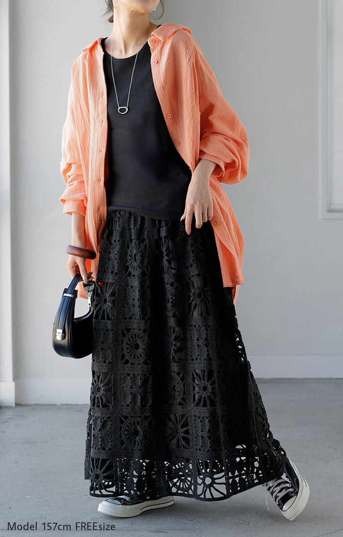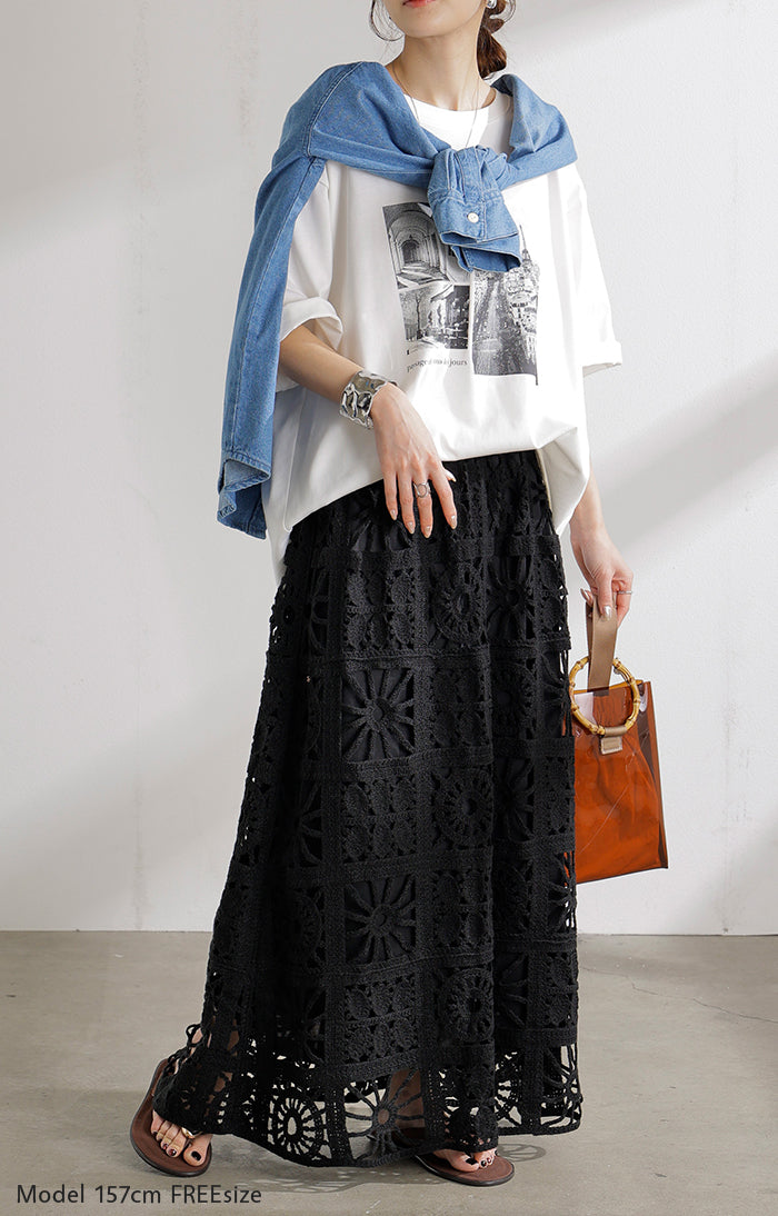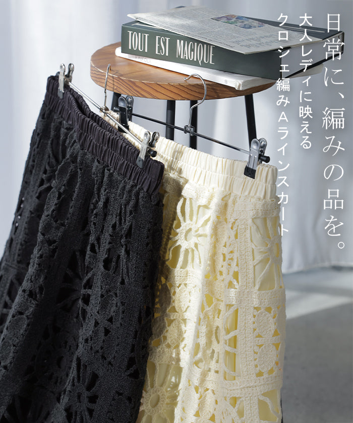 【早割10%OFF】 2026SS新作 スカート ロング 透かし編み レディース ロングスカート Aライン クロシェ編み 綿100 ボトムス ボトム フレア フレアスカート マキシ マキシスカート ウエストゴム 透け感 模様 長い ゆったり きれいめ ハイウエスト おしゃれ 黒 アイボリー 春 夏 ハグユー