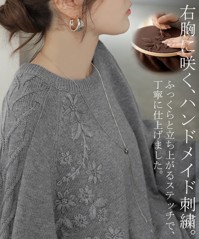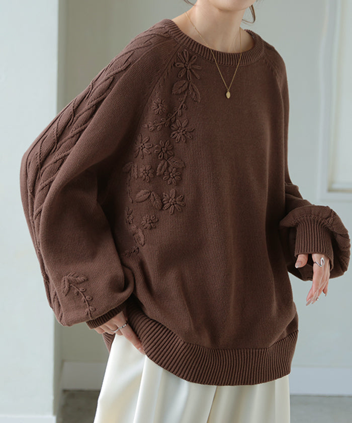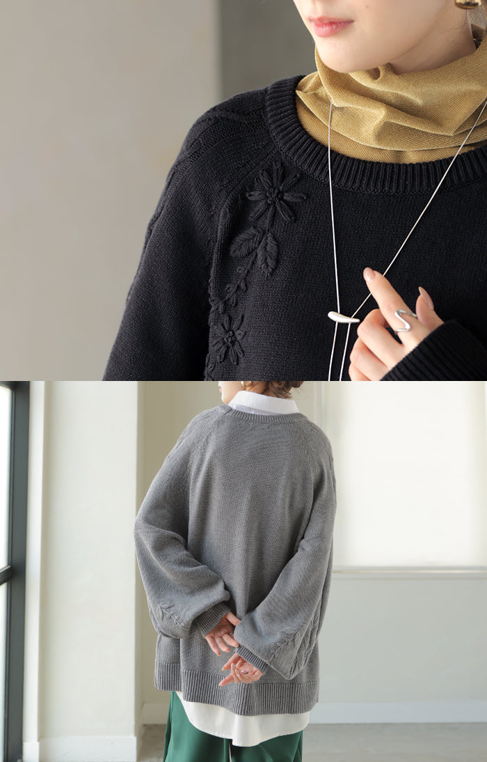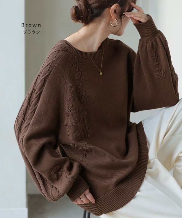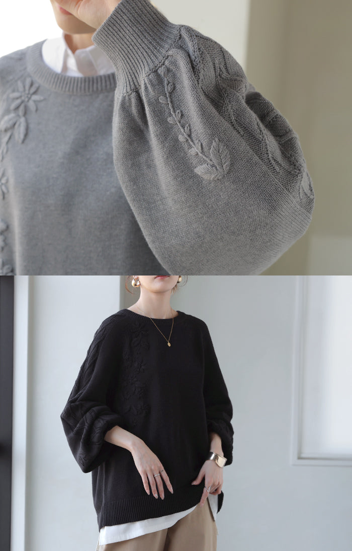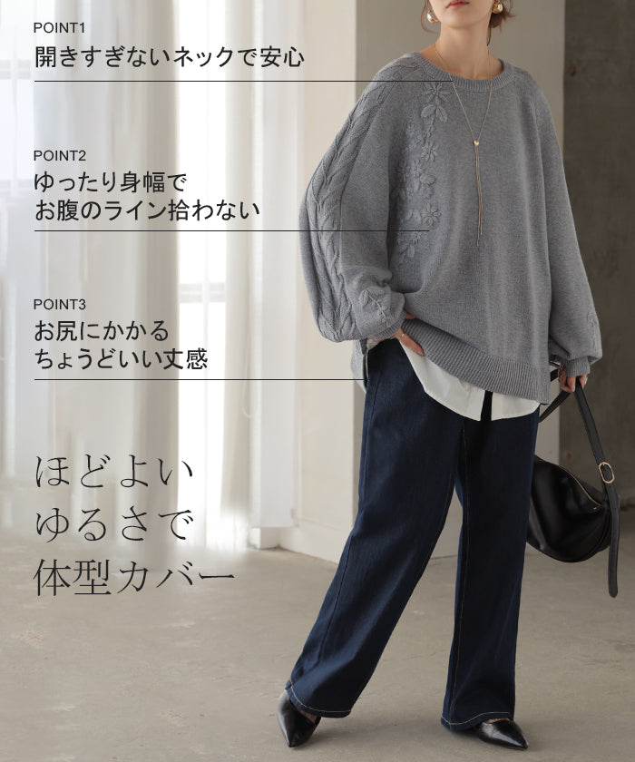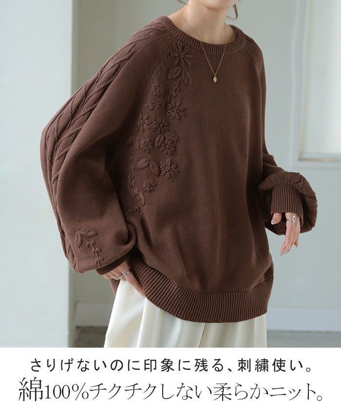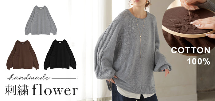 2025AW新作 ニット 刺繍 綿100 ■1月中旬入荷 ハンドメイド ロング レディース トップス セーター オーバー プルオーバー 花柄 チクチクしない ケーブル 長袖 長い ボリュームスリーブ クルーネック リブ ゆったり 体型カバー 大きいサイズ カジュアル 黒 グレー 秋 冬 HUG.U