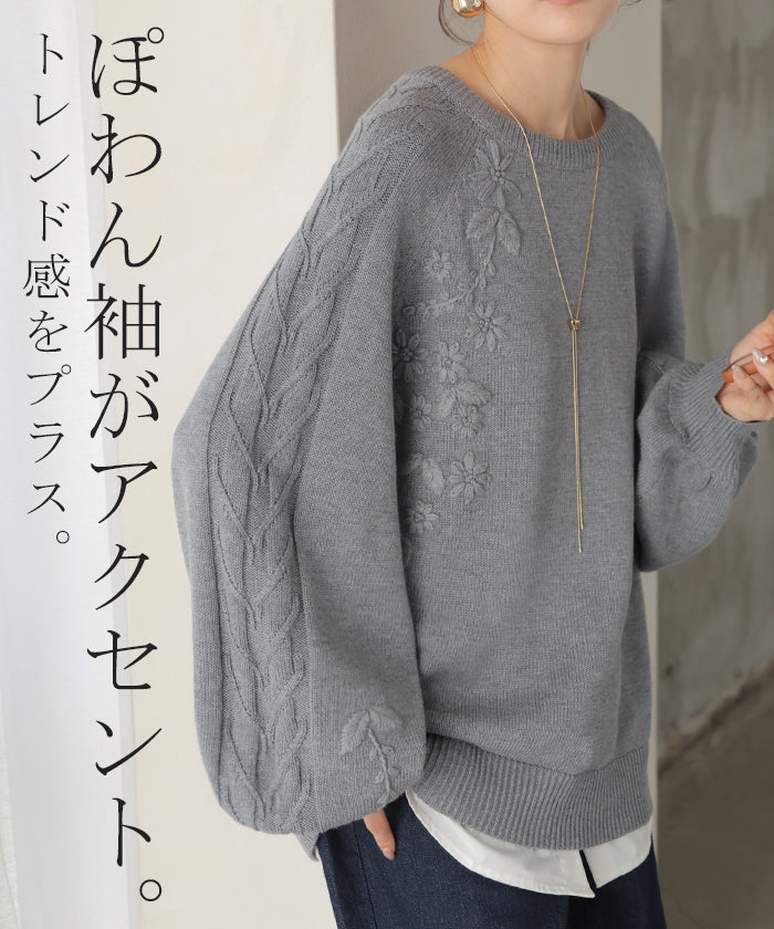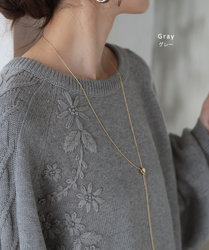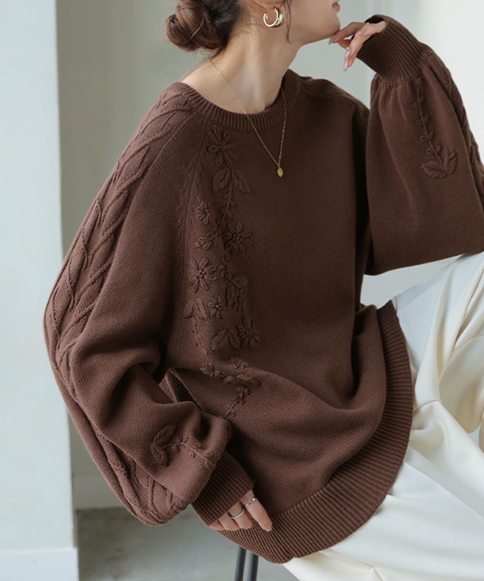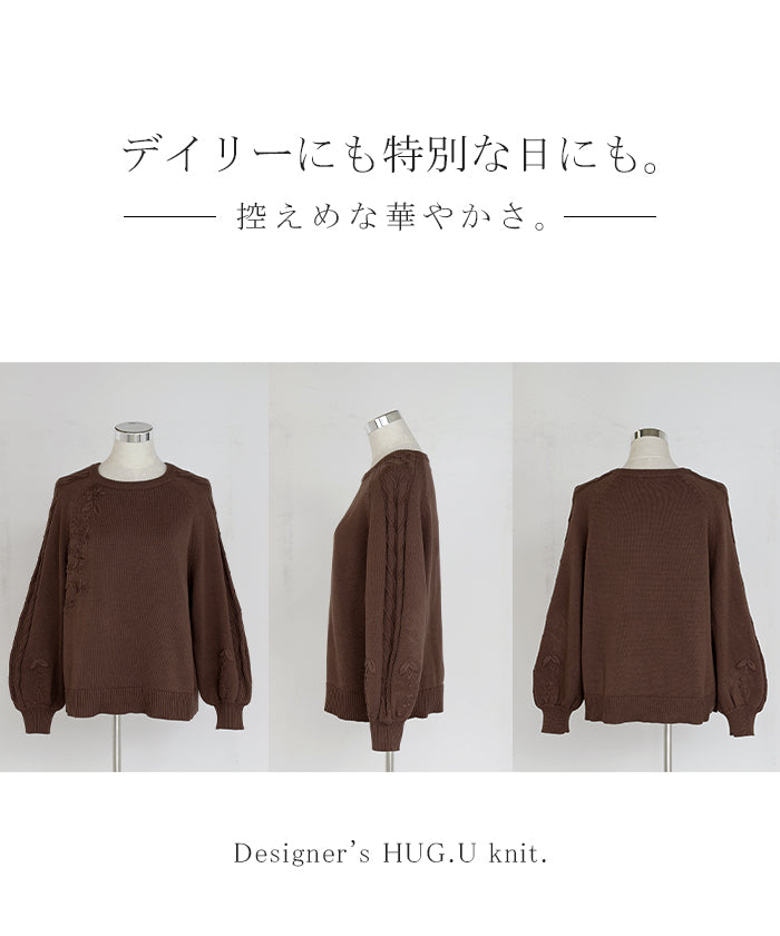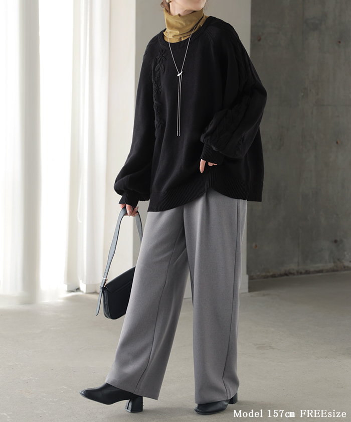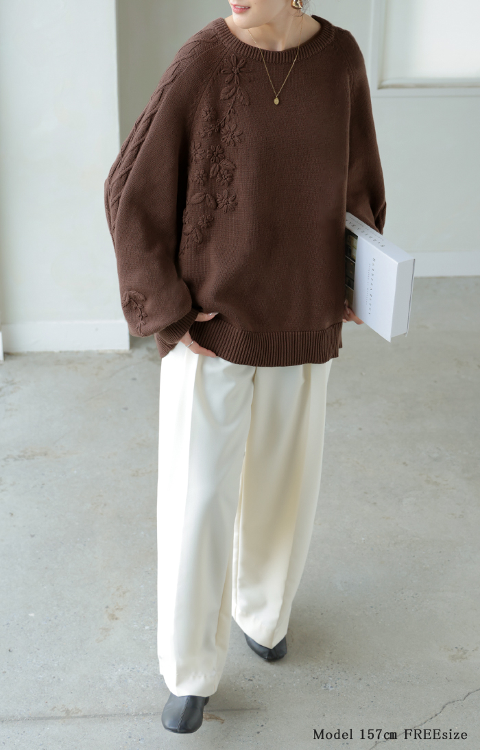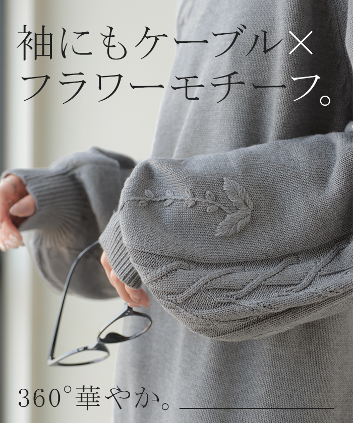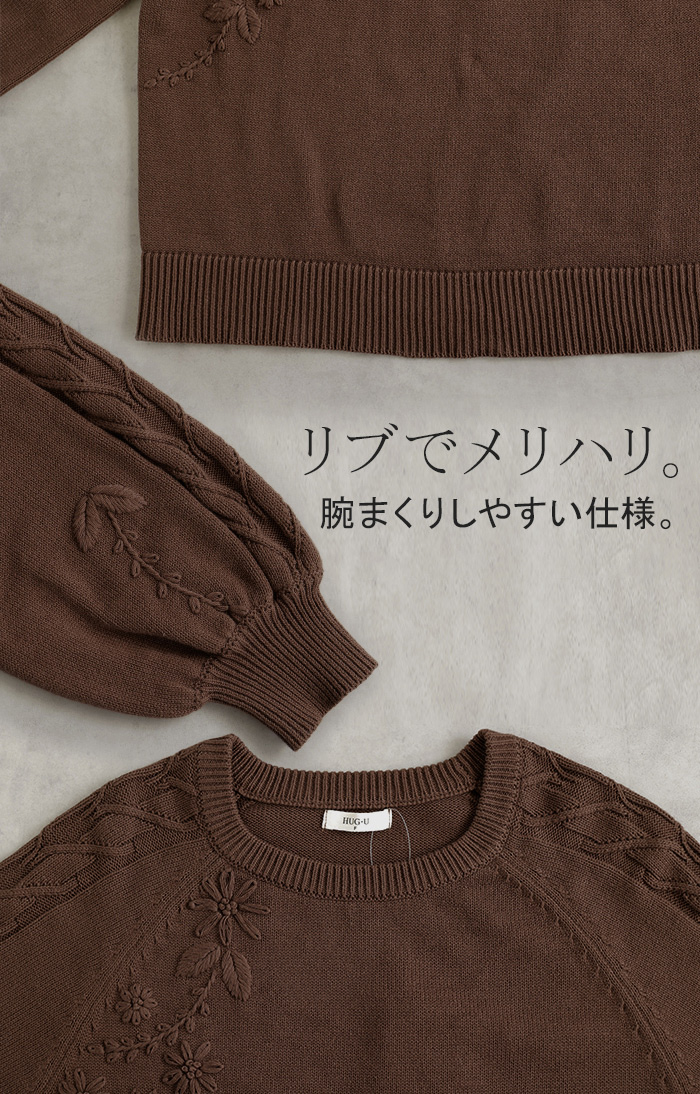2025AW新作 ニット 刺繍 綿100 ■1月中旬入荷 ハンドメイド ロング レディース トップス セーター オーバー プルオーバー 花柄 チクチクしない ケーブル 長袖 長い ボリュームスリーブ クルーネック リブ ゆったり 体型カバー 大きいサイズ カジュアル 黒 グレー 秋 冬 HUG.U