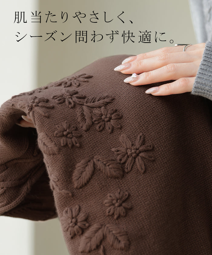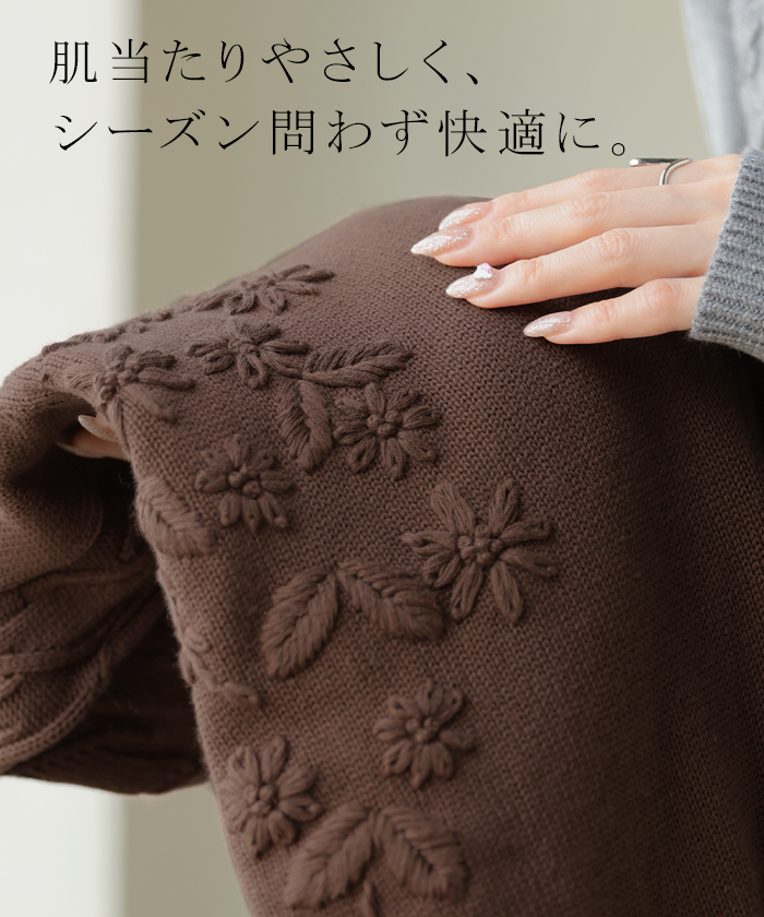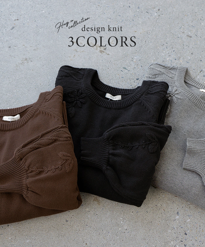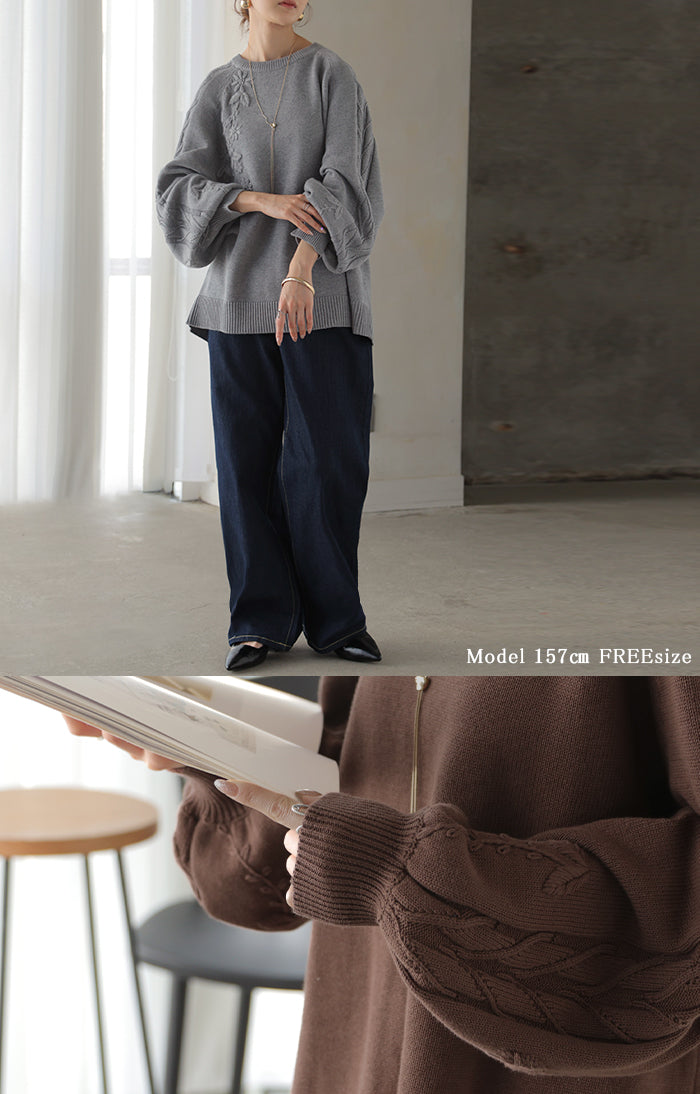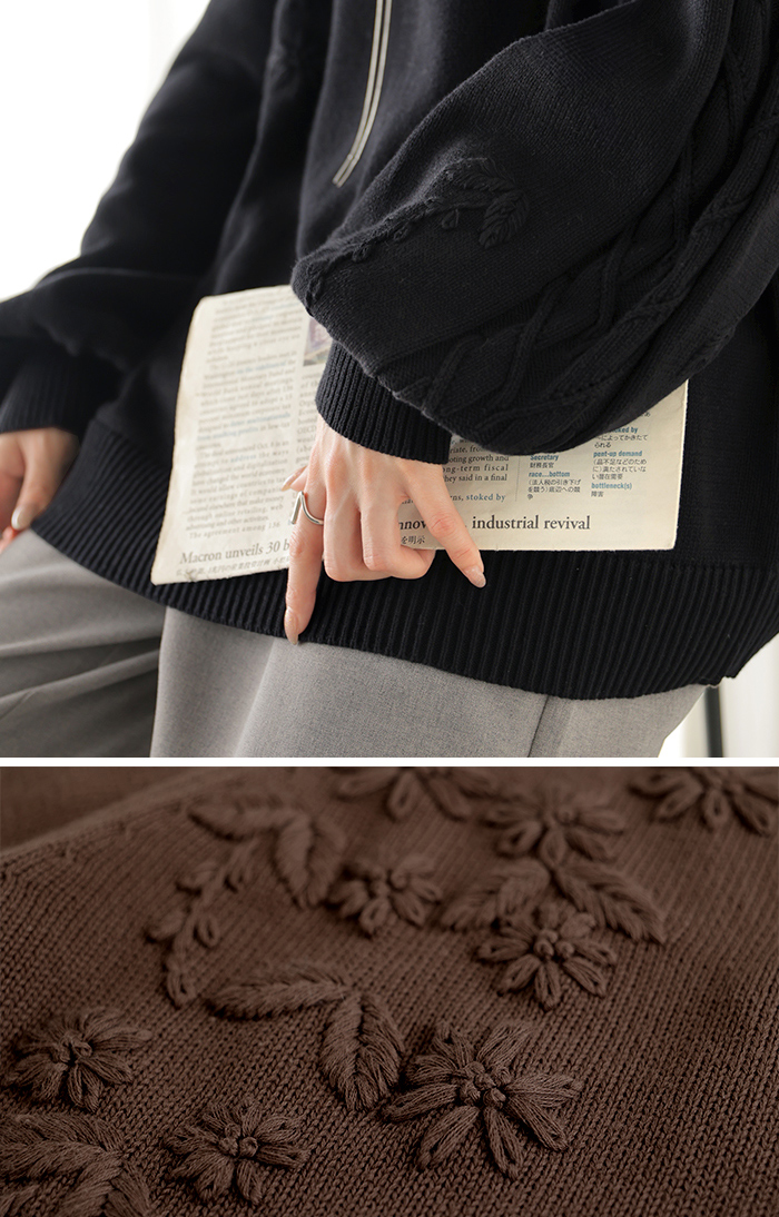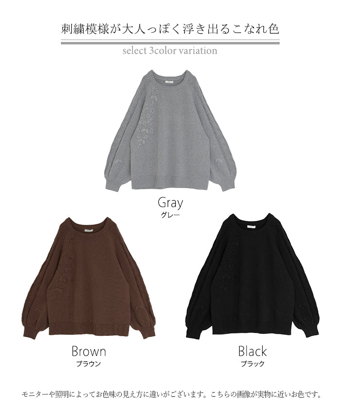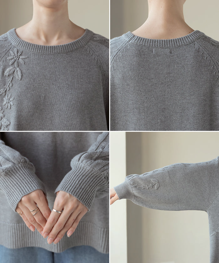 2025AW新作 ニット 刺繍 綿100 ■1月中旬入荷 ハンドメイド ロング レディース トップス セーター オーバー プルオーバー 花柄 チクチクしない ケーブル 長袖 長い ボリュームスリーブ クルーネック リブ ゆったり 体型カバー 大きいサイズ カジュアル 黒 グレー 秋 冬 HUG.U