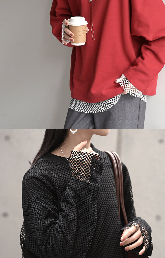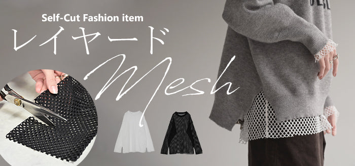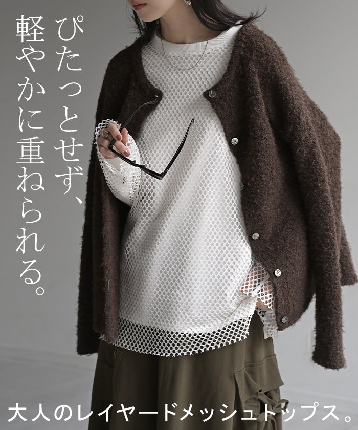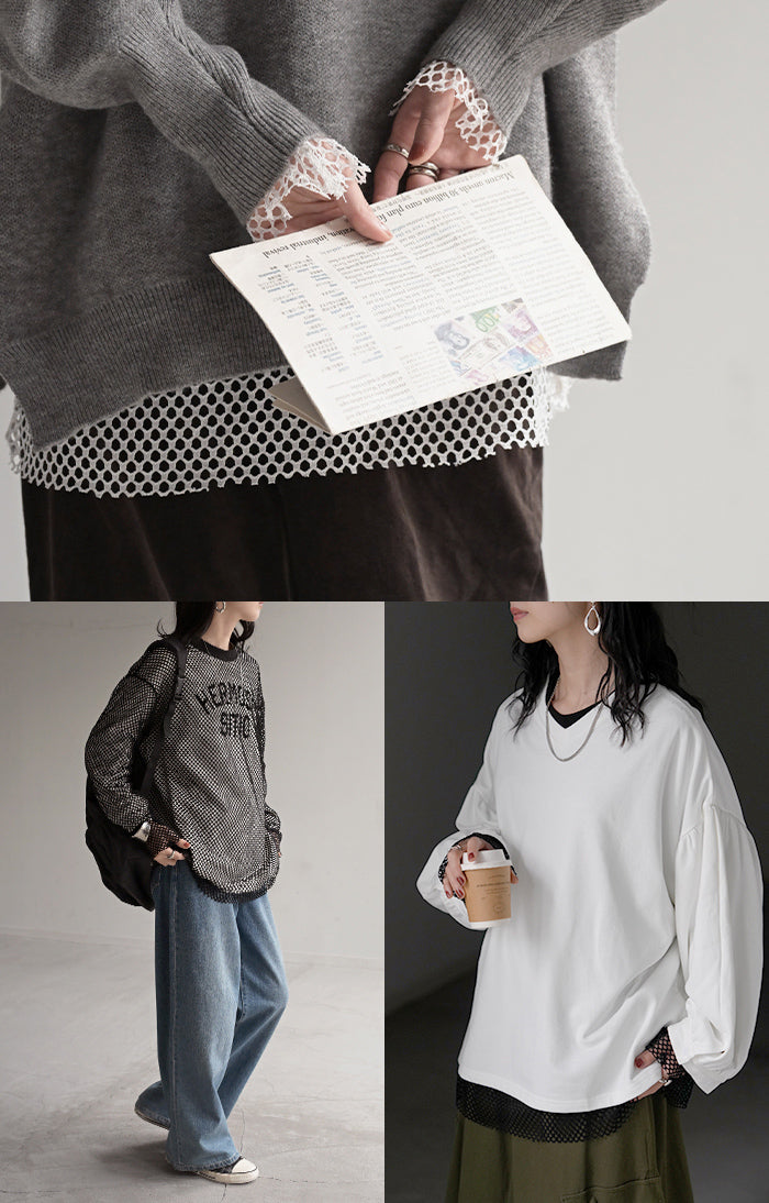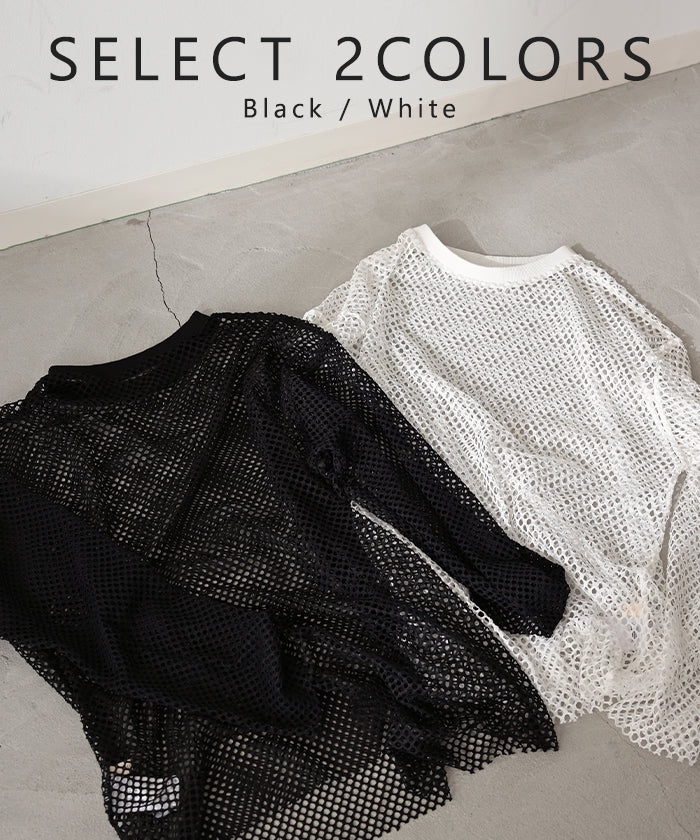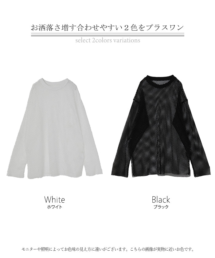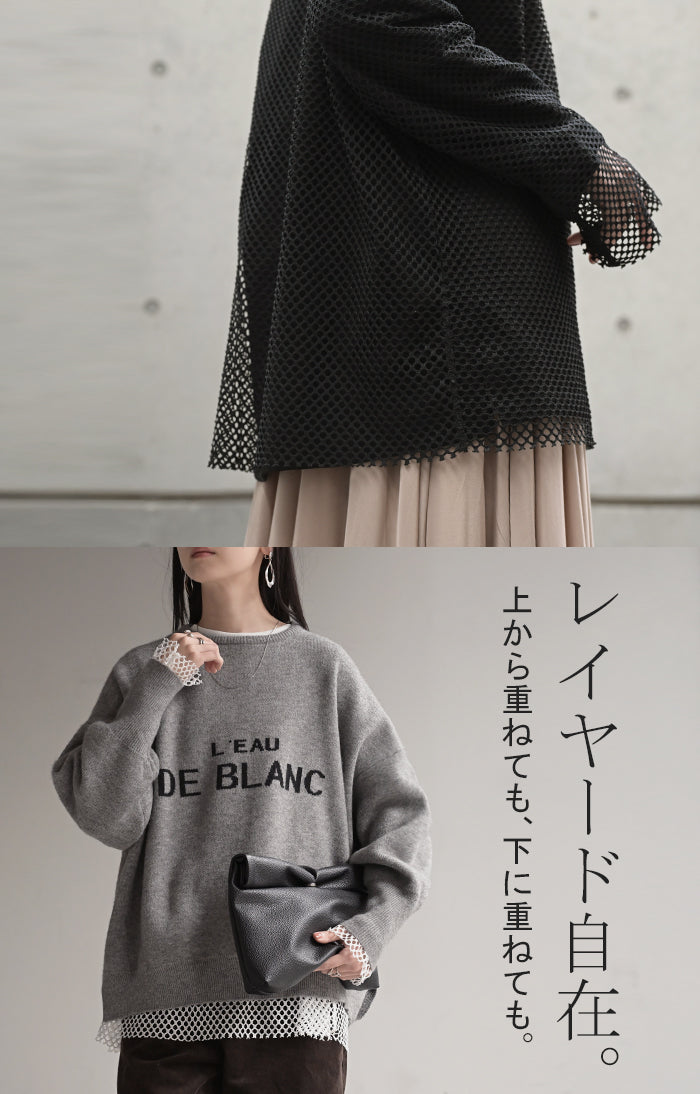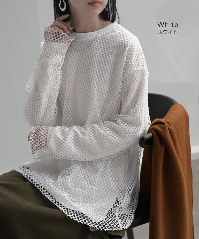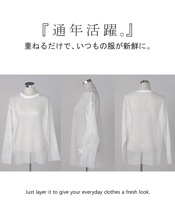 2025AW新作 プルオーバー ■11月下旬入荷 メッシュ セルフ カット トップス レディース レイヤード 透け感 メッシュトップス シアートップス インナー シアー シースルー シアーインナー 無地 長袖 薄手 ロング きれいめ カジュアル 重ね 体型カバー 大きいサイズ 黒 白 秋 冬 HUG.U メール便