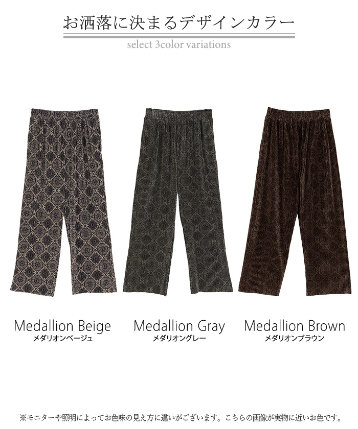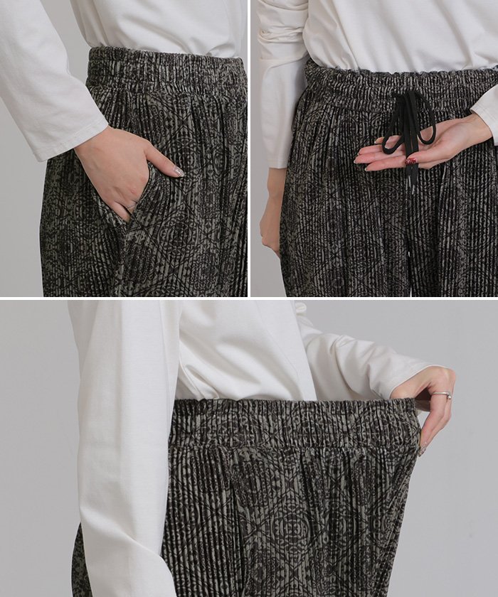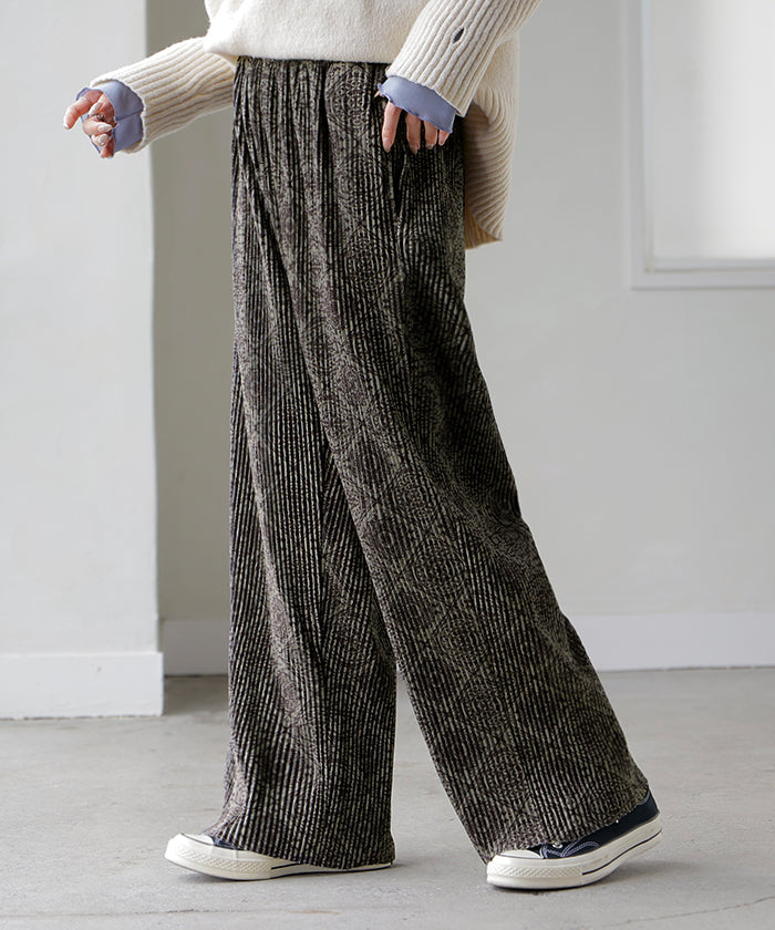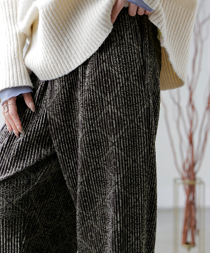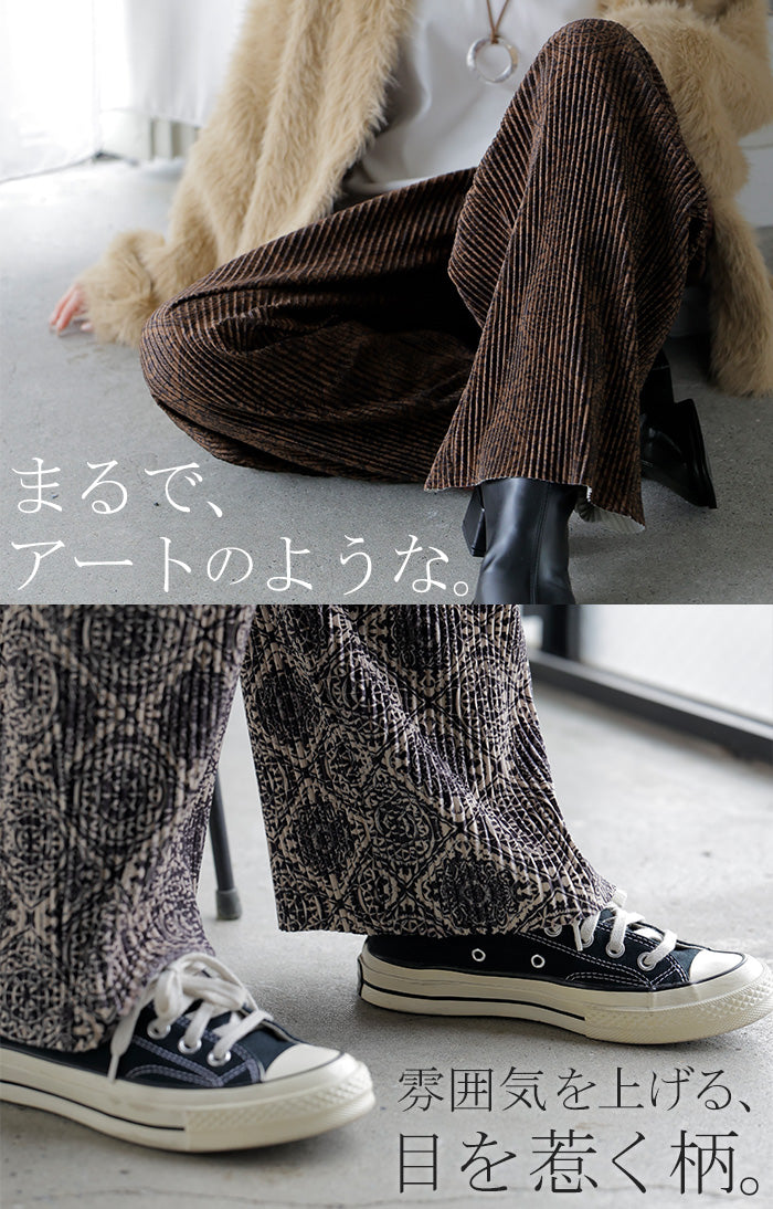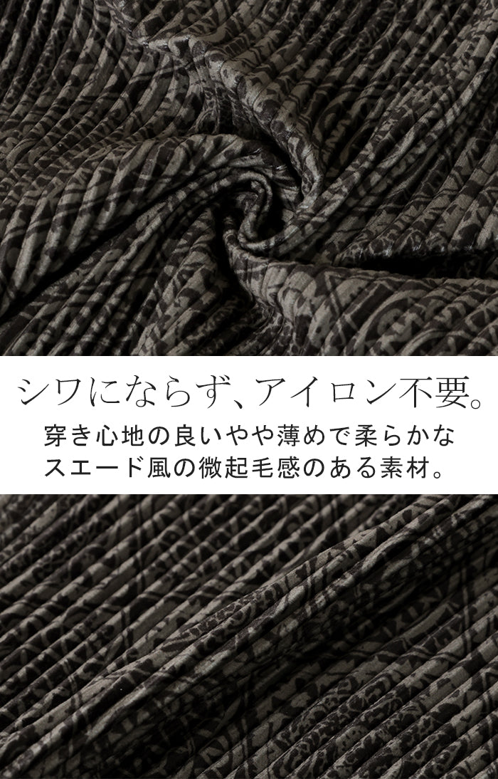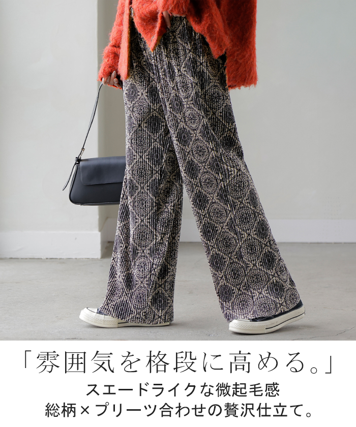 2025AW新作 パンツ ワイド " 切れる " ■1月下旬入荷 総柄 スエードライク レディース ワイドパンツ ロング ロングパンツ ボトムス ボトム 柄 微起毛 プリーツ ストレート ズボン イージーケア ハイウエスト ストレッチ ゆったり 体型カバー 大きいサイズ グレー ベージュ 秋 冬 HUG.U
