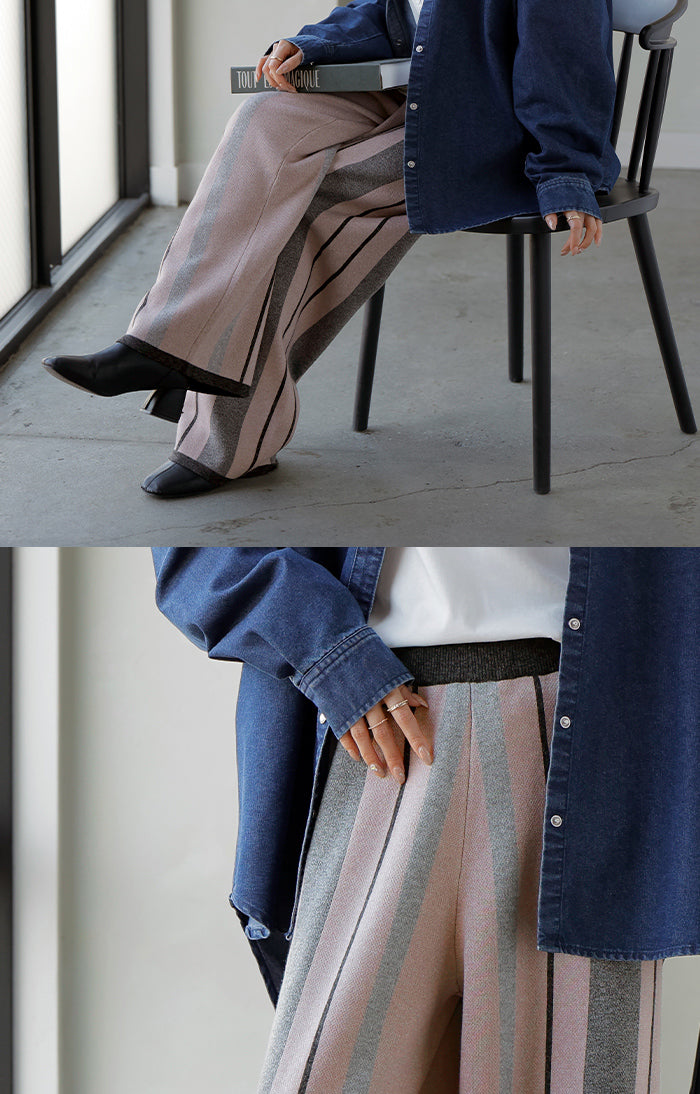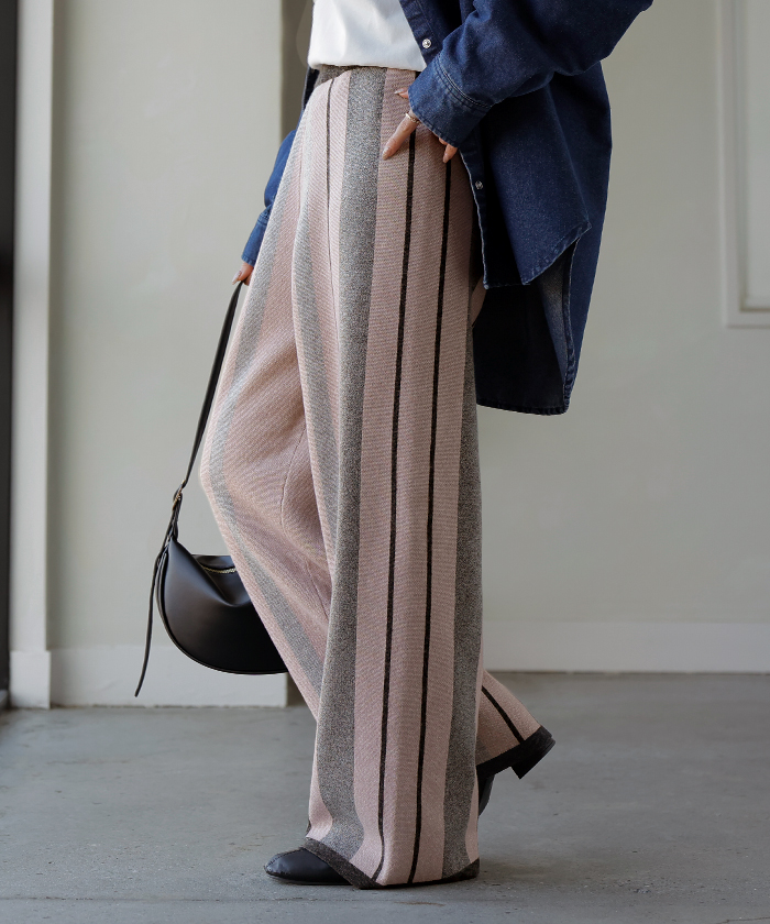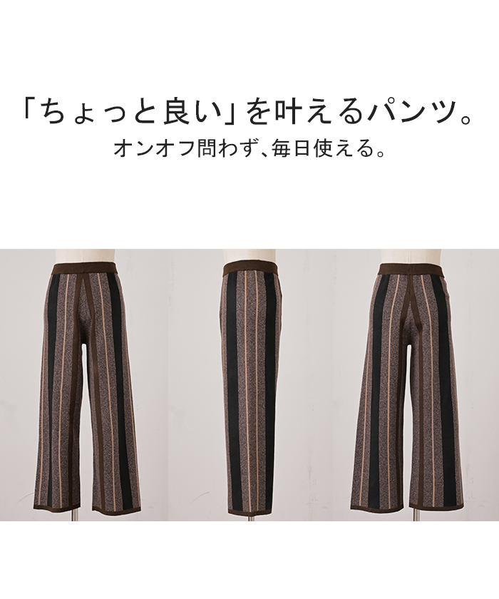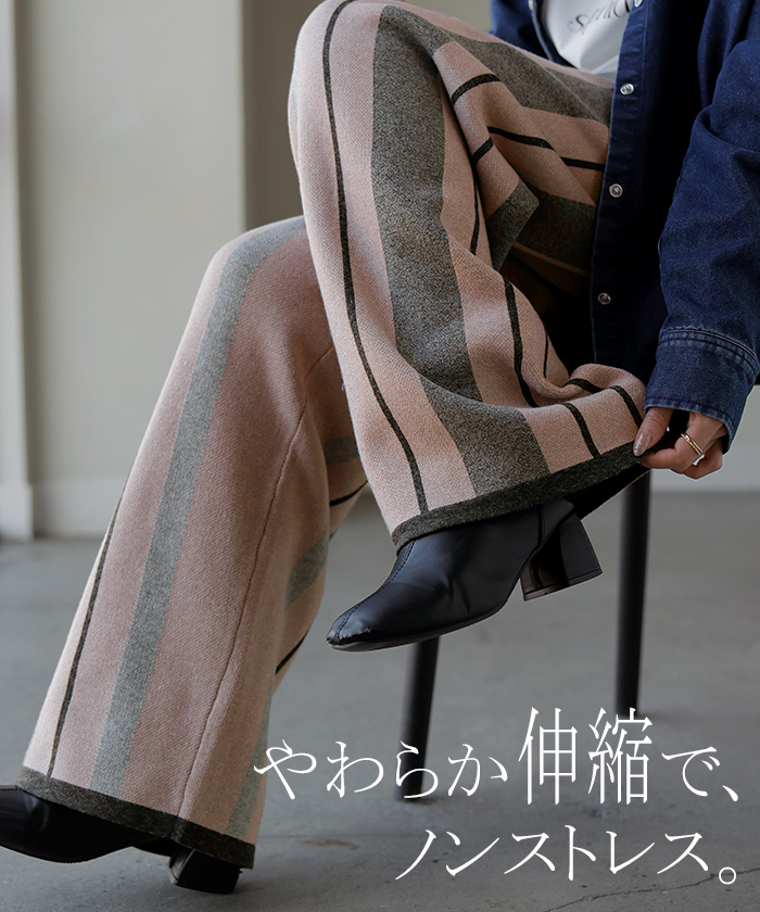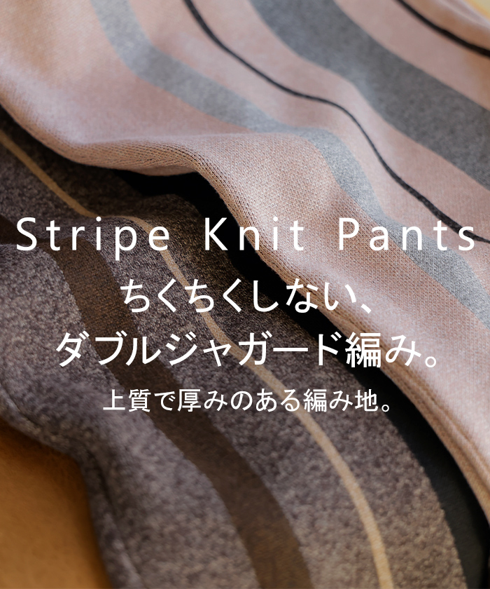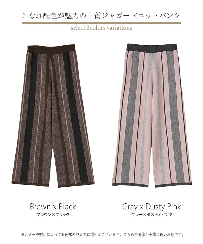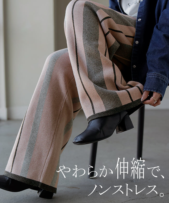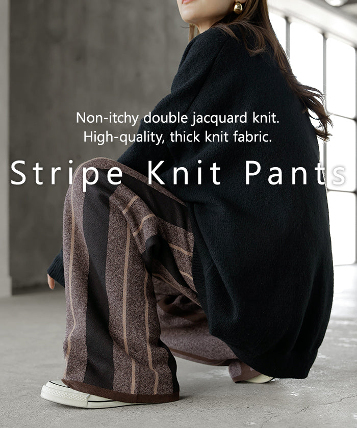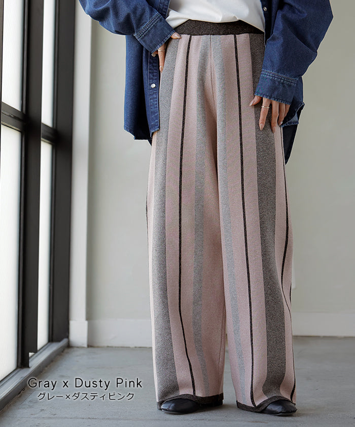 2025AW新作 パンツ ストライプ ■一部1月中旬入荷 ニット ワイド レディース ニットパンツ ダブルジャガード ワイドパンツ ロング ロングパンツ 長い 体型カバー 総柄 ボトムス ボトム ストレート ズボン ゆったり ハイウエスト ストレッチ 美脚 大きいサイズ 黒 グレー 秋 冬 HUG.U
