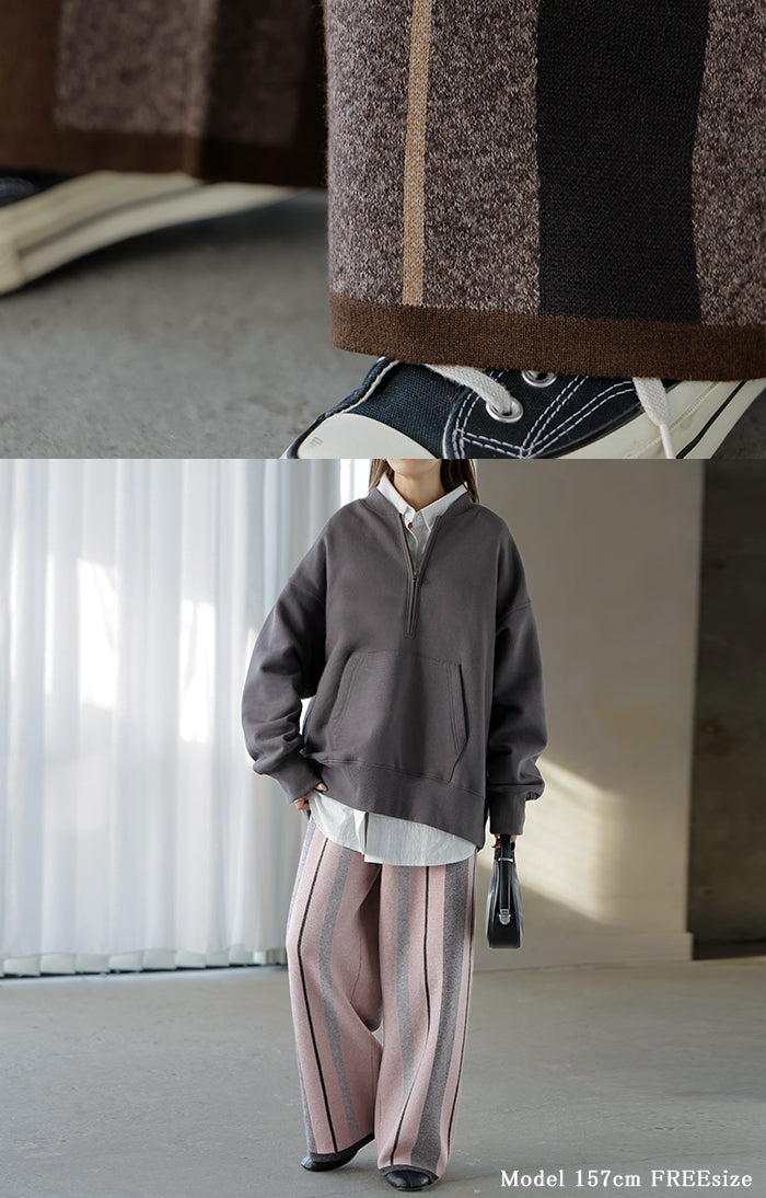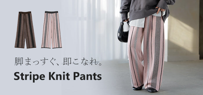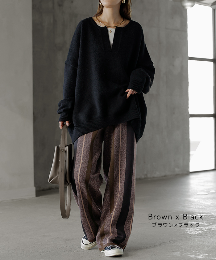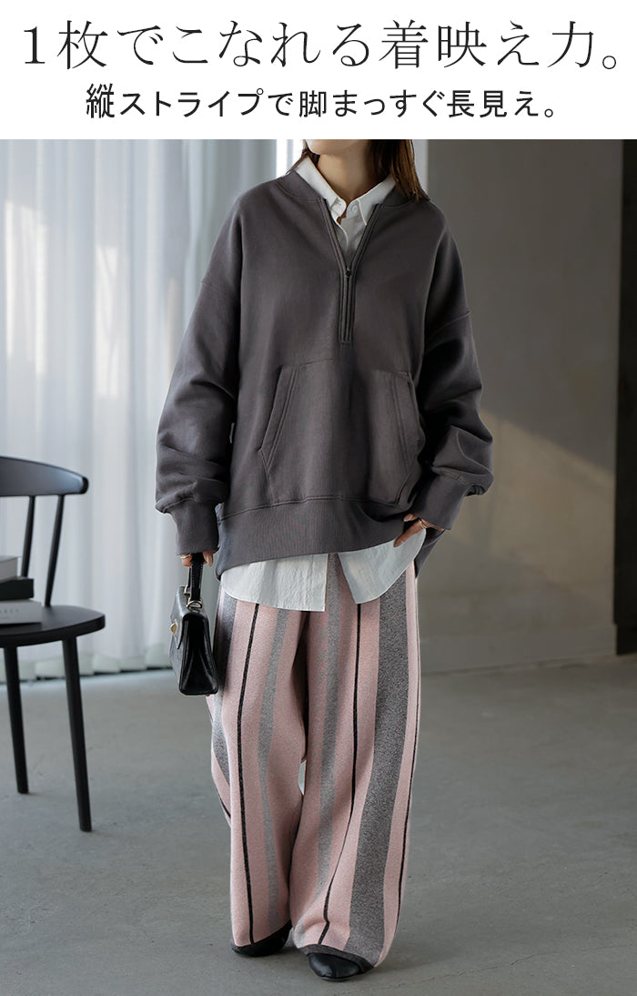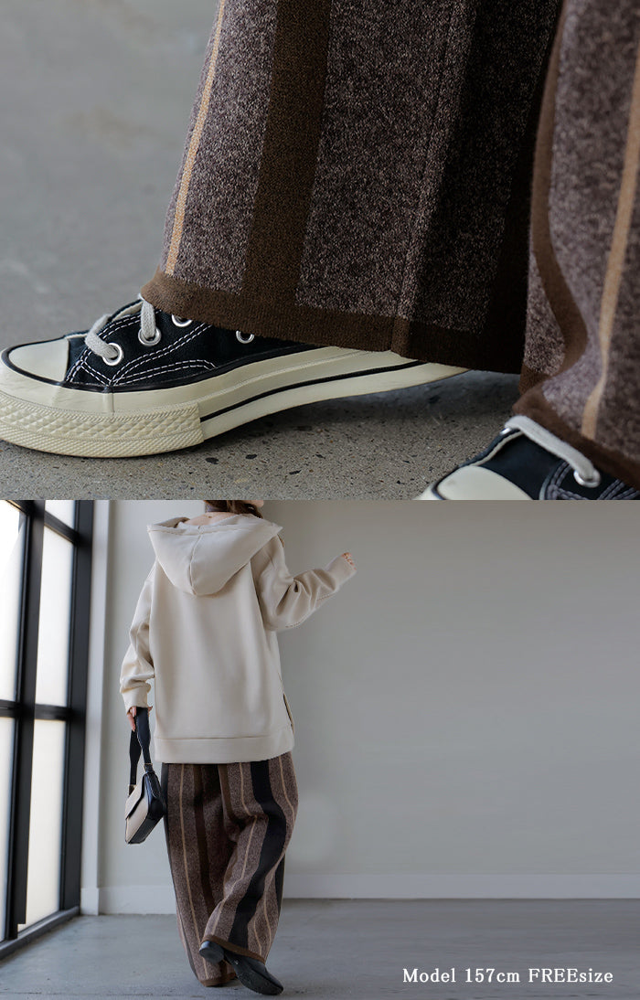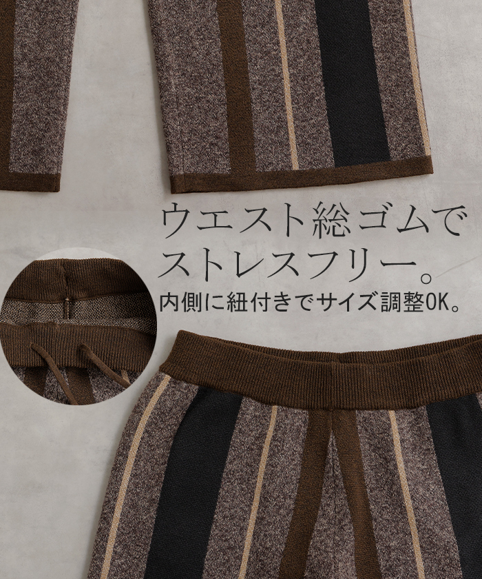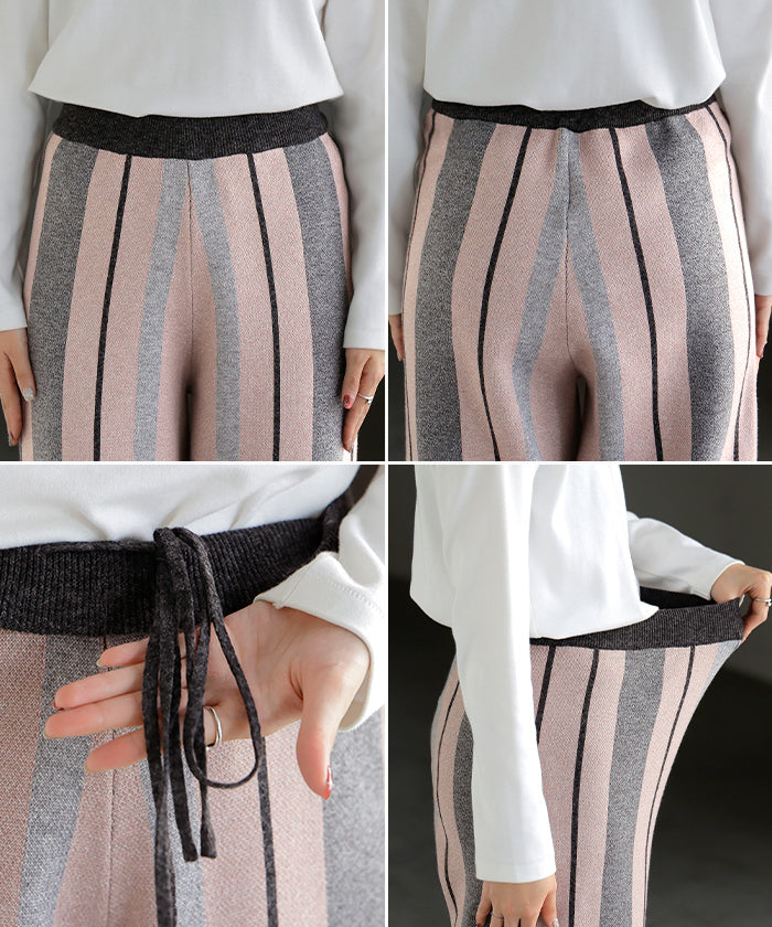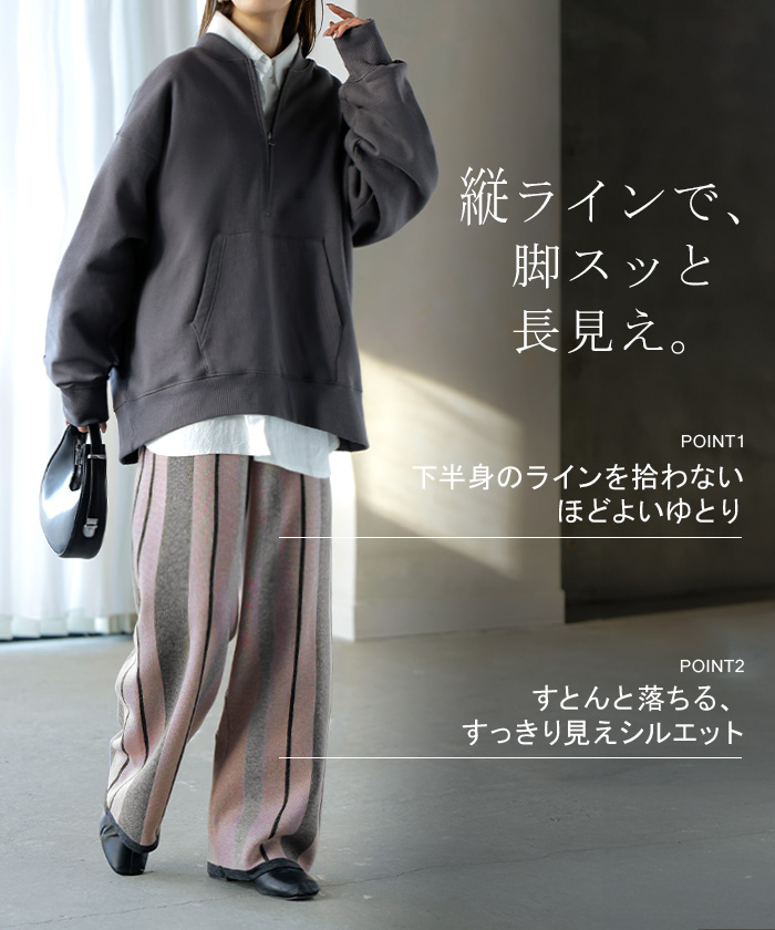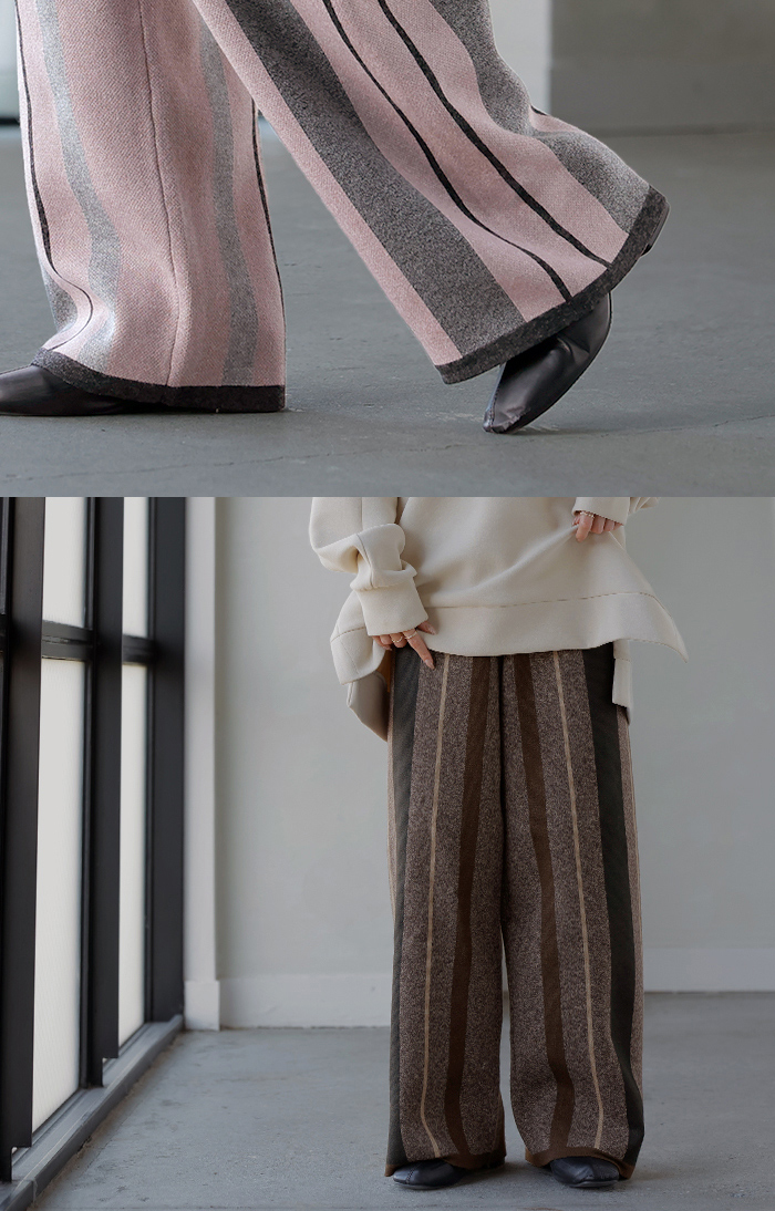 2025AW新作 パンツ ストライプ ■一部1月中旬入荷 ニット ワイド レディース ニットパンツ ダブルジャガード ワイドパンツ ロング ロングパンツ 長い 体型カバー 総柄 ボトムス ボトム ストレート ズボン ゆったり ハイウエスト ストレッチ 美脚 大きいサイズ 黒 グレー 秋 冬 HUG.U