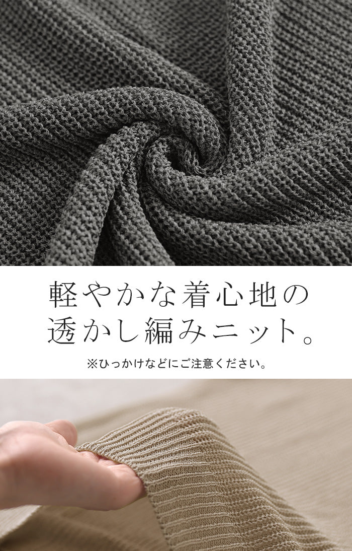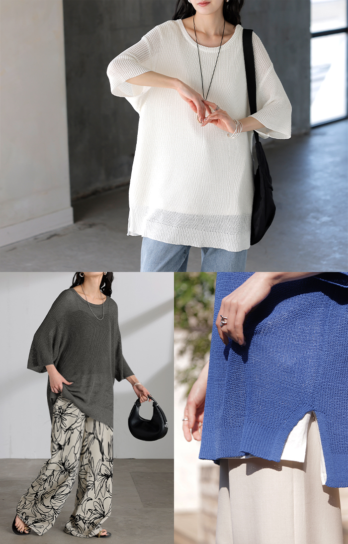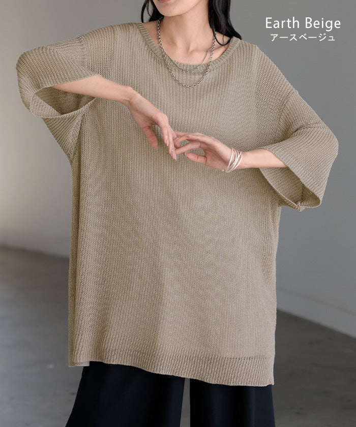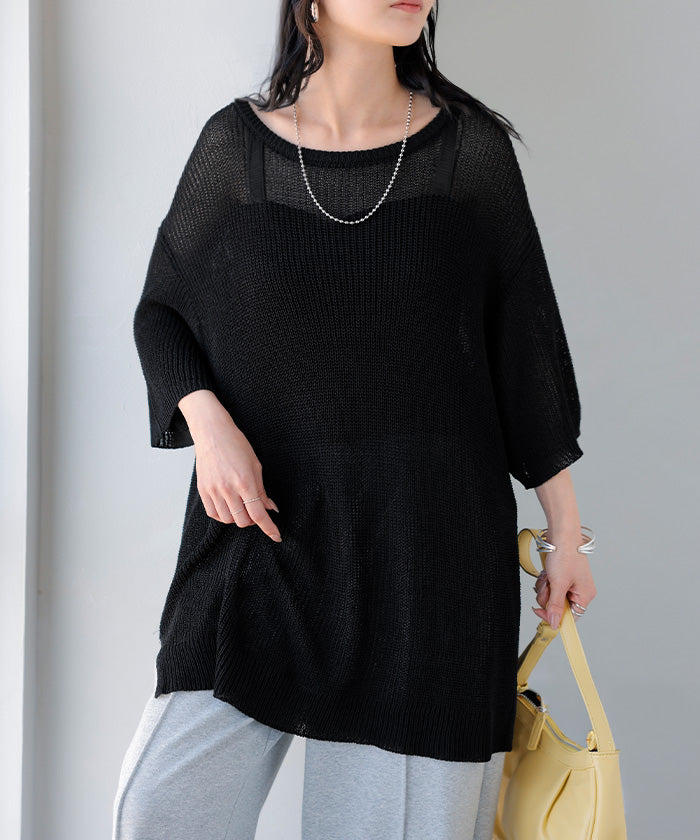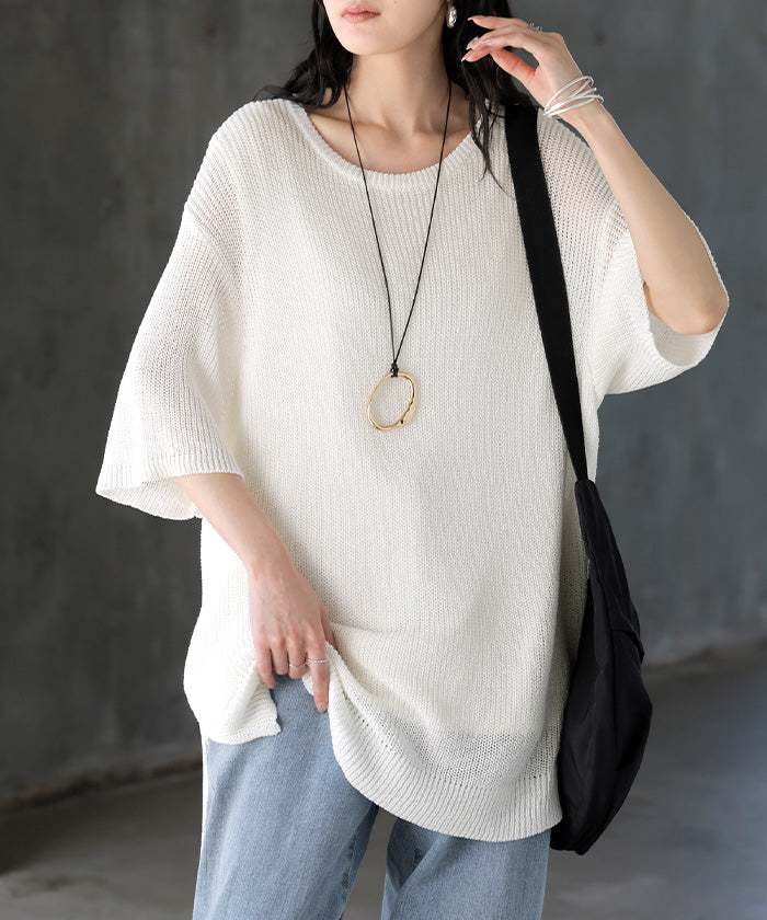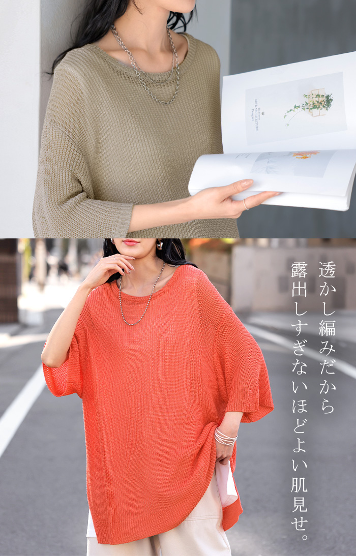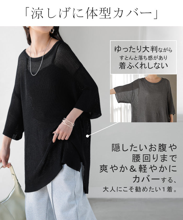 2026SS新作 サマーニット 透かし編み プルオーバー ルーズ レディース トップス ニット セーター オーバー ロング メッシュ チュニック 透け リネン風 軽い 半袖 五分袖 七分袖 チクチクしない 体型カバー 大きいサイズ ゆったり きれいめ カジュアル 黒 白 春 夏 HUG.U