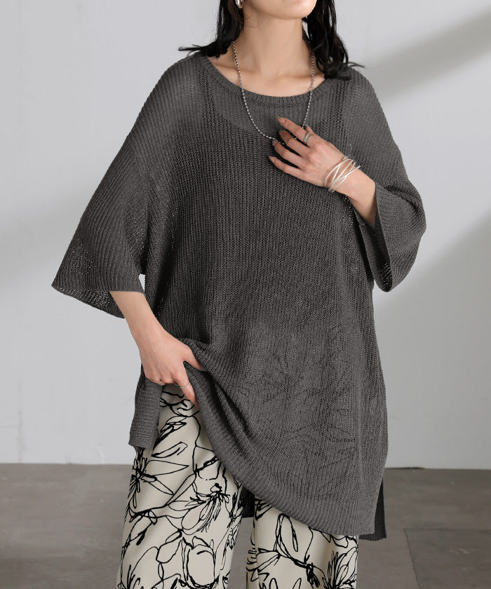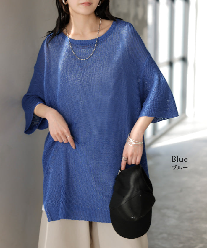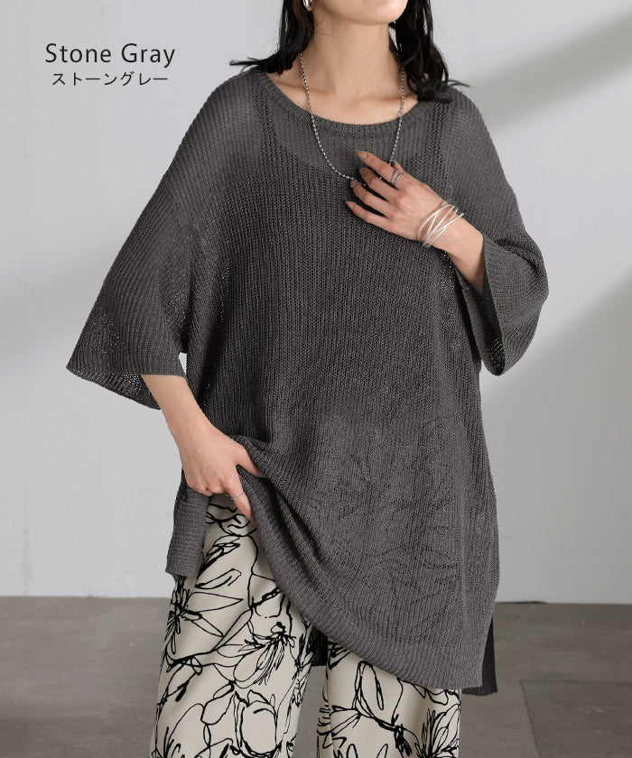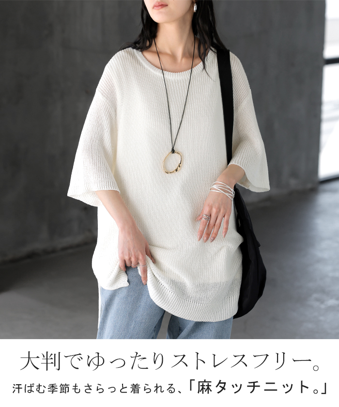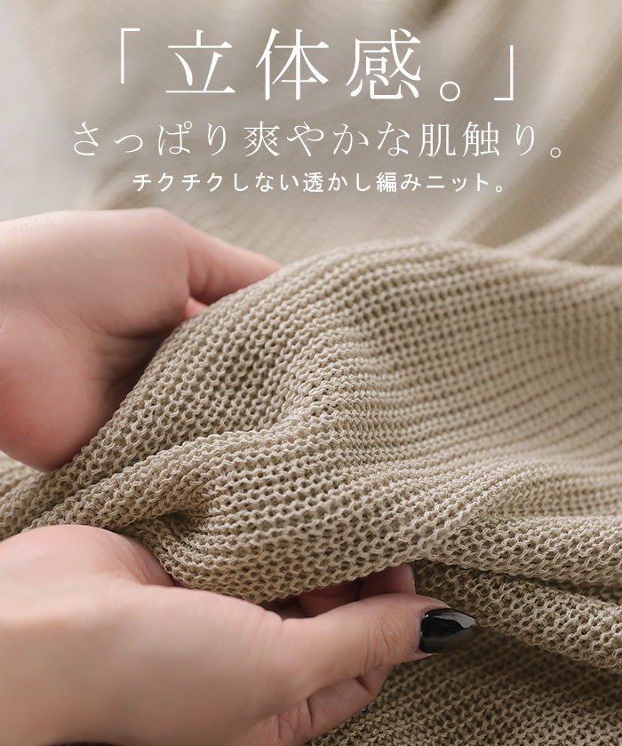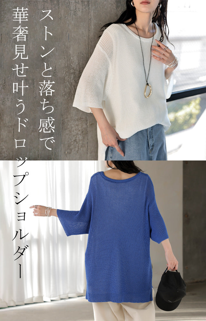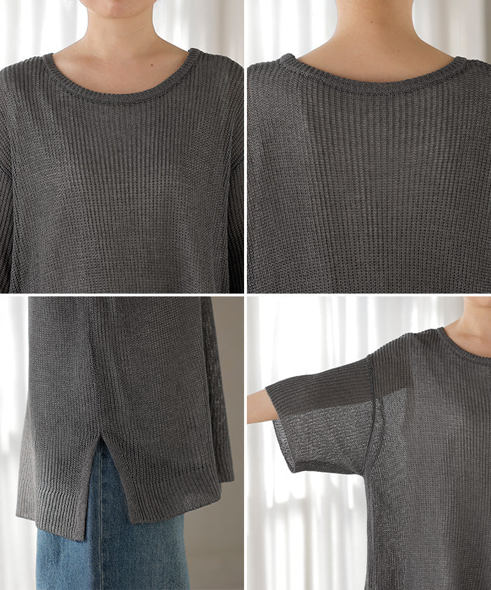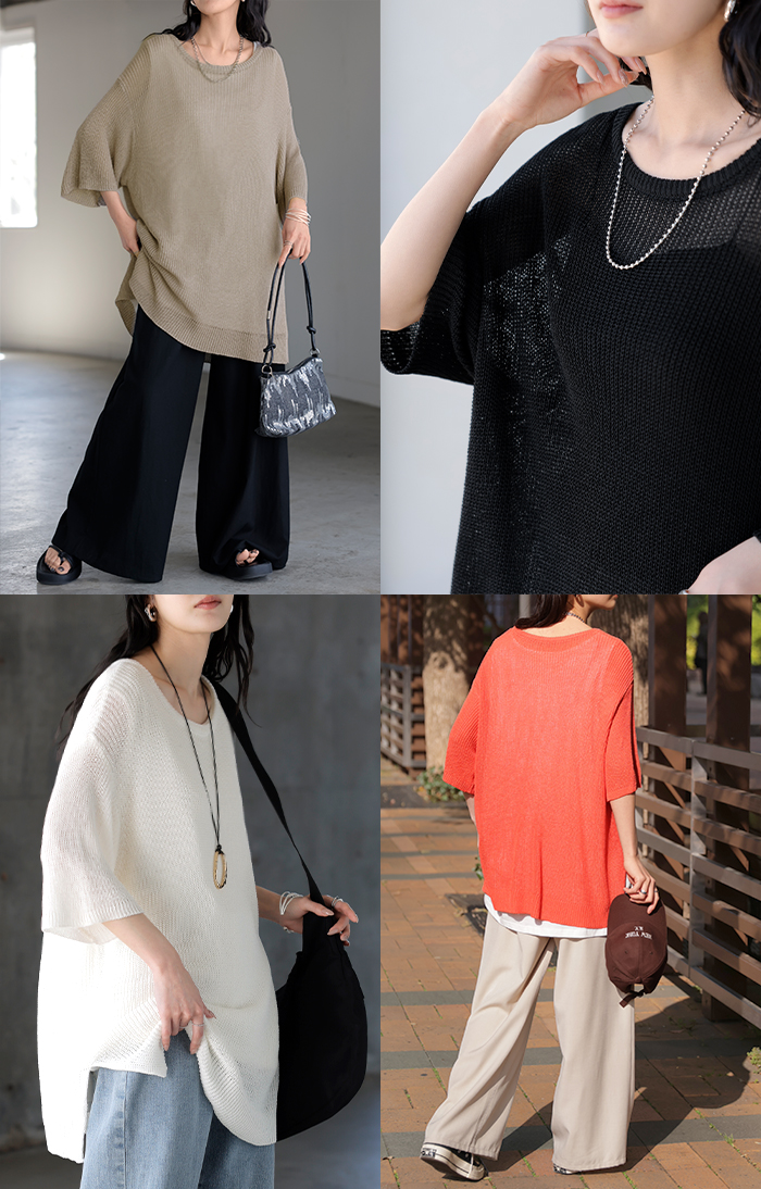 2026SS新作 サマーニット 透かし編み プルオーバー ルーズ レディース トップス ニット セーター オーバー ロング メッシュ チュニック 透け リネン風 軽い 半袖 五分袖 七分袖 チクチクしない 体型カバー 大きいサイズ ゆったり きれいめ カジュアル 黒 白 春 夏 HUG.U