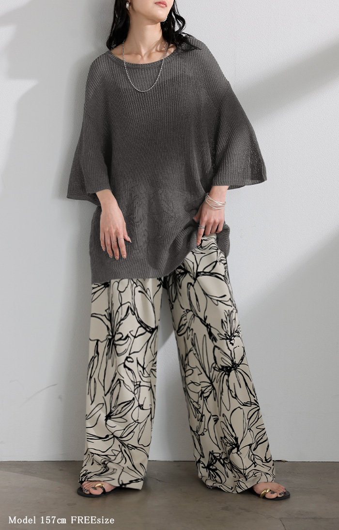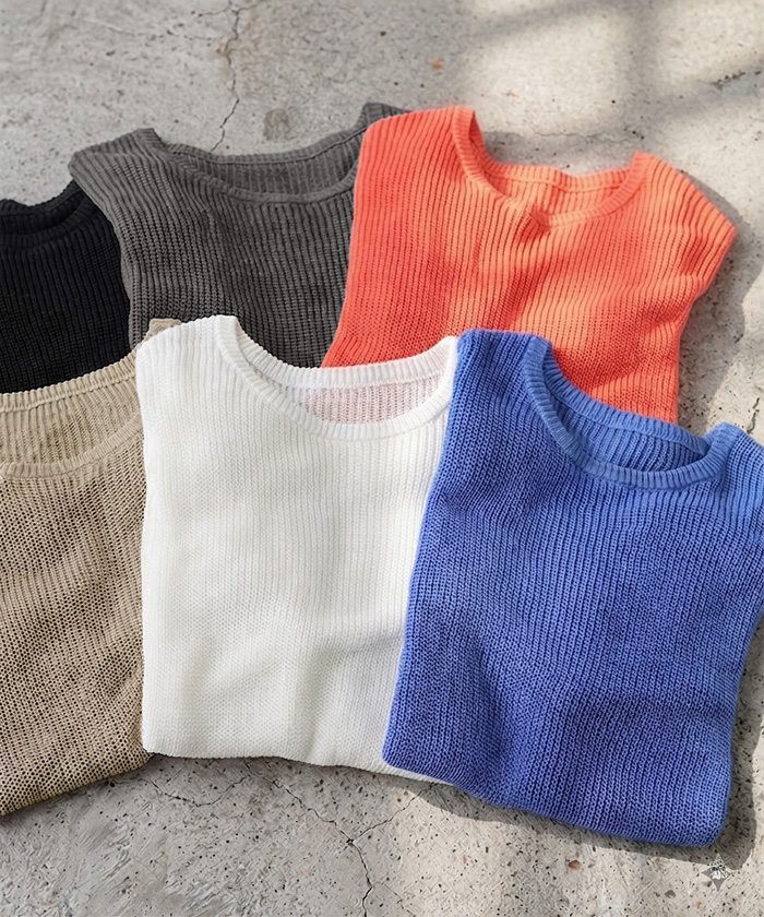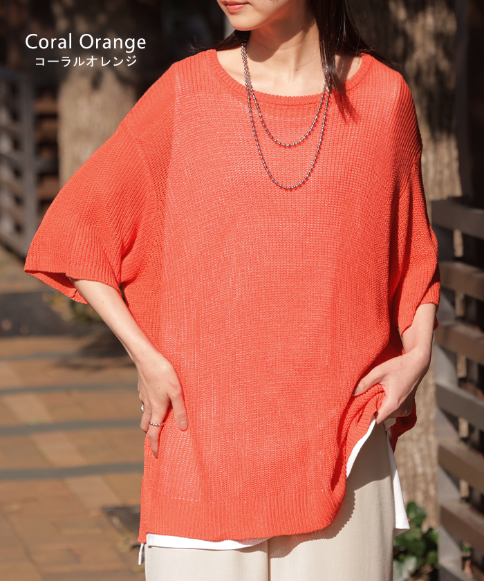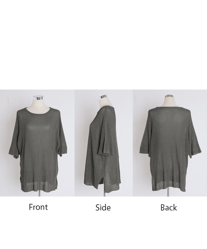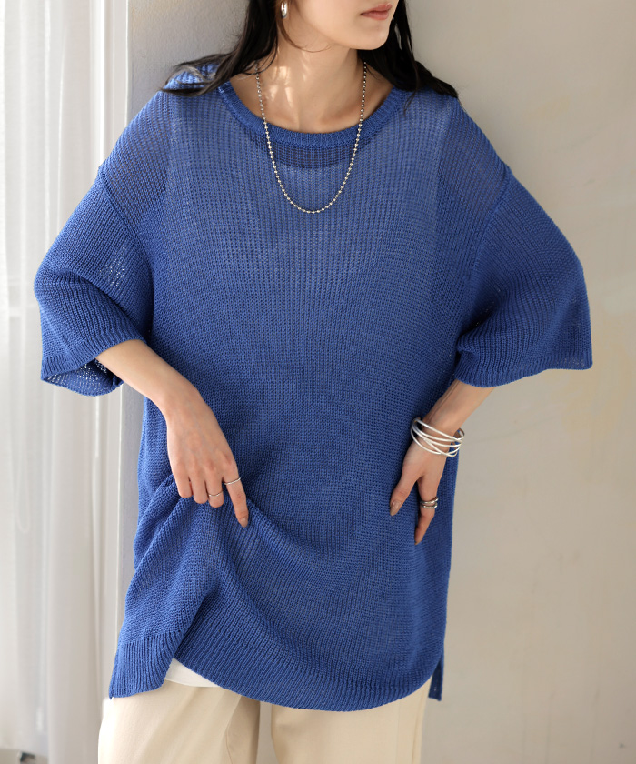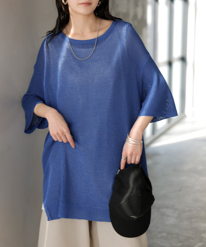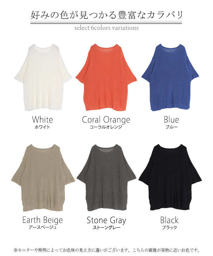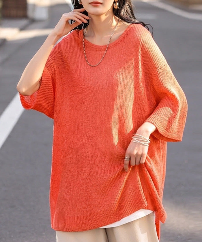 2026SS新作 サマーニット 透かし編み プルオーバー ルーズ レディース トップス ニット セーター オーバー ロング メッシュ チュニック 透け リネン風 軽い 半袖 五分袖 七分袖 チクチクしない 体型カバー 大きいサイズ ゆったり きれいめ カジュアル 黒 白 春 夏 HUG.U