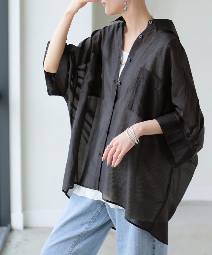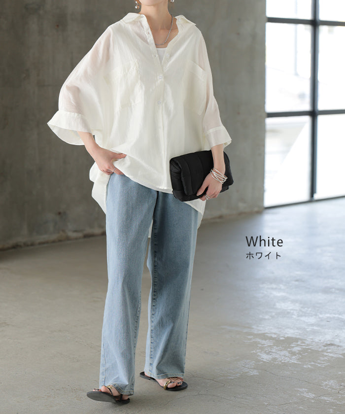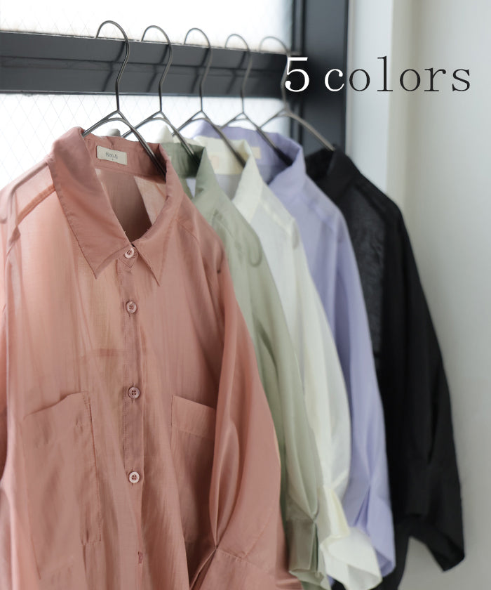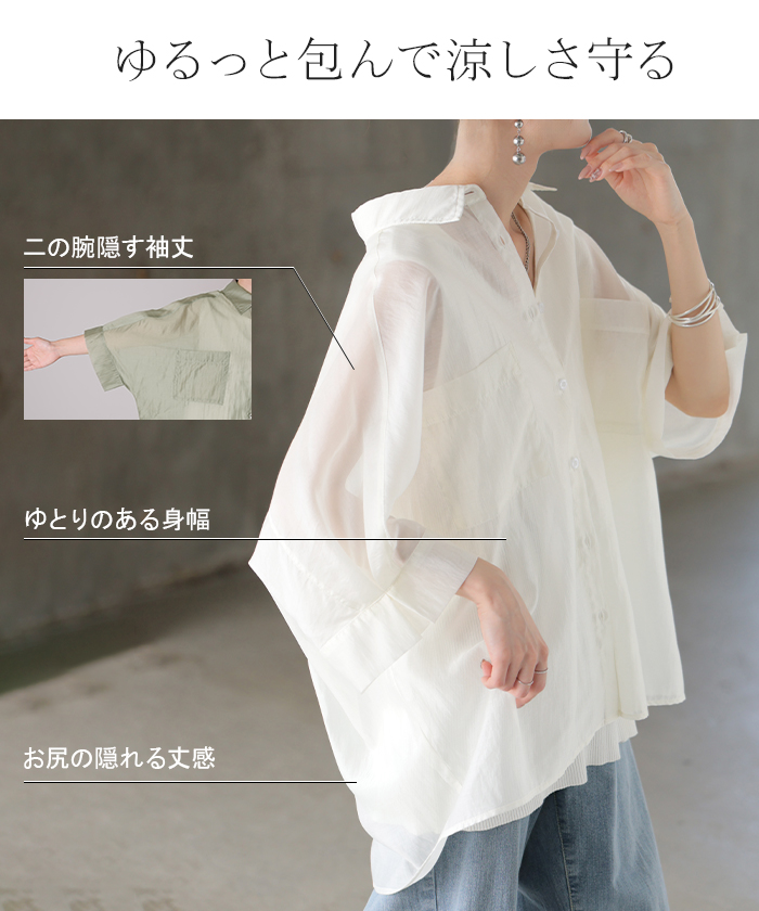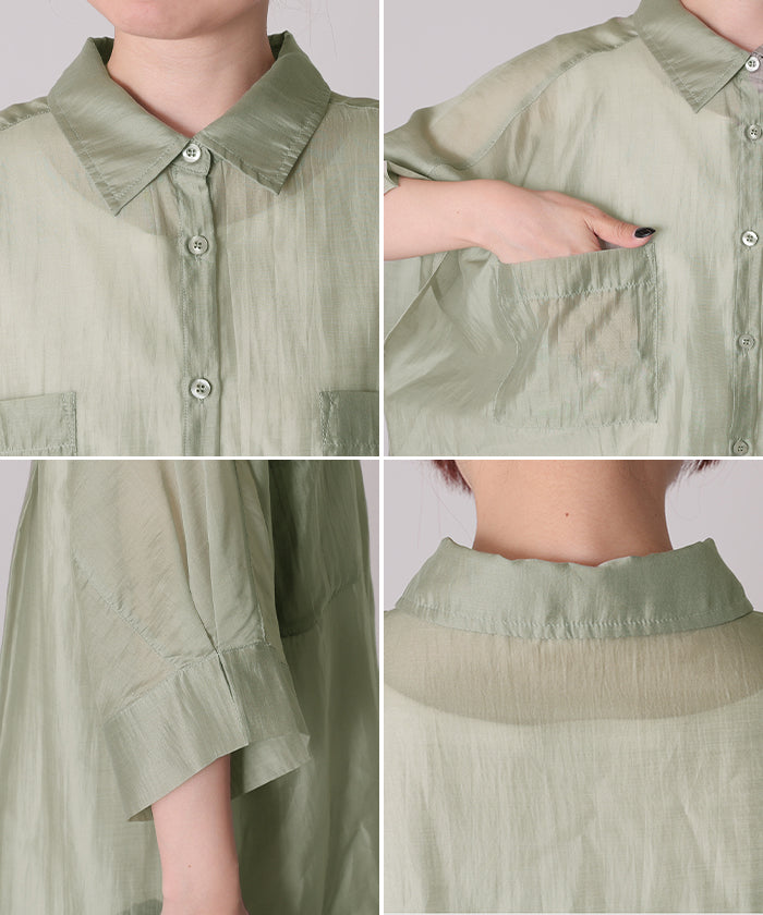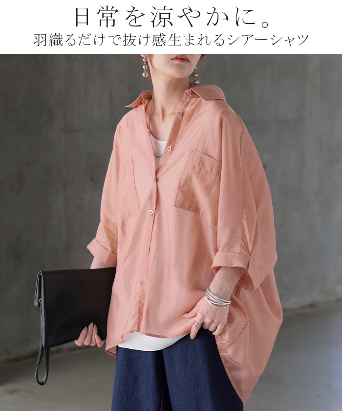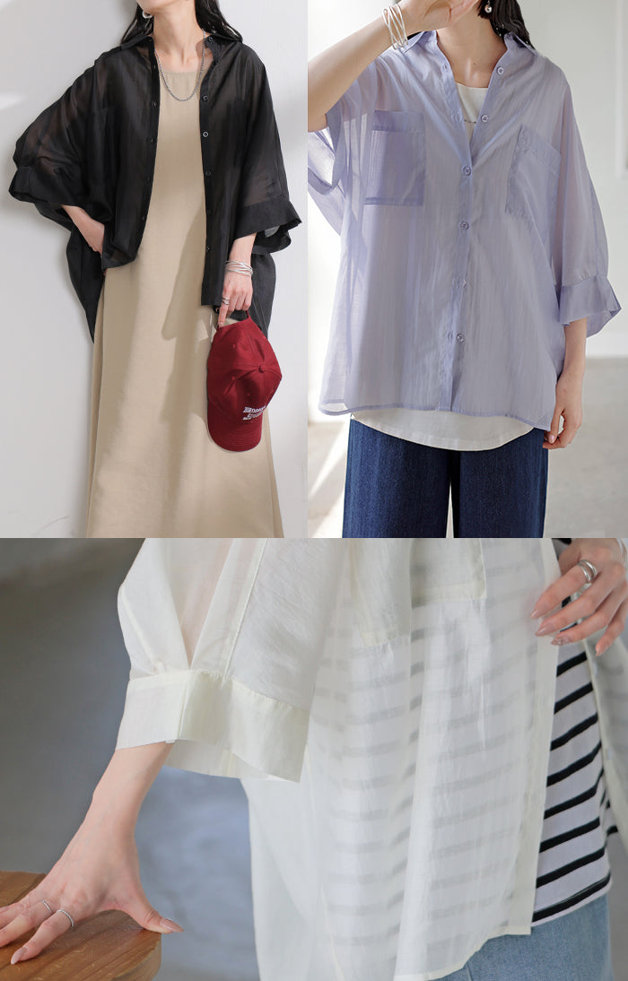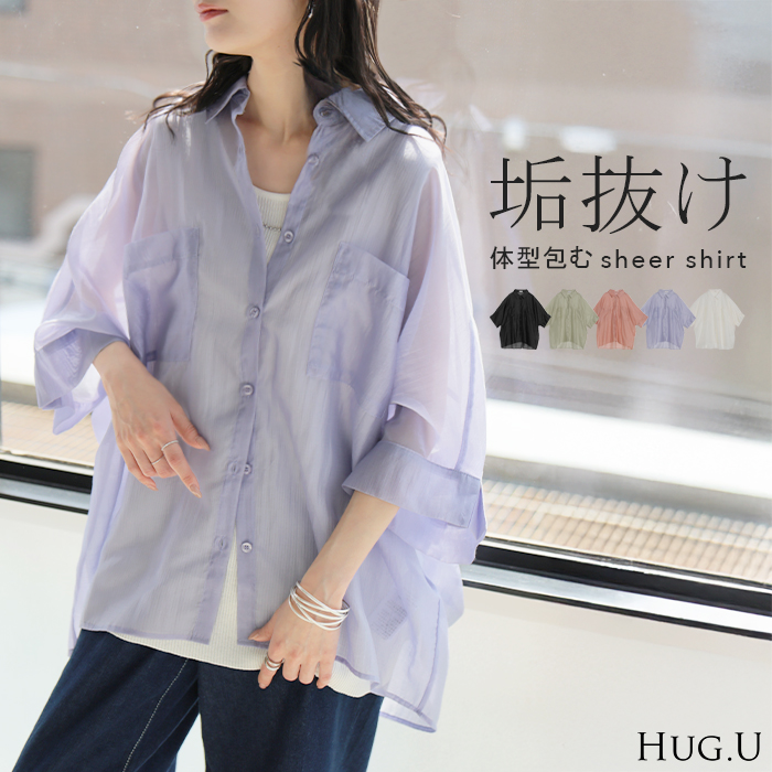 2026SS新作 シャツ シアー ブラウス ■5月中旬入荷 レディース トップス ロング アウター シアーシャツ 透け感 バンドカラー 前開き シースルー 軽い 半袖 五分袖 七分袖 羽織 ライトアウター 二の腕カバー 体型カバー お尻が隠れる 大きいサイズ ゆったり きれいめ 黒 白 春 夏 HUG.U メール便
