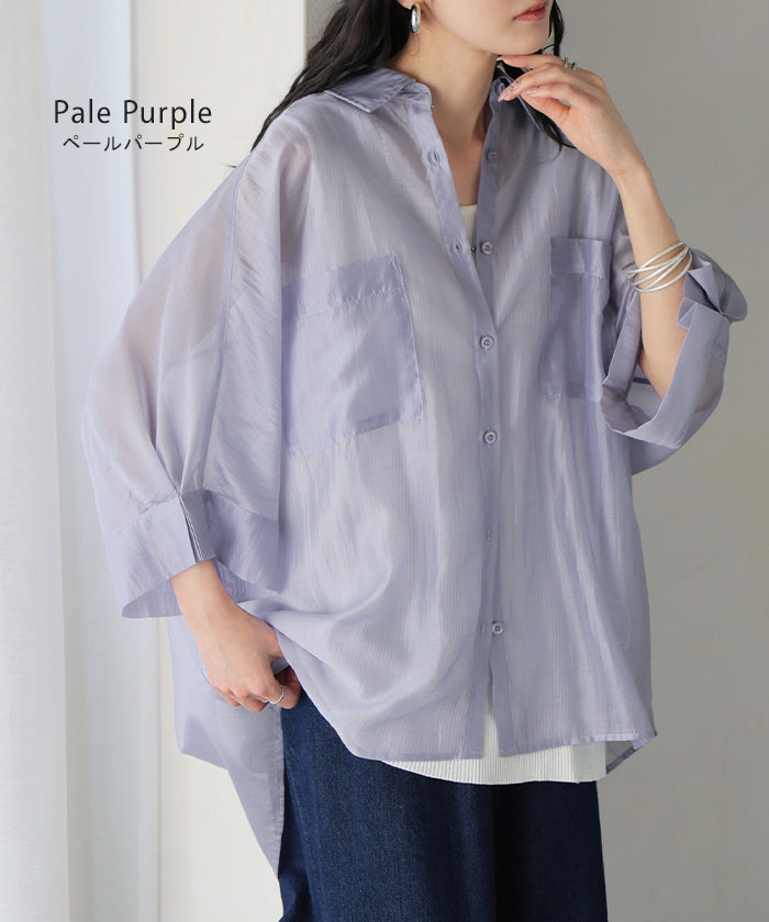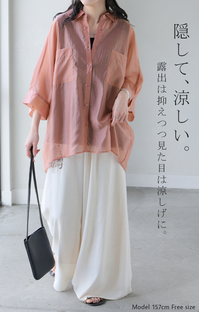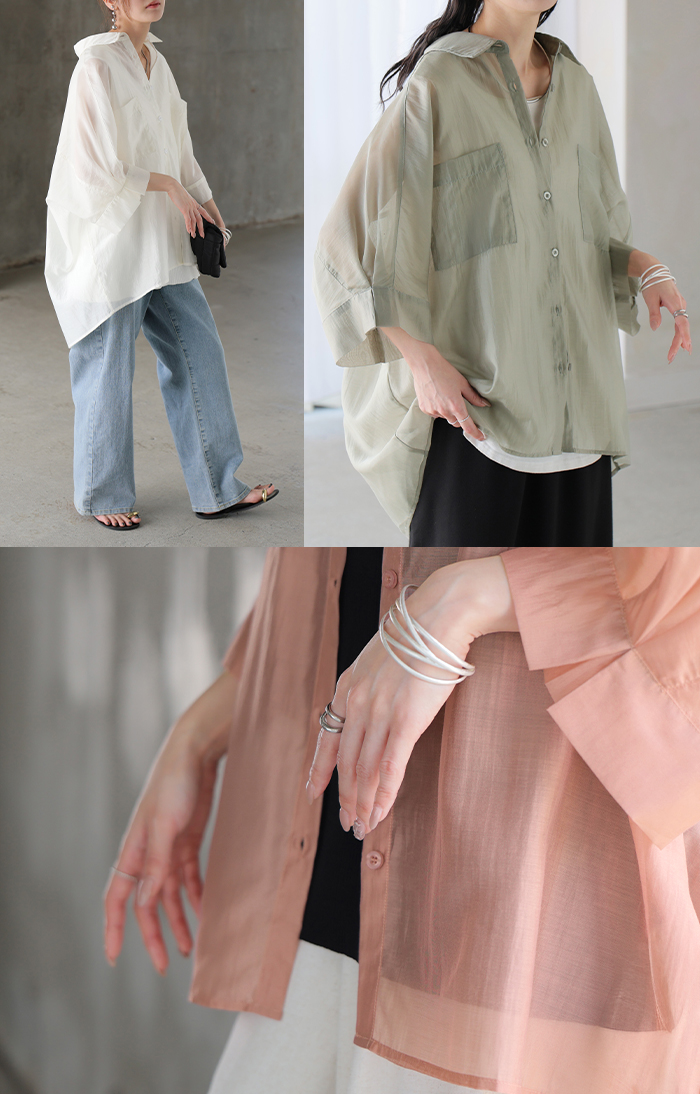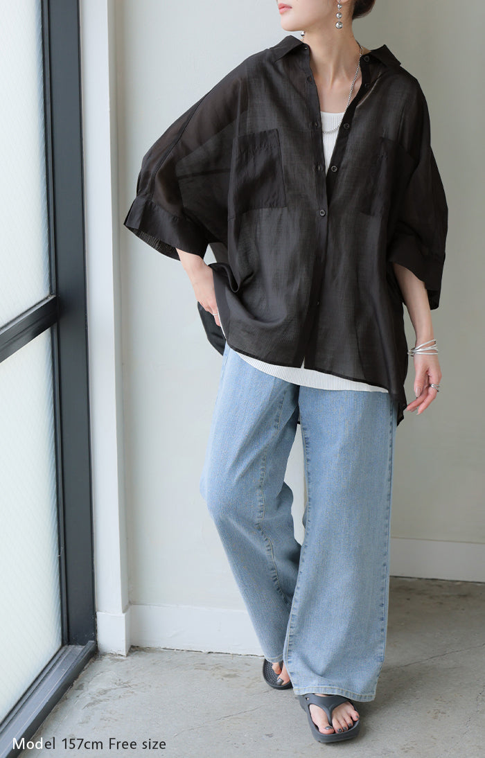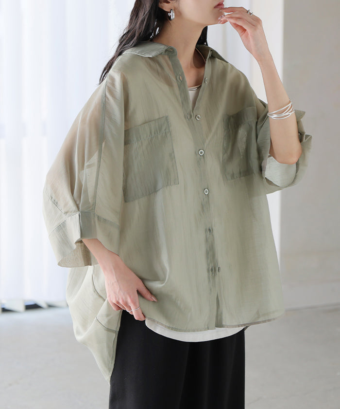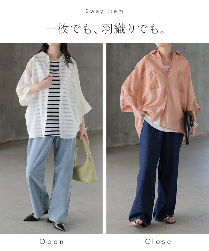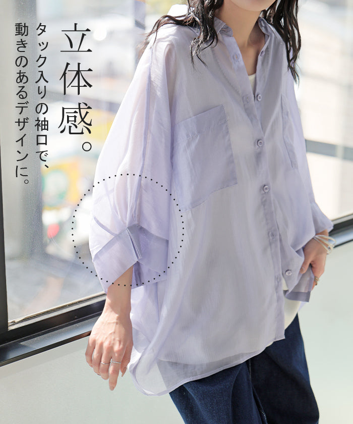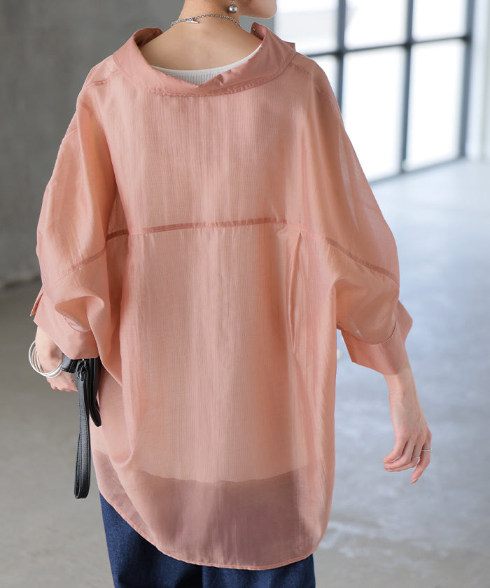 2026SS新作 シャツ シアー ブラウス ■5月中旬入荷 レディース トップス ロング アウター シアーシャツ 透け感 バンドカラー 前開き シースルー 軽い 半袖 五分袖 七分袖 羽織 ライトアウター 二の腕カバー 体型カバー お尻が隠れる 大きいサイズ ゆったり きれいめ 黒 白 春 夏 HUG.U メール便