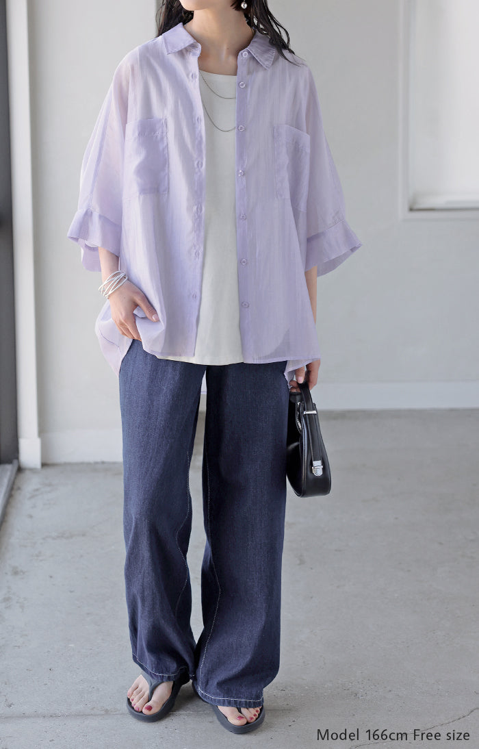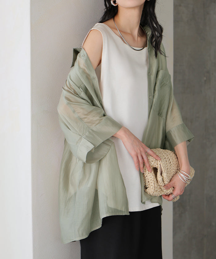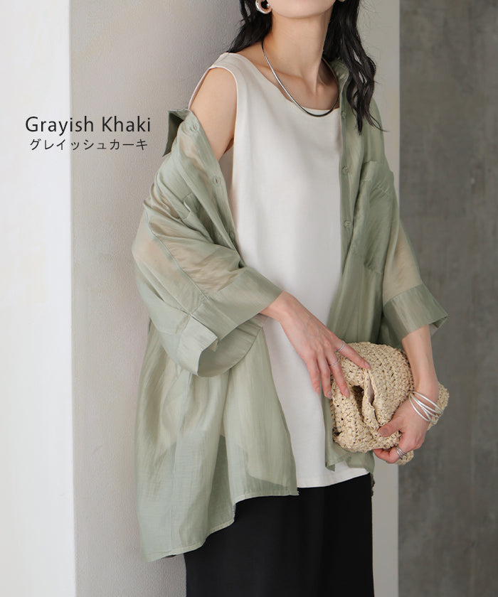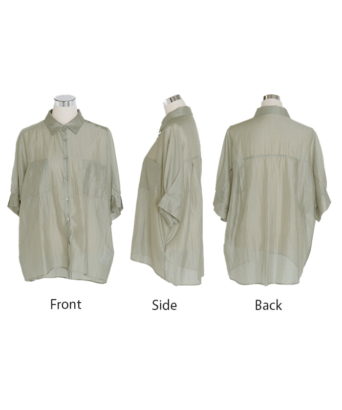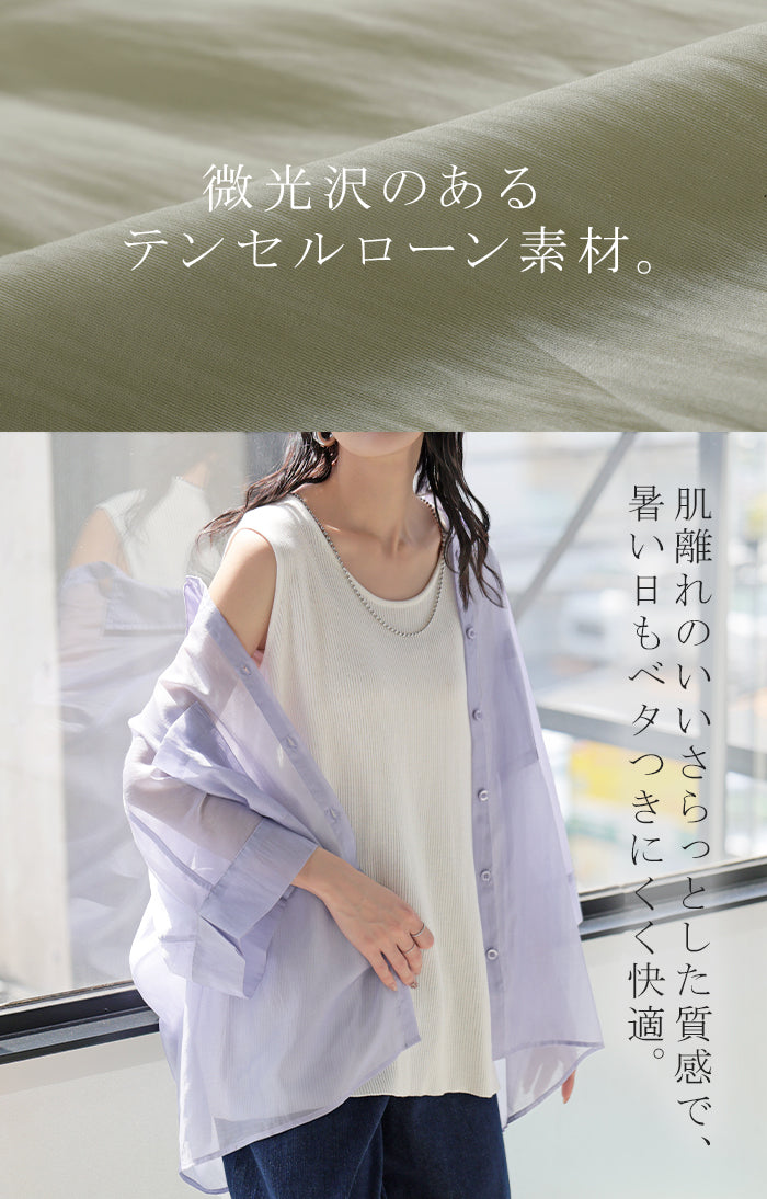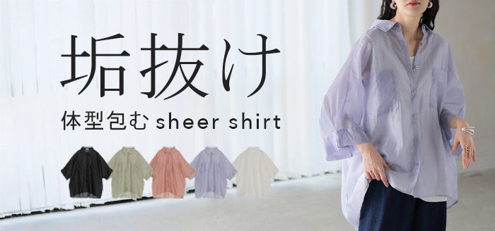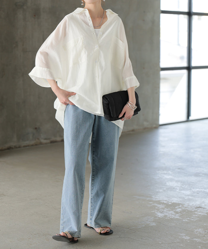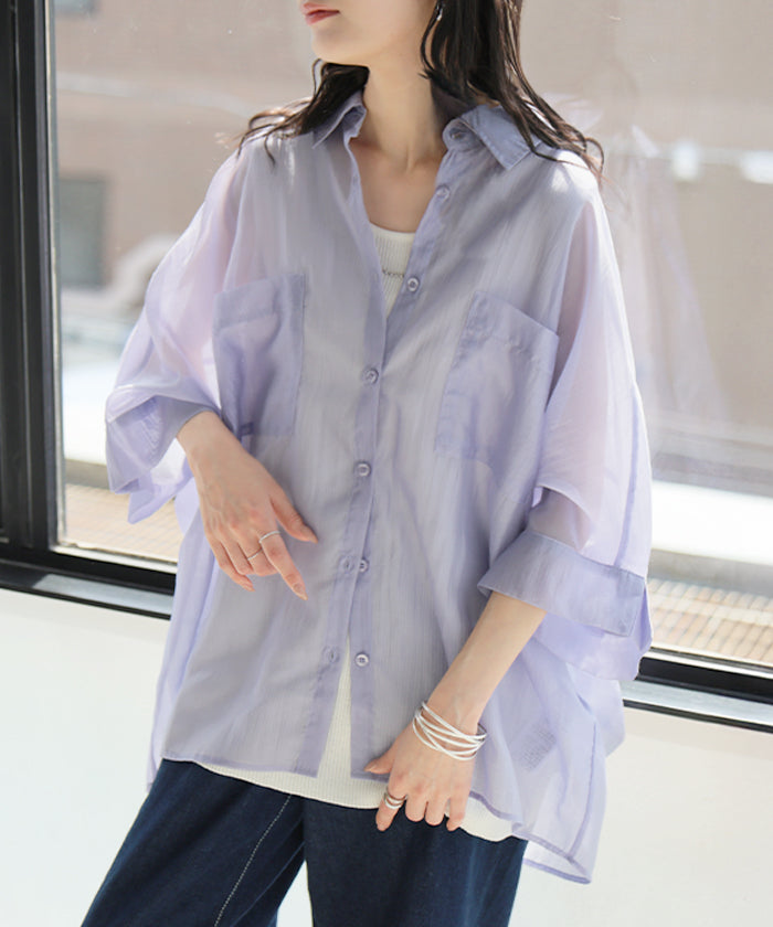 2026SS新作 シャツ シアー ブラウス ■5月中旬入荷 レディース トップス ロング アウター シアーシャツ 透け感 バンドカラー 前開き シースルー 軽い 半袖 五分袖 七分袖 羽織 ライトアウター 二の腕カバー 体型カバー お尻が隠れる 大きいサイズ ゆったり きれいめ 黒 白 春 夏 HUG.U メール便
