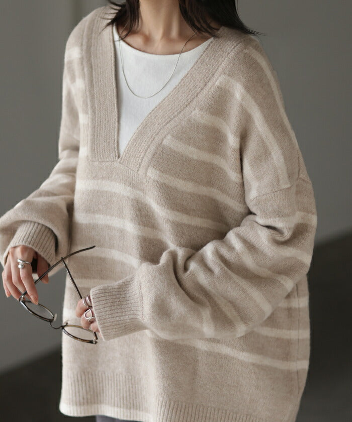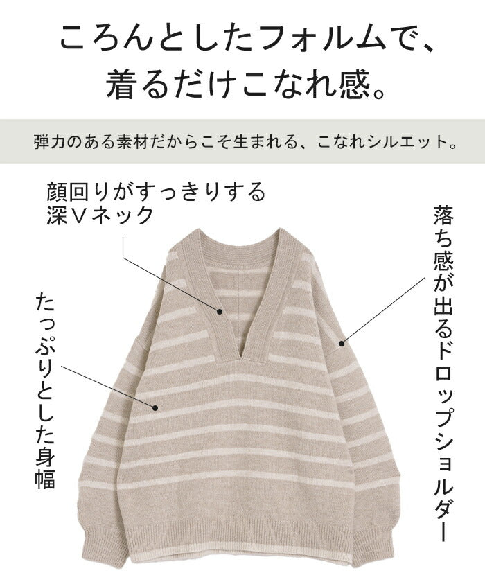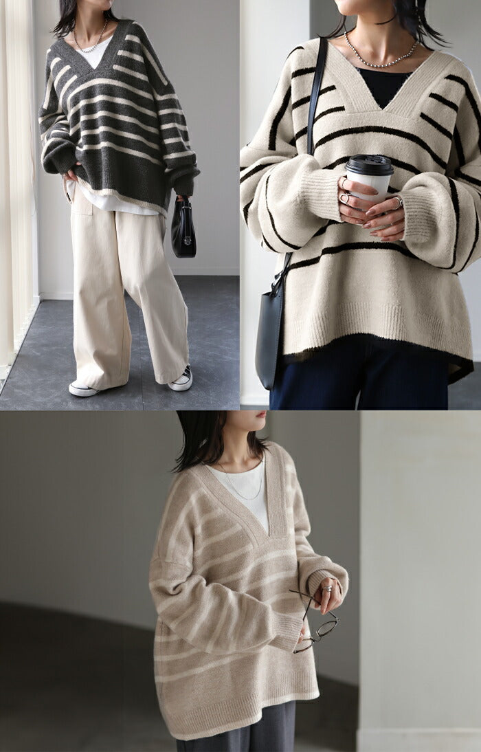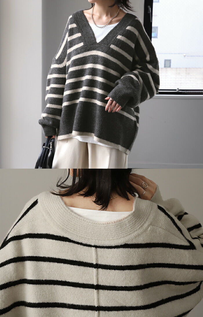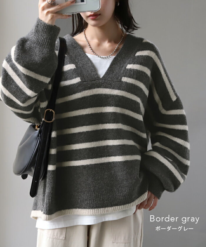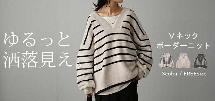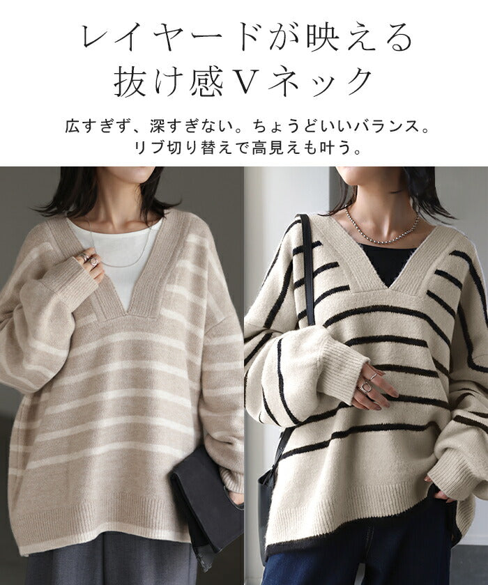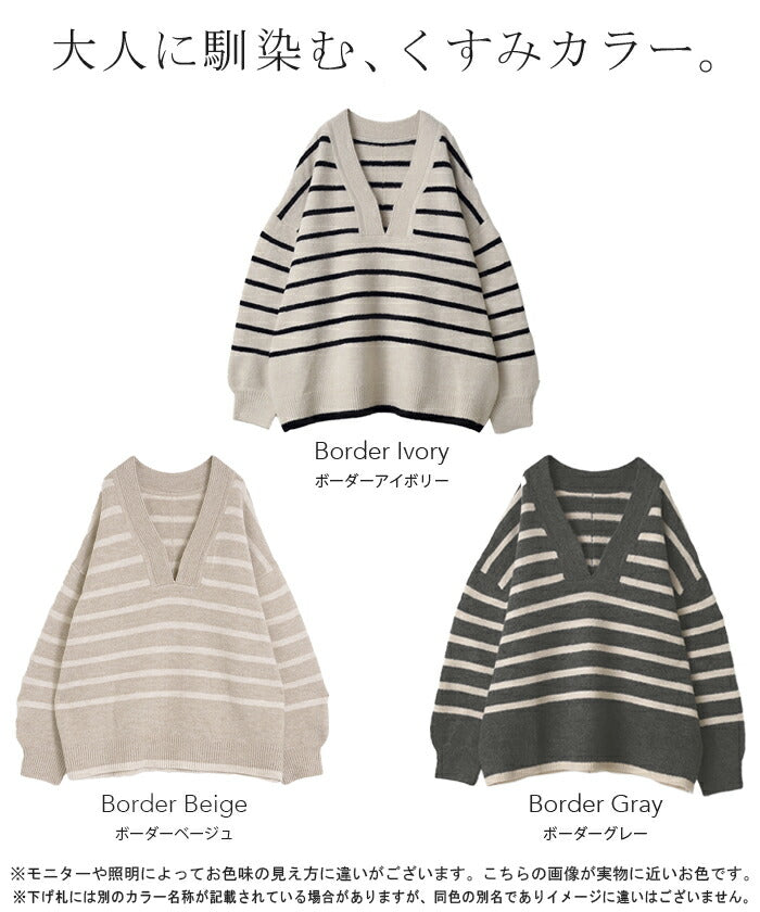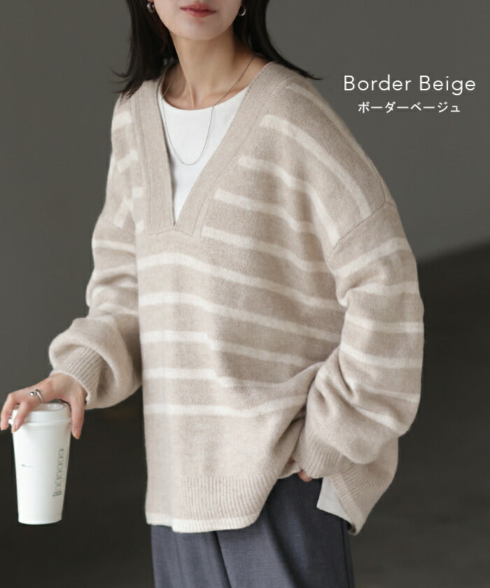ざっくり開いた深めのVネックがポイントのボーダーニットです。インナー次第で印象が変わりレイヤードコーデも楽しんでいただけます。定番のボーダーと流行の深Vのデザインで人と被らないデザインです。※下げ札には別のカラー名称が記載されている場合がありますが、同色の別名でありイメージに違いはございません。