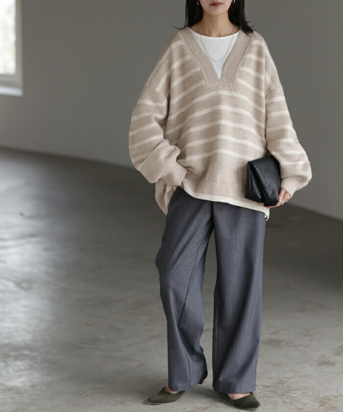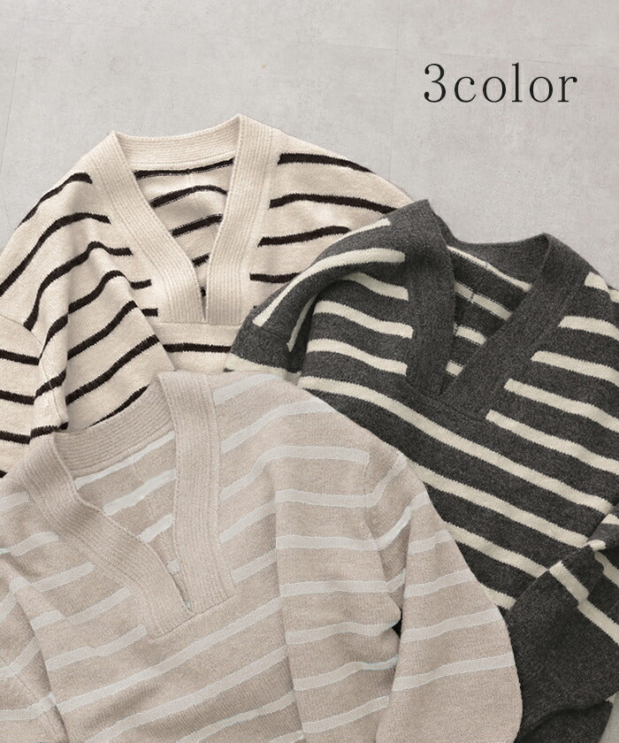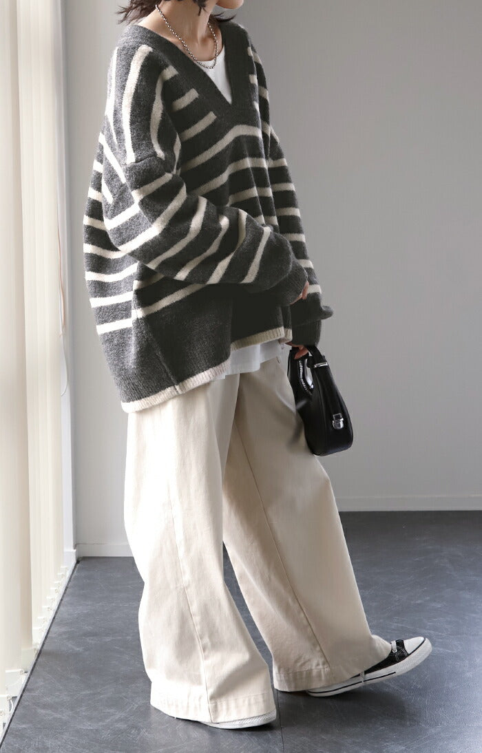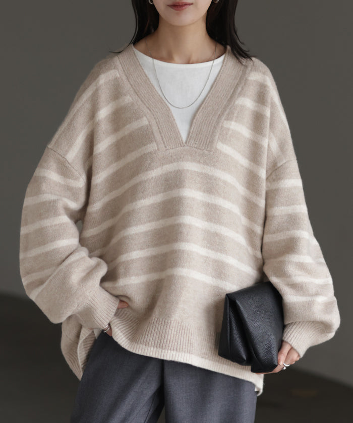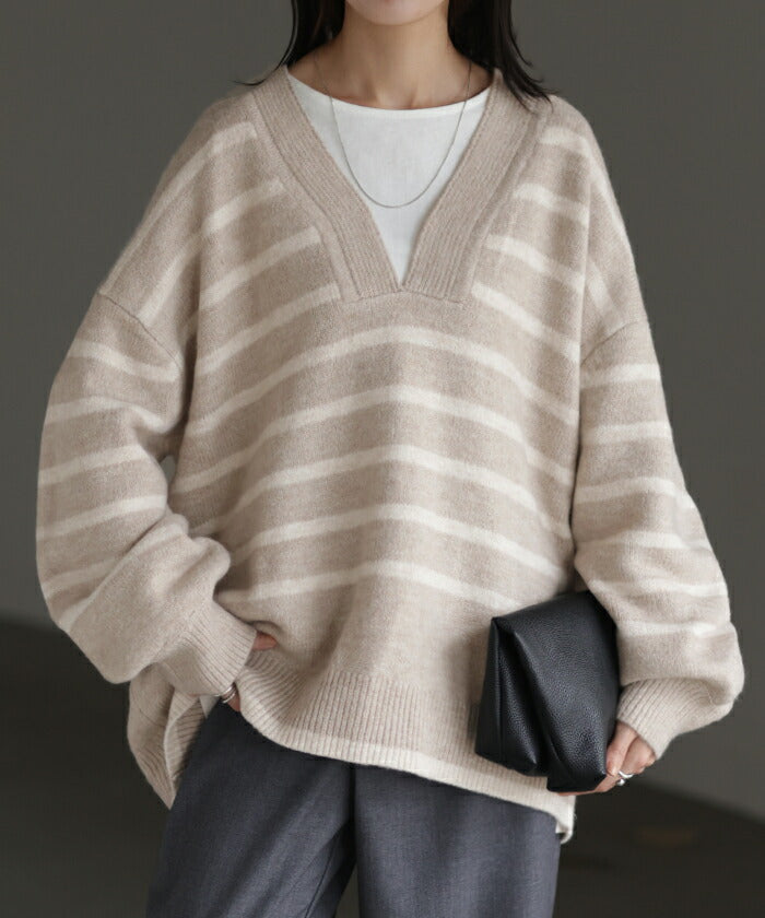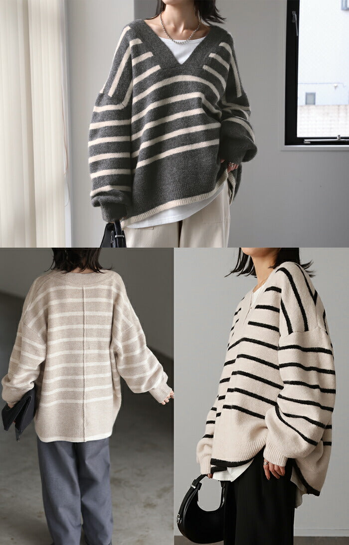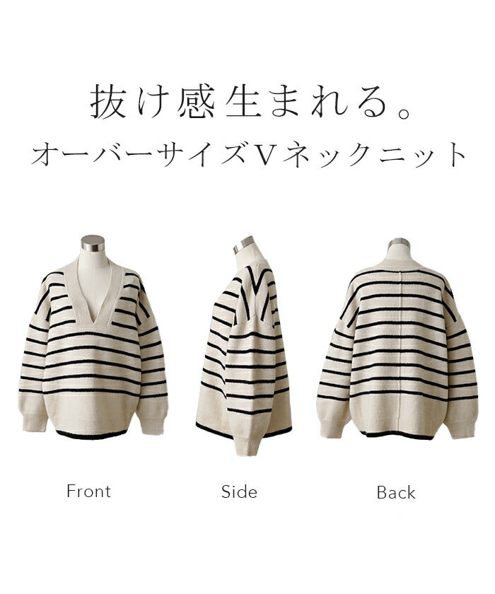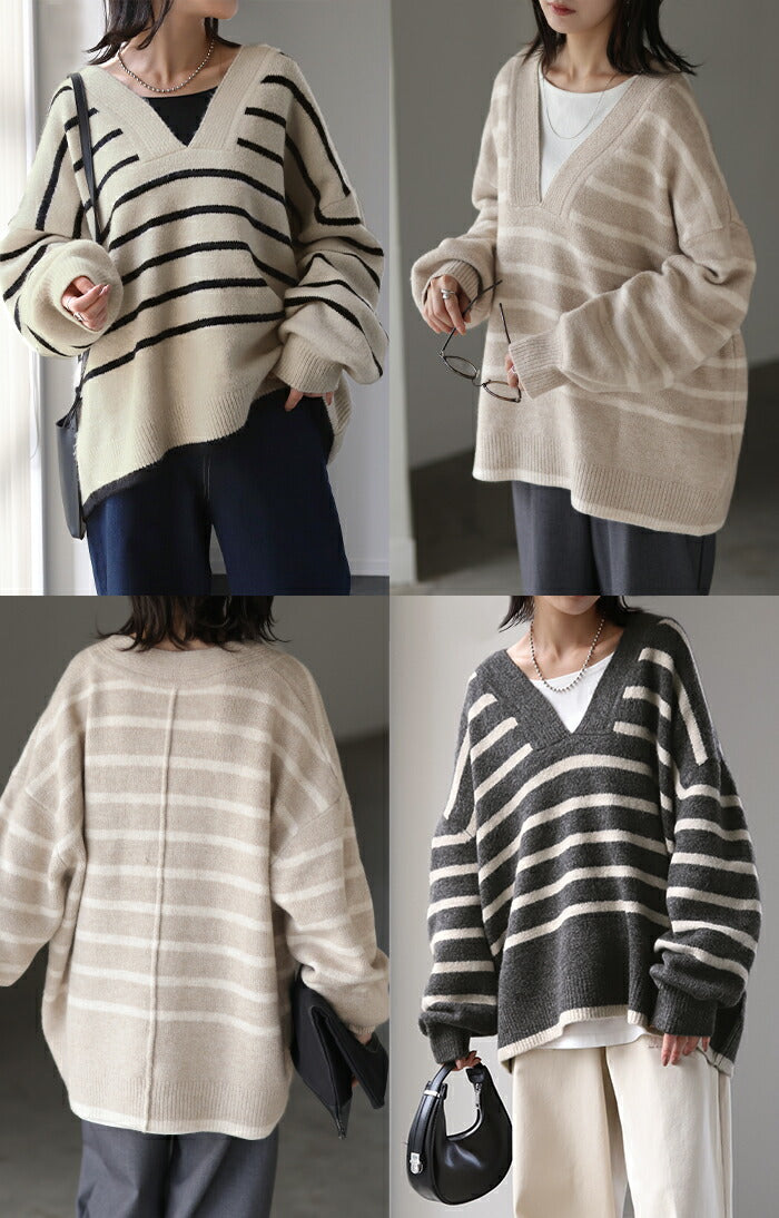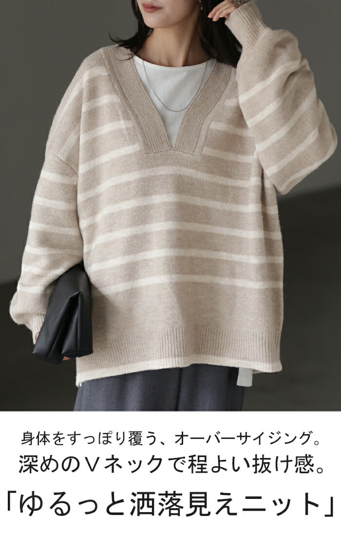 ざっくり開いた深めのVネックがポイントのボーダーニットです。インナー次第で印象が変わりレイヤードコーデも楽しんでいただけます。定番のボーダーと流行の深Vのデザインで人と被らないデザインです。※下げ札には別のカラー名称が記載されている場合がありますが、同色の別名でありイメージに違いはございません。