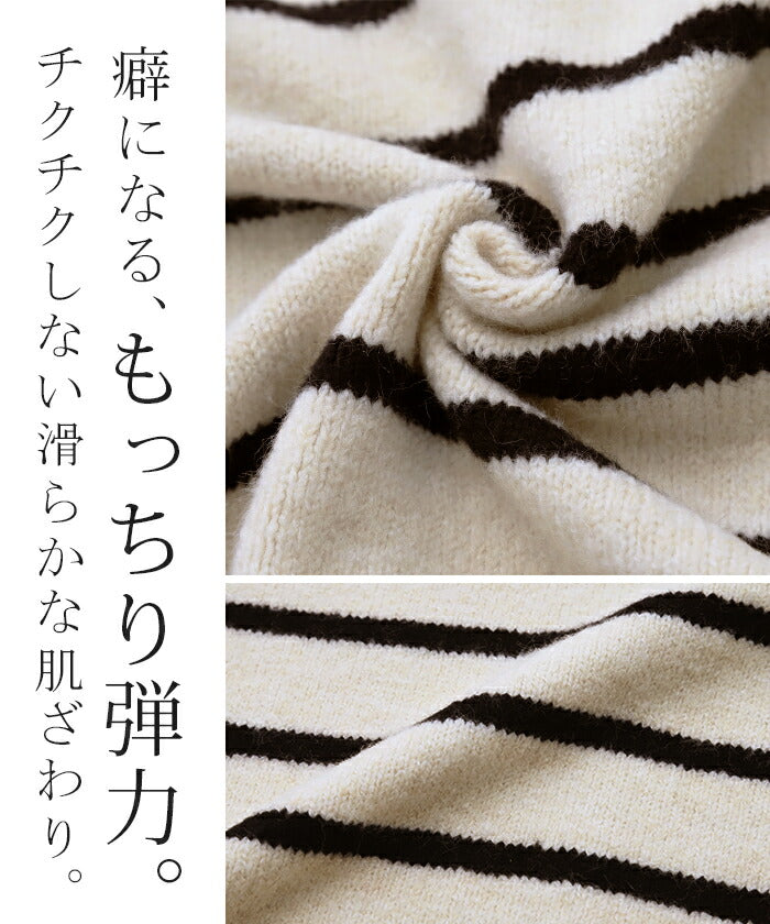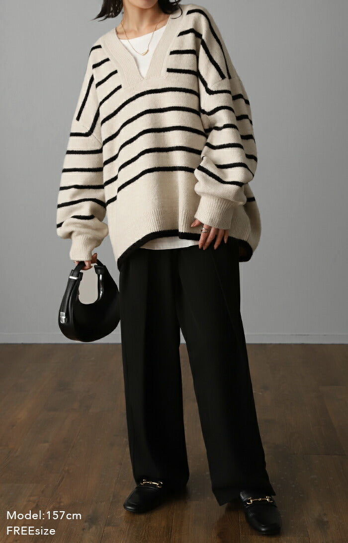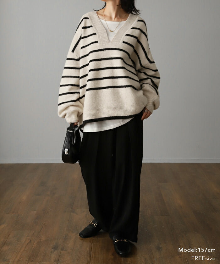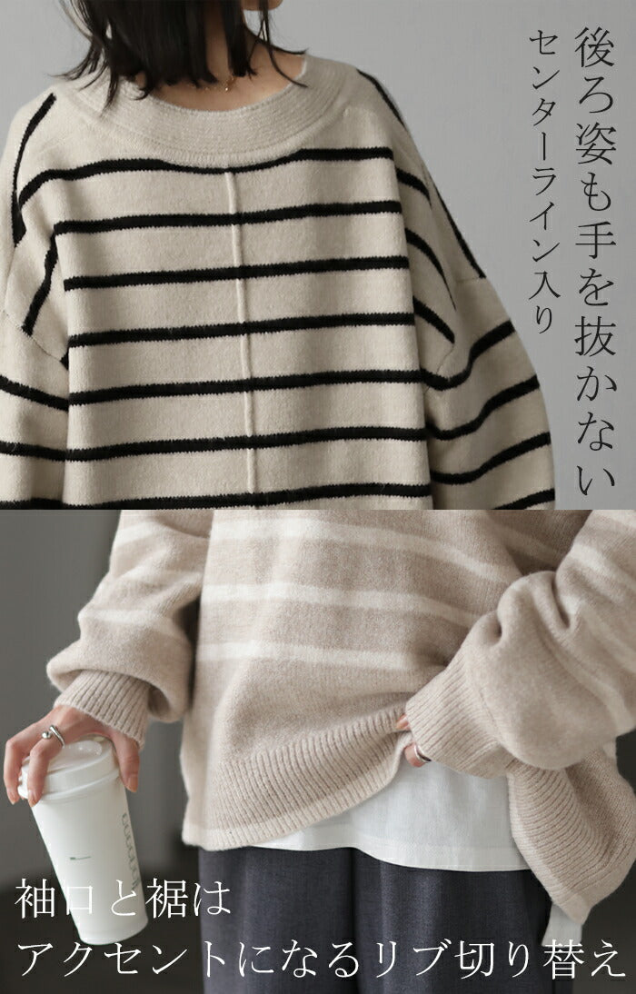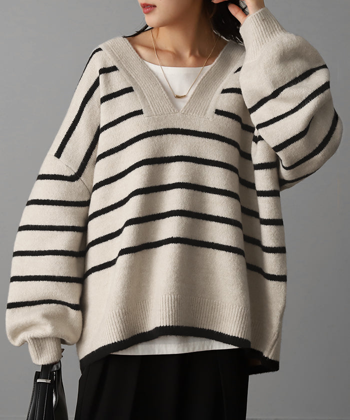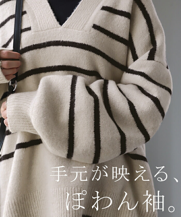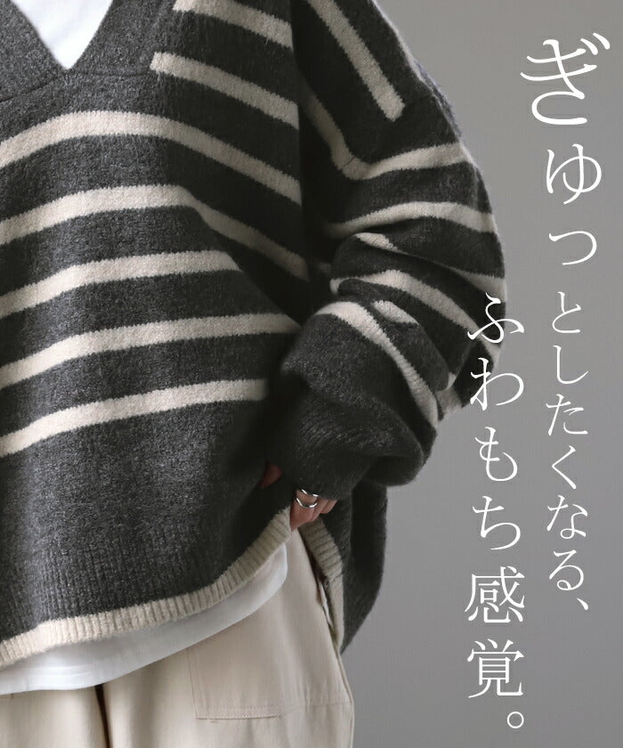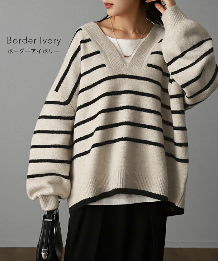 「 たぷん。お洒落 ボーダー 」 ニット レイヤード レディース トップス ボーダーニット セーター Vネック ゆったり センターライン ぽわん袖 長袖 大きいサイズ チクチクしない 体型カバー モヘア キーネック お尻が隠れる 白 黒 春 夏 HUG.U