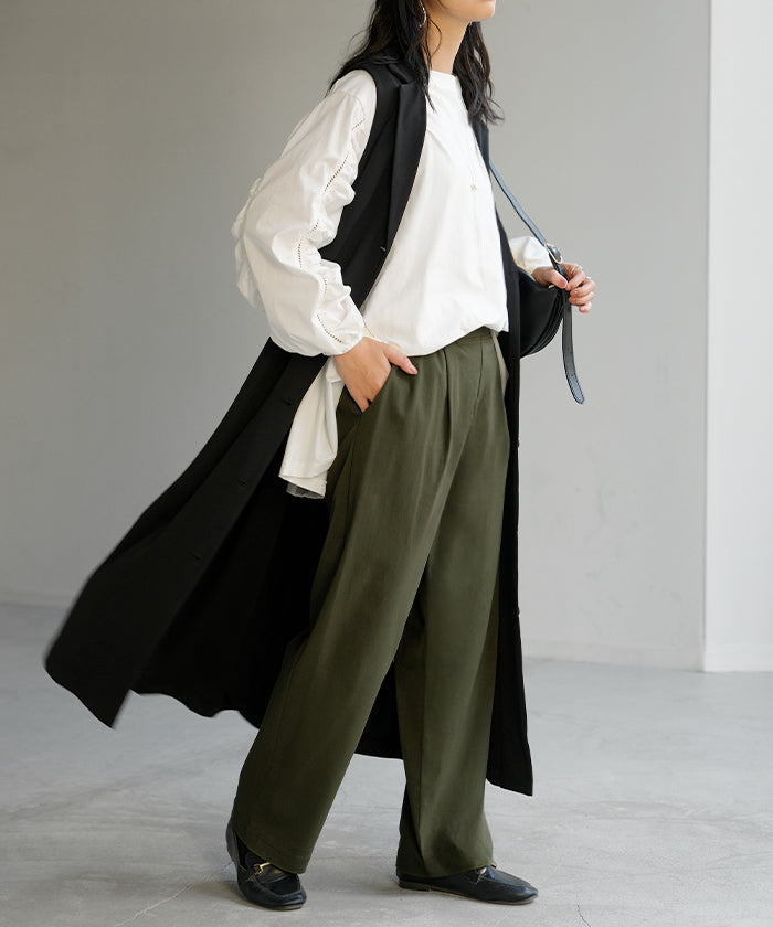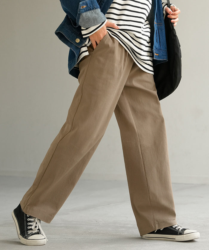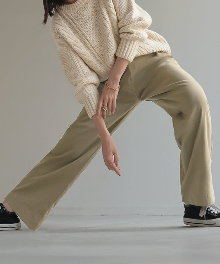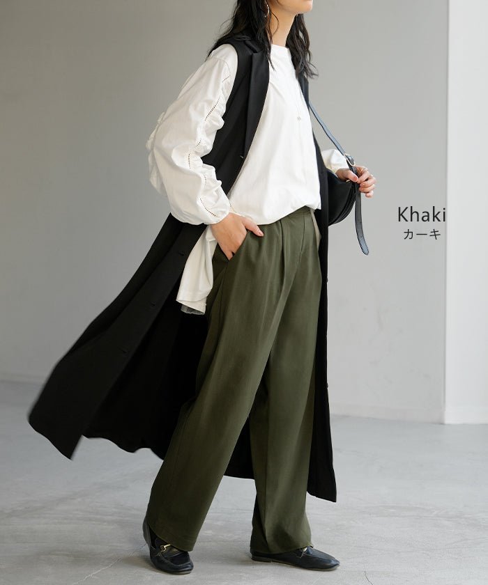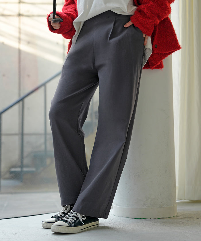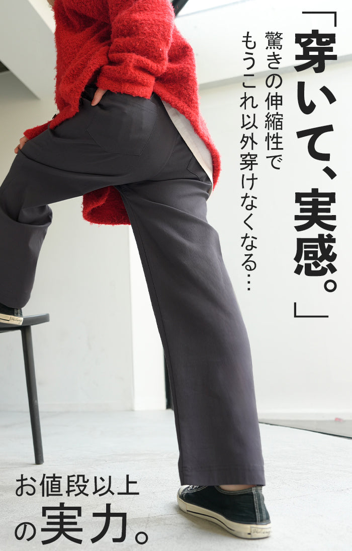 シルエットに徹底してこだわったワイドストレートパンツです。ワイドすぎないストレートなシルエットで脚をまっすぐ見せ美脚効果も◎。しっかりストレッチが効いているので、穿き心地も快適です。※下げ札には別のカラー名称が記載されている場合がありますが、同色の別名でありイメージに違いはございません。
