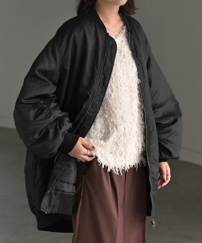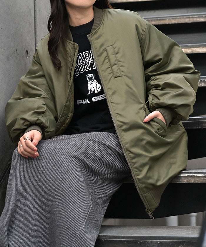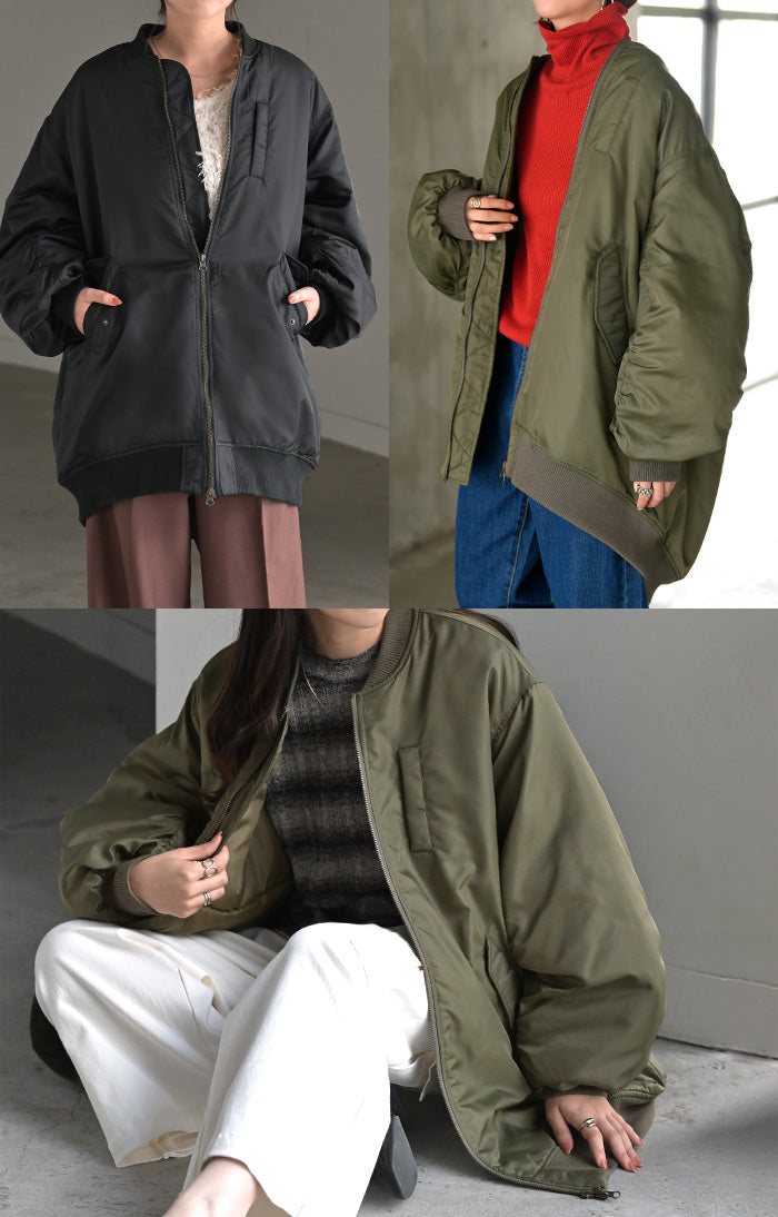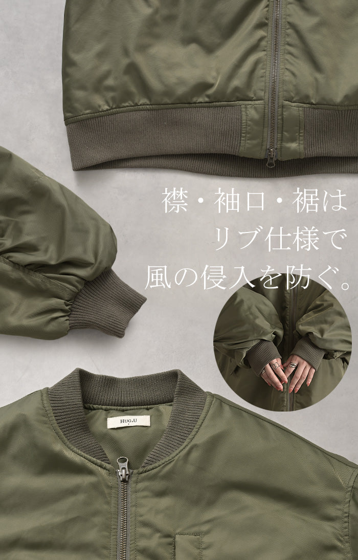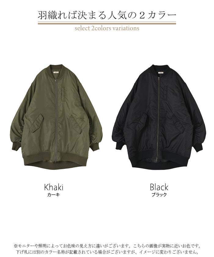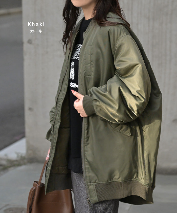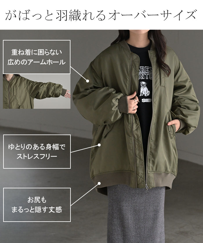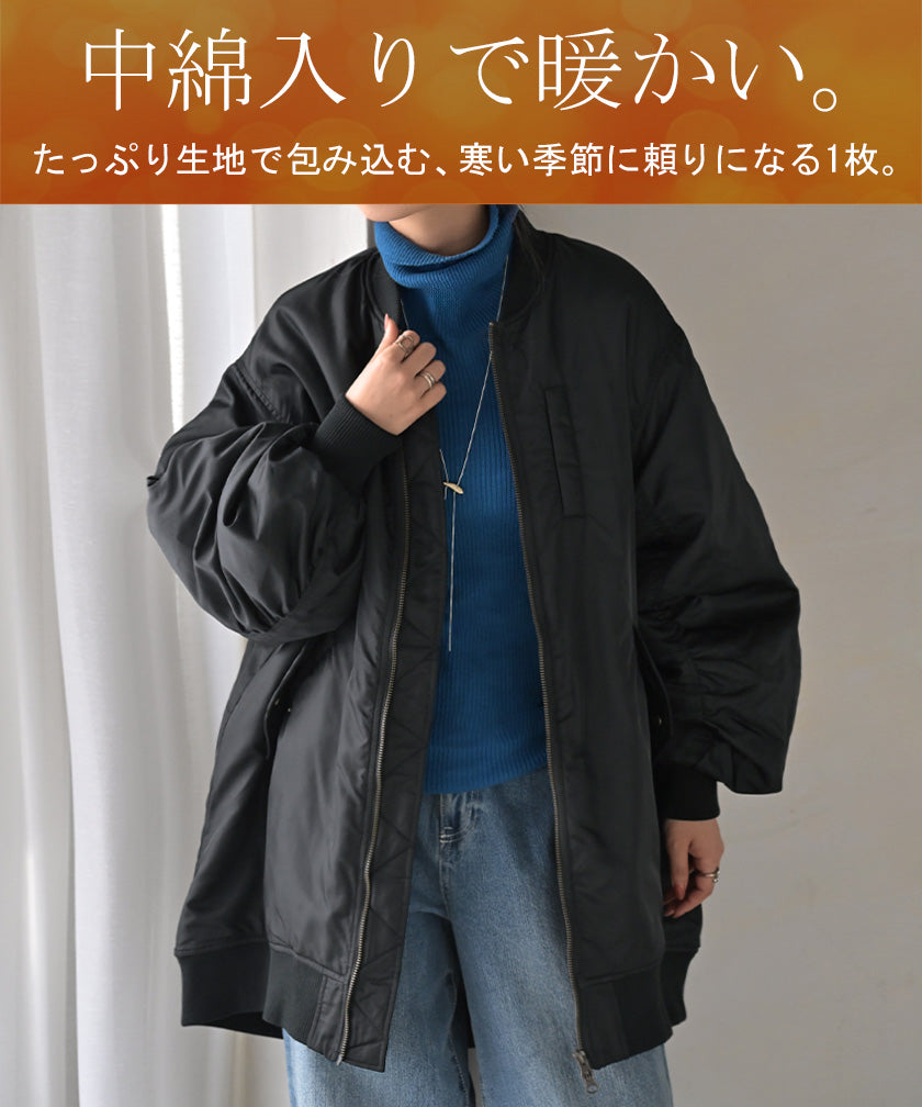 2025AW新作 ジャケット MA-1 アウター 中綿 レディース ロング ジャンパー ブルゾン コート ミリタリー 羽織 ボリュームスリーブ オーバーサイズ 大きいサイズ 軽い YKK ダブルジップ ナイロン リブ 保温 体型カバー お尻が隠れる MA1 おしゃれ 黒 カーキ 秋 冬 HUG.U