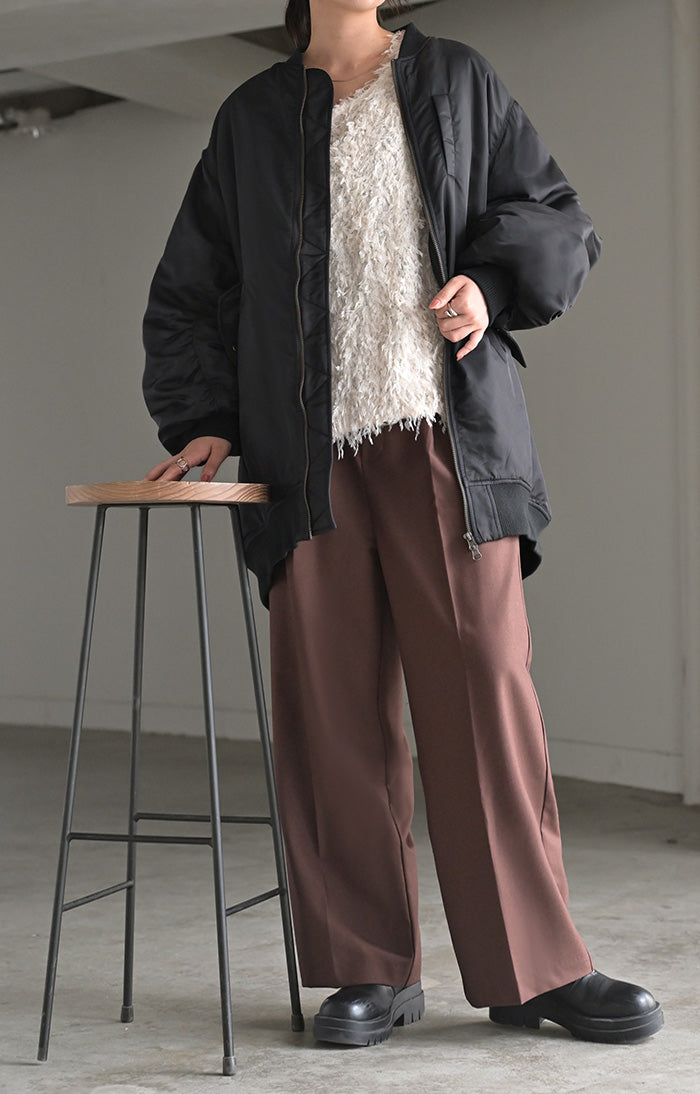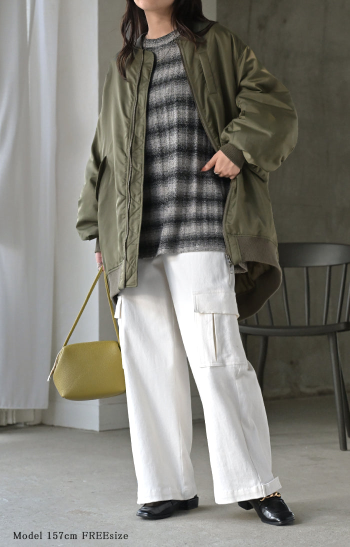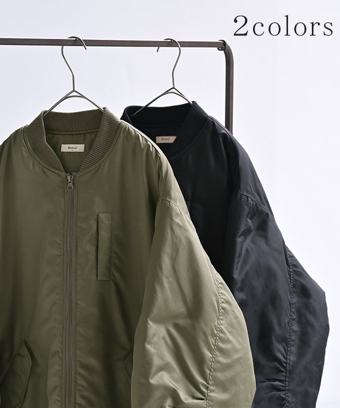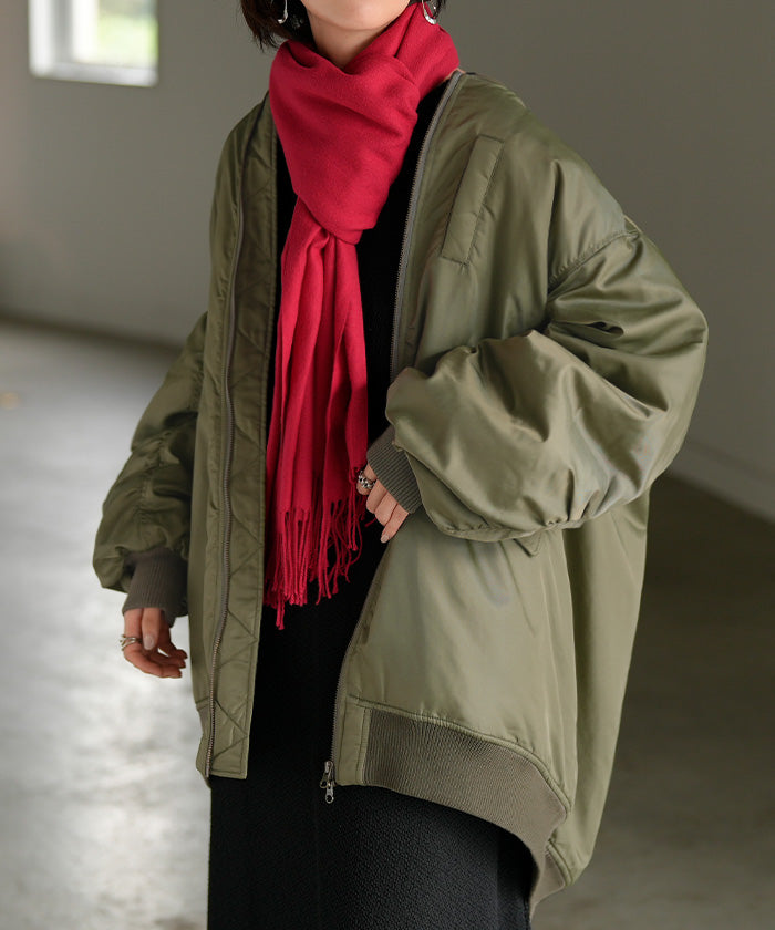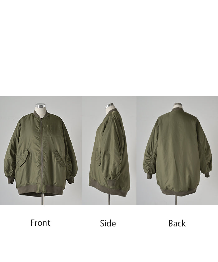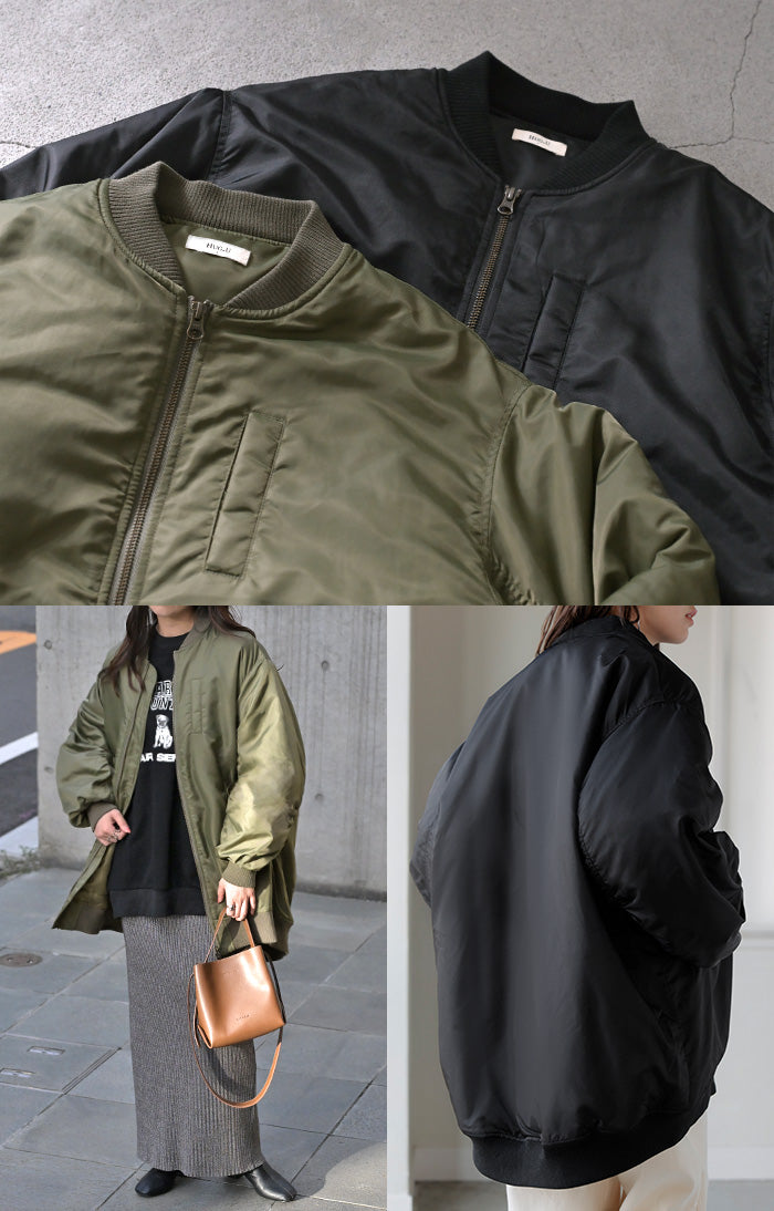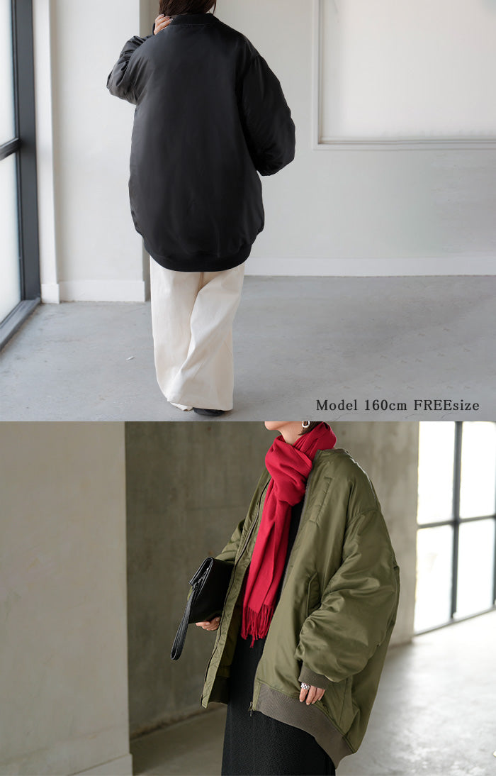 2025AW新作 ジャケット MA-1 アウター 中綿 レディース ロング ジャンパー ブルゾン コート ミリタリー 羽織 ボリュームスリーブ オーバーサイズ 大きいサイズ 軽い YKK ダブルジップ ナイロン リブ 保温 体型カバー お尻が隠れる MA1 おしゃれ 黒 カーキ 秋 冬 HUG.U