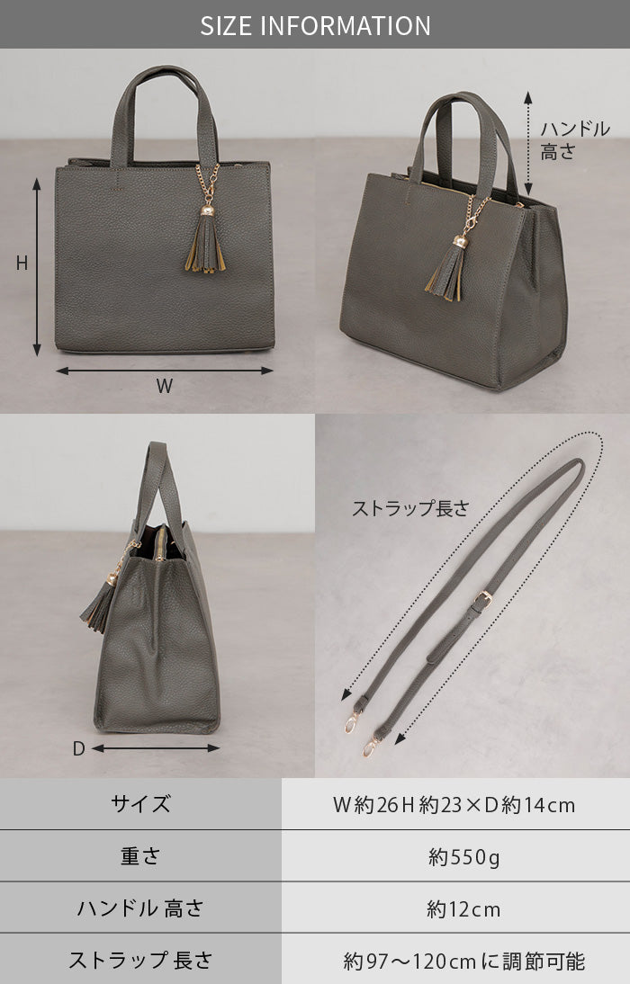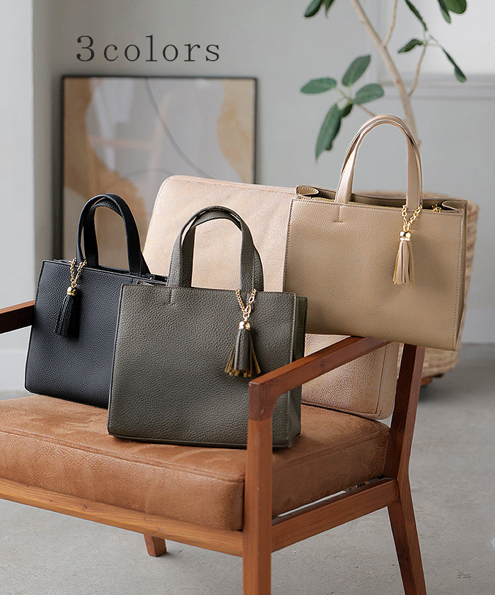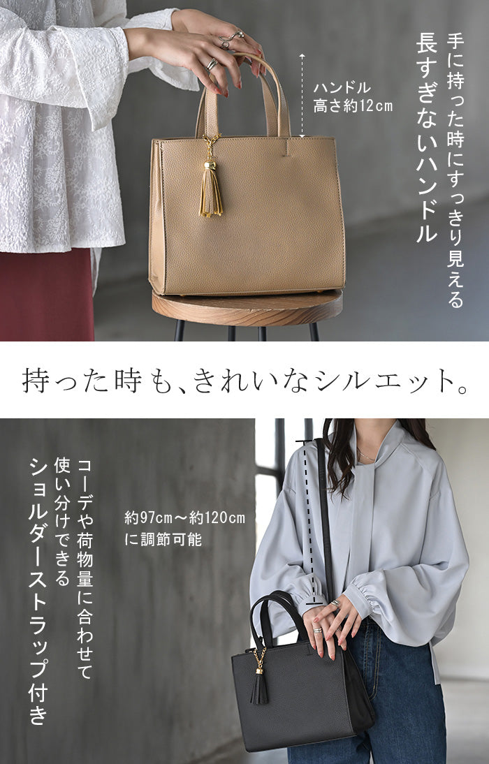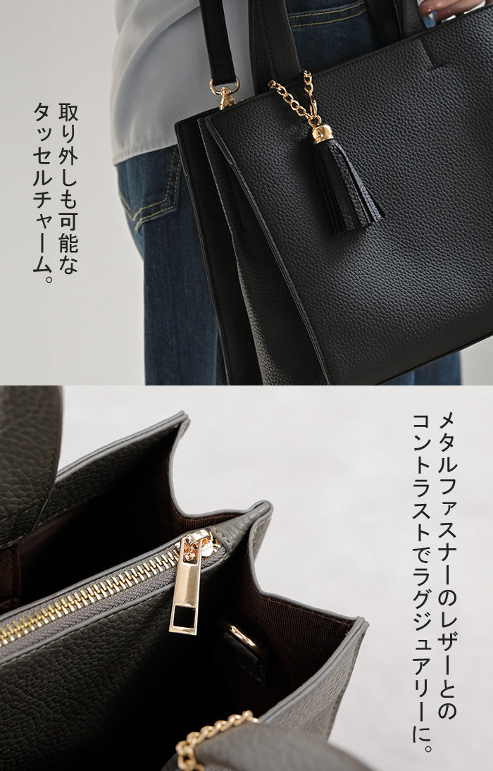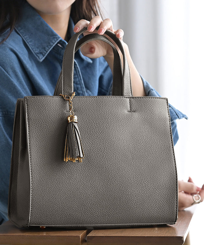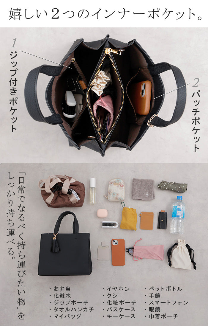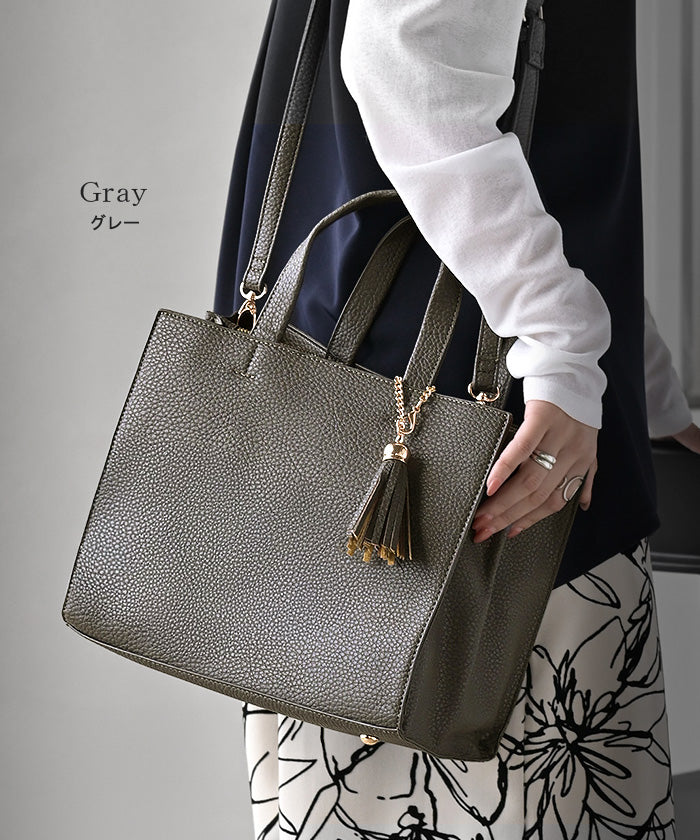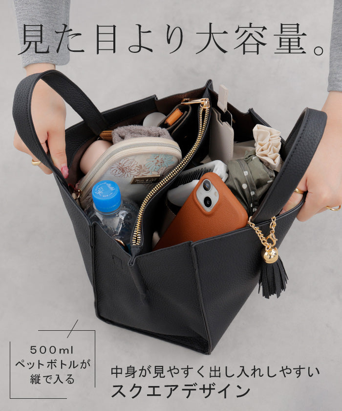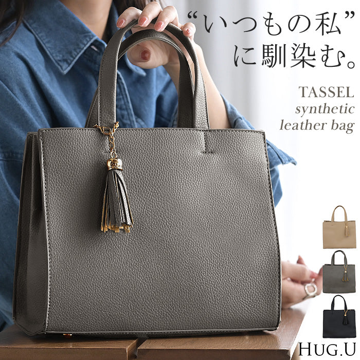 2025AW新作 トート バッグ フェイクレザー タッセル レディース トートバッグ ショルダーバッグ 2way マチ付き ミニトート ポケット かばん 鞄 無地 ペットボトル 収納可 本革 風 インナーポケット 軽量 シボ ストラップ付き 通勤 上品 きれいめ 黒 グレー 秋 冬 HUG.U