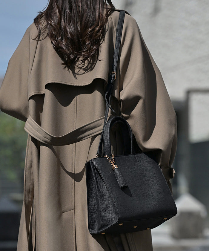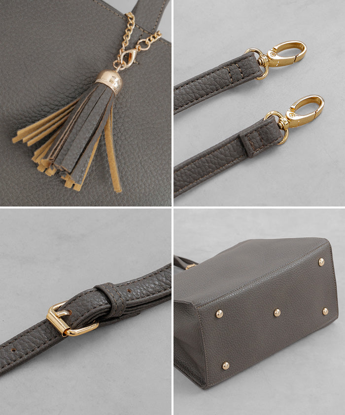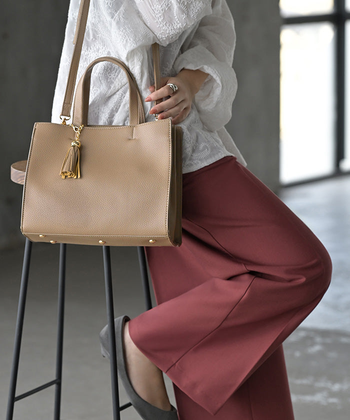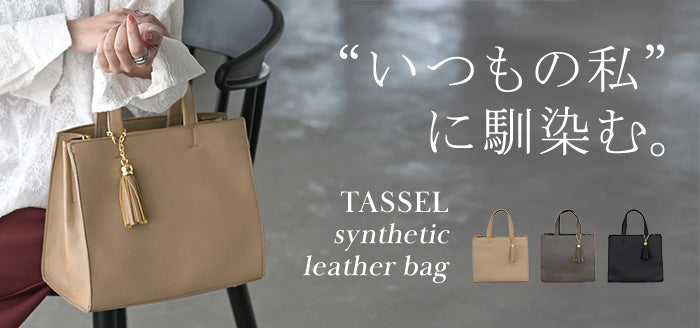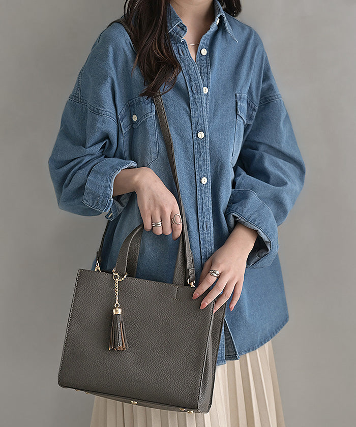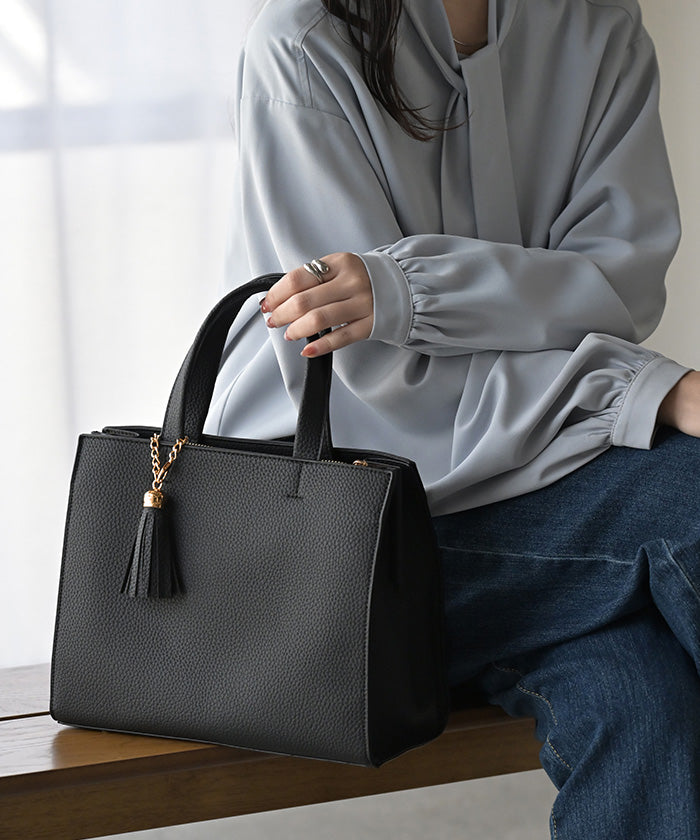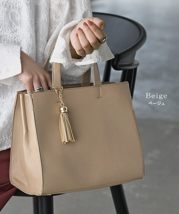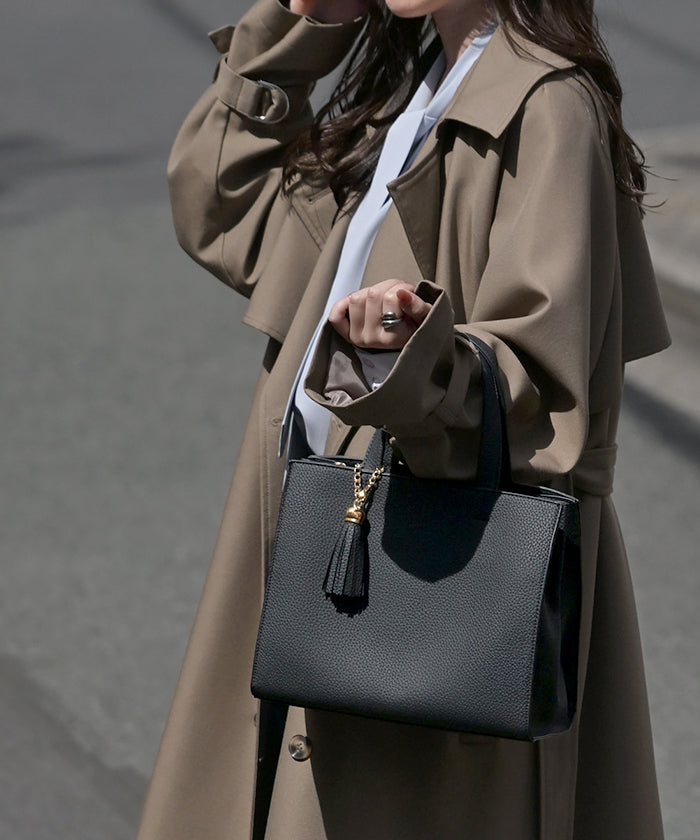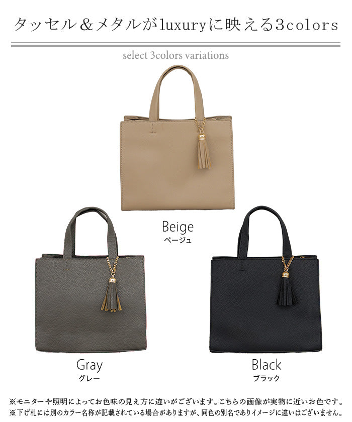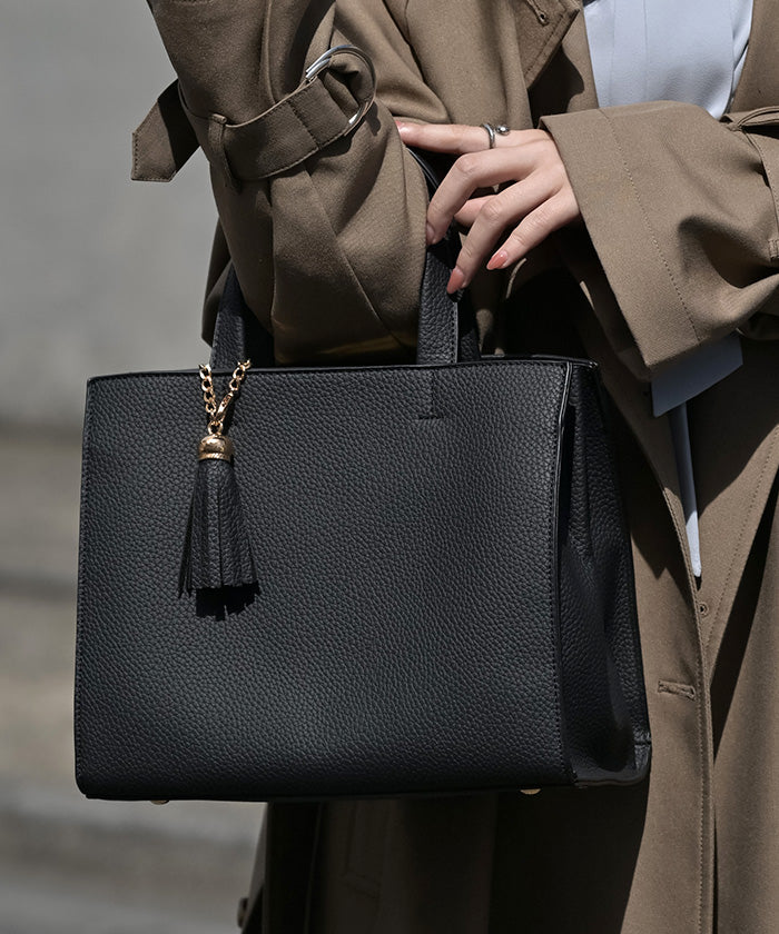 2025AW新作 トート バッグ フェイクレザー タッセル レディース トートバッグ ショルダーバッグ 2way マチ付き ミニトート ポケット かばん 鞄 無地 ペットボトル 収納可 本革 風 インナーポケット 軽量 シボ ストラップ付き 通勤 上品 きれいめ 黒 グレー 秋 冬 HUG.U