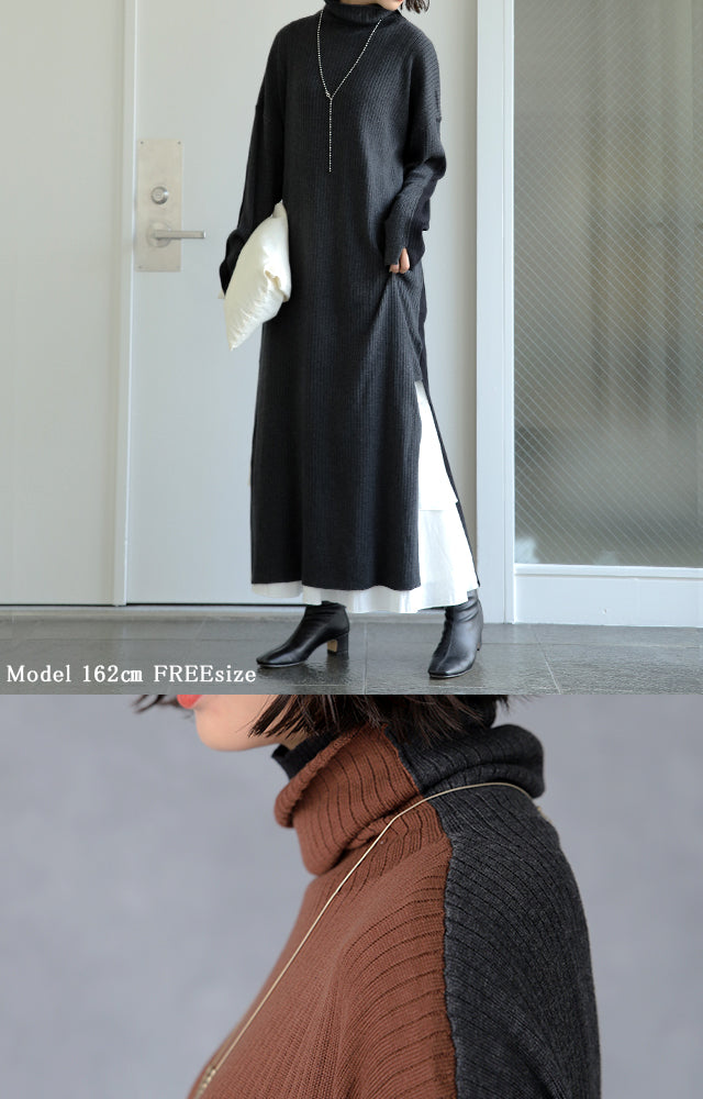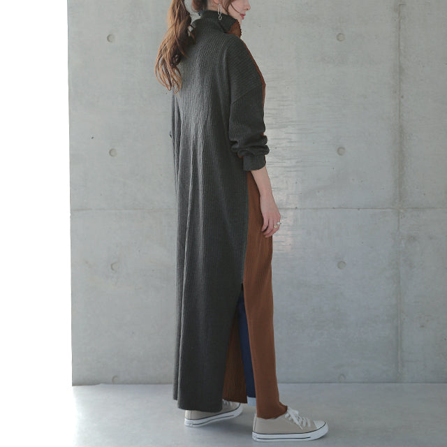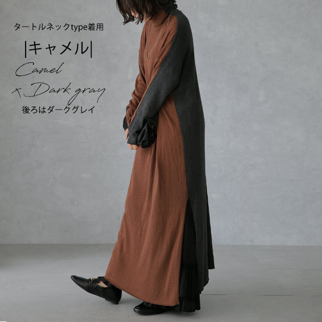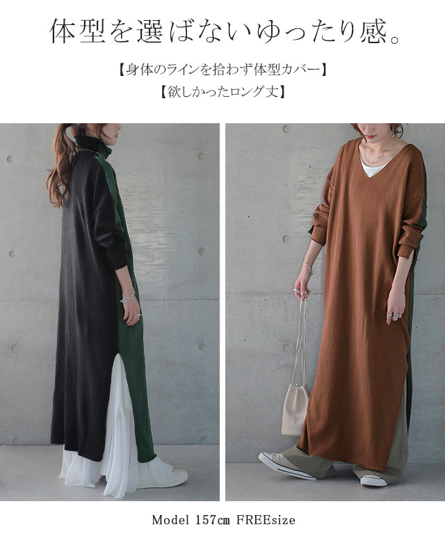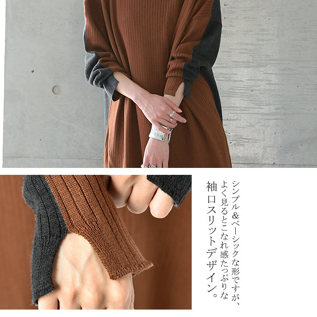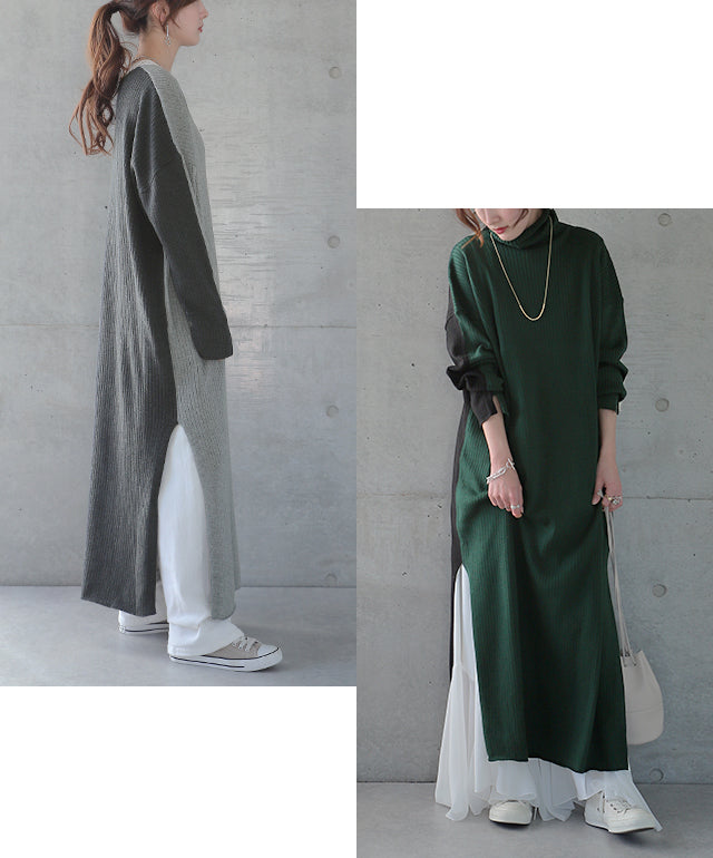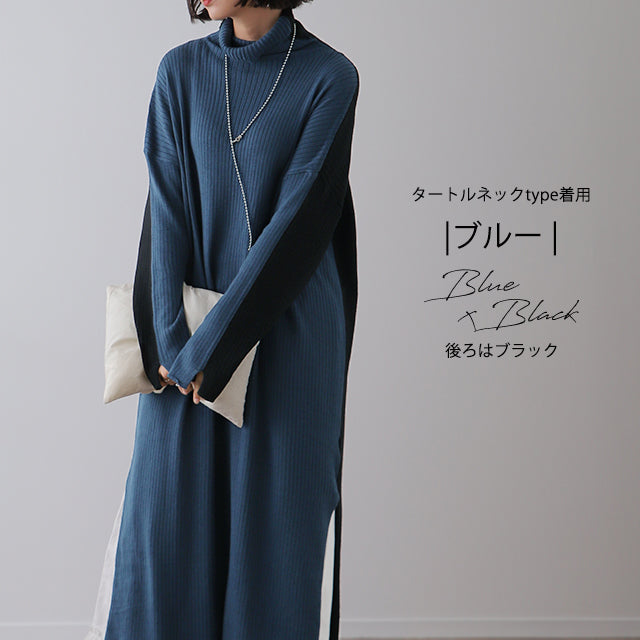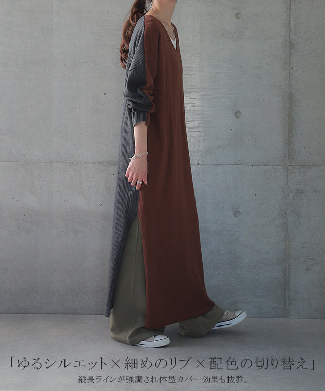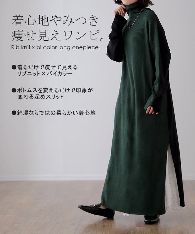 バイカラーのニットロングワンピース。前後異なる配色とスリットデザインでオシャレにきまる1枚です。ほどよいしっかりとした厚みのある綿混の柔らかいリブニット生地で着心地も◎すっきり体型カバーにも効果があります。※ニットの特性上、実際の製品の寸法とサイズ表記に差が生じることがございます。予めご了承下さいませ。