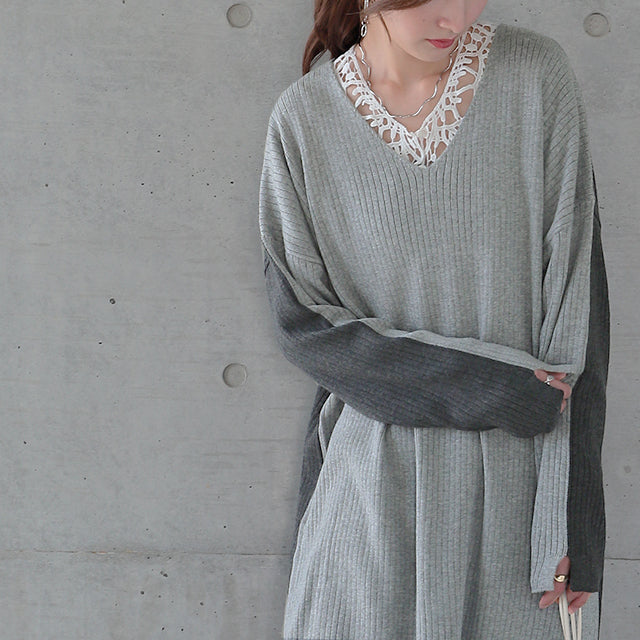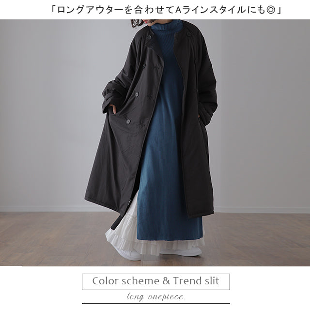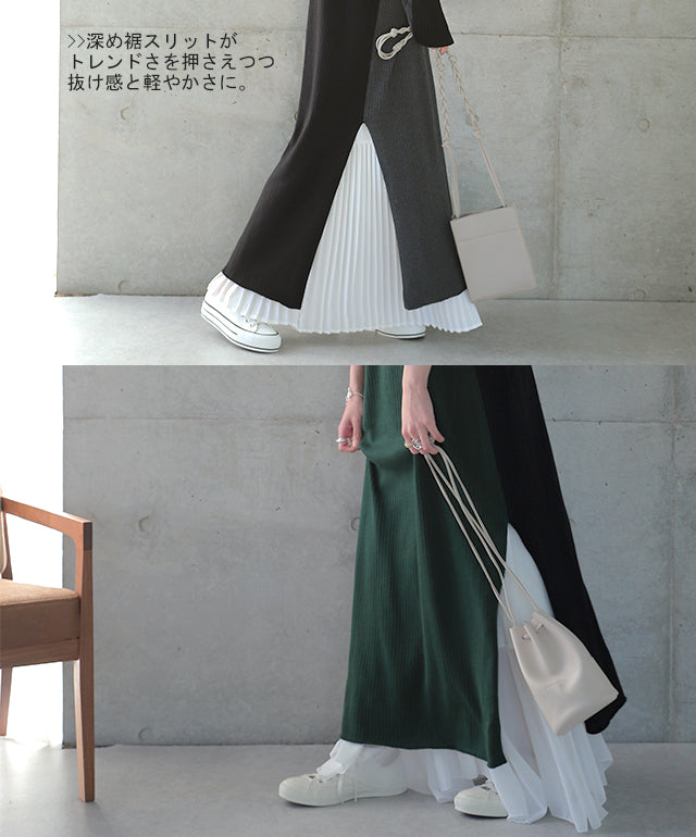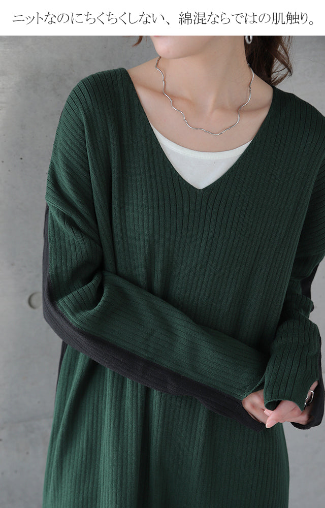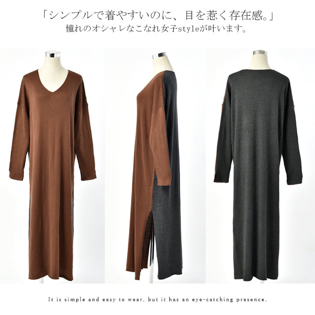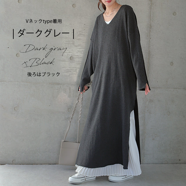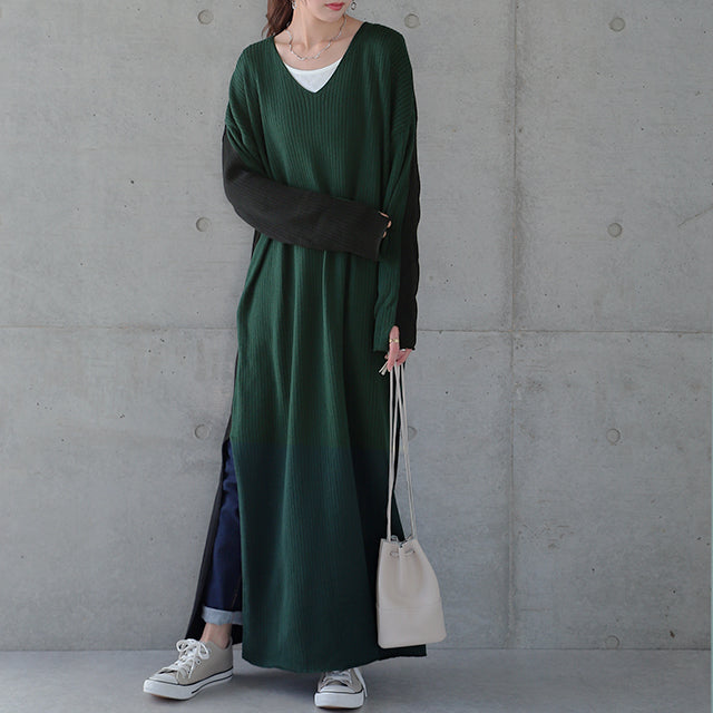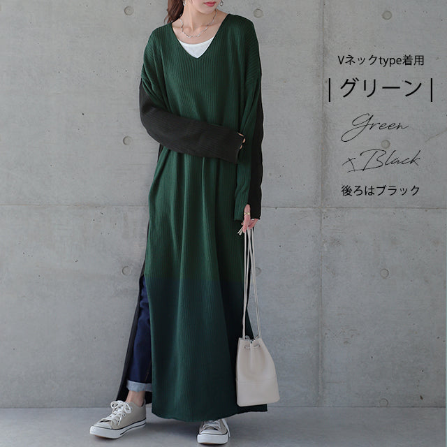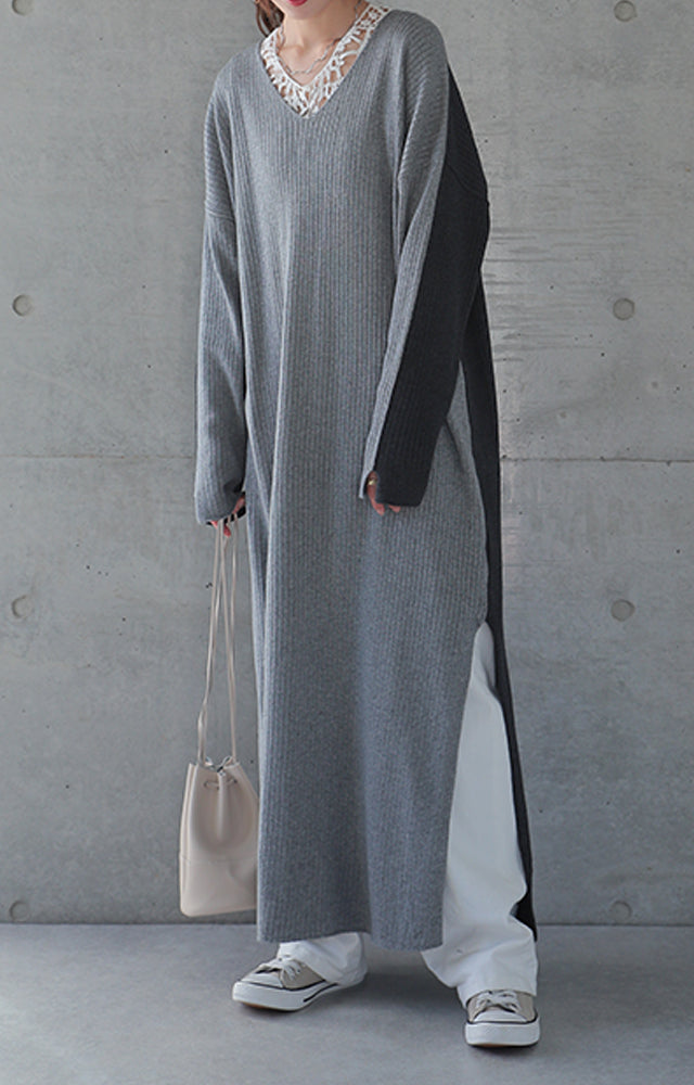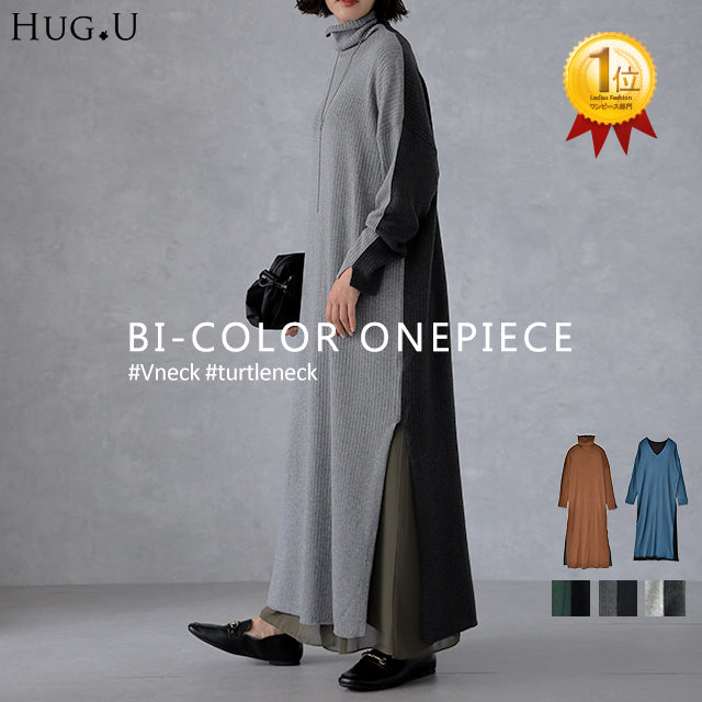 バイカラーのニットロングワンピース。前後異なる配色とスリットデザインでオシャレにきまる1枚です。ほどよいしっかりとした厚みのある綿混の柔らかいリブニット生地で着心地も◎すっきり体型カバーにも効果があります。※ニットの特性上、実際の製品の寸法とサイズ表記に差が生じることがございます。予めご了承下さいませ。