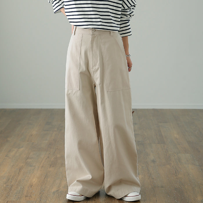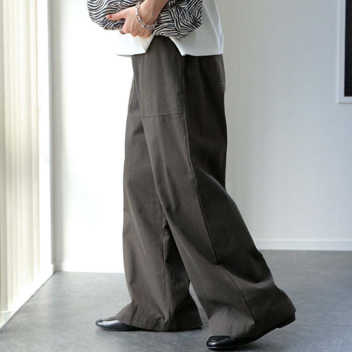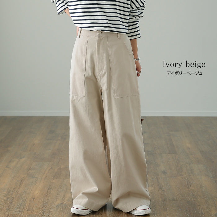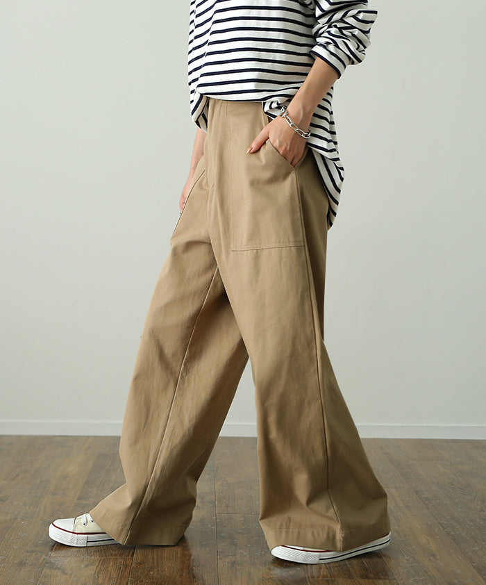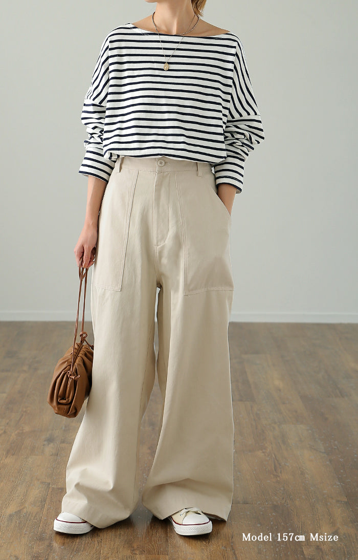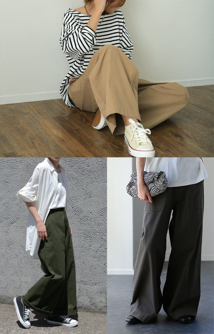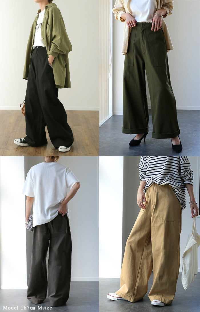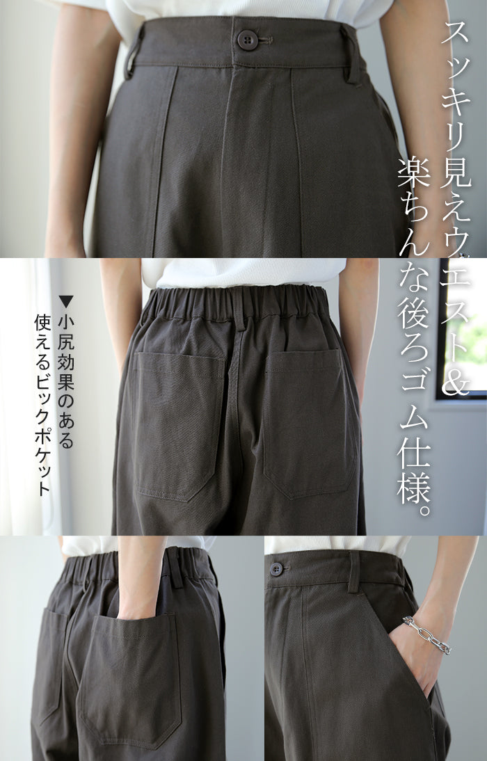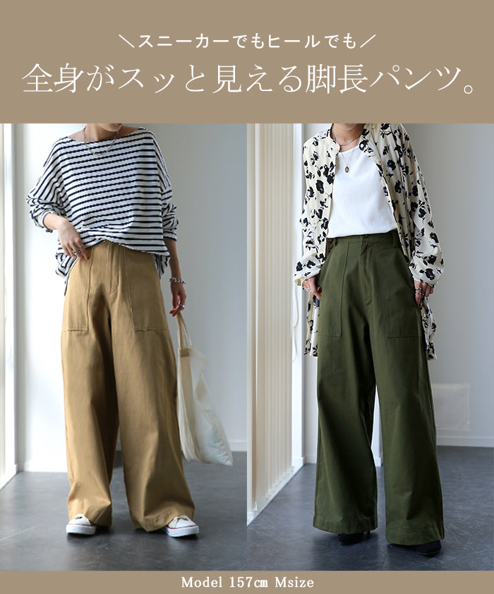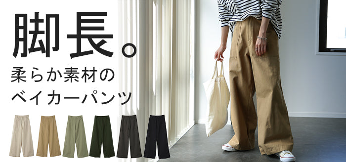 メンズライクで着回し万能のベイカーパンツを女性が使い易くアレンジし、ウエストから裾まで広がるワイドAラインは履きやすいだけでなく、縦長効果があります。お尻のラインも拾わないので下半身カバーはバッチリ。一度履けば手放せない、オールシーズン活躍してくれる汎用性の高さはコーディネートに幅を持たせてくれます。