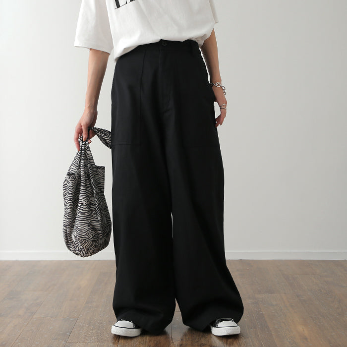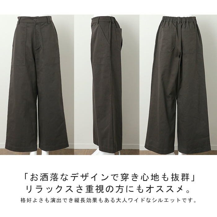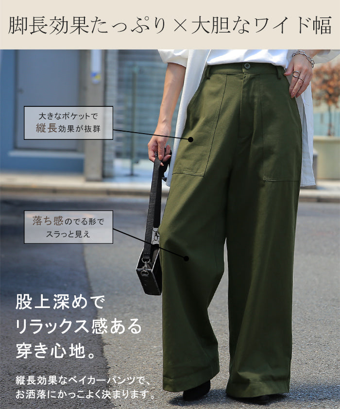 大人カジュアルコーデに重宝するベイカーワイドパンツです。 リラックス感あるワイドシルエットなので体型をカバーし自然に着痩せ。 厚手すぎないさらっとした素材感で快適な履き心地です。