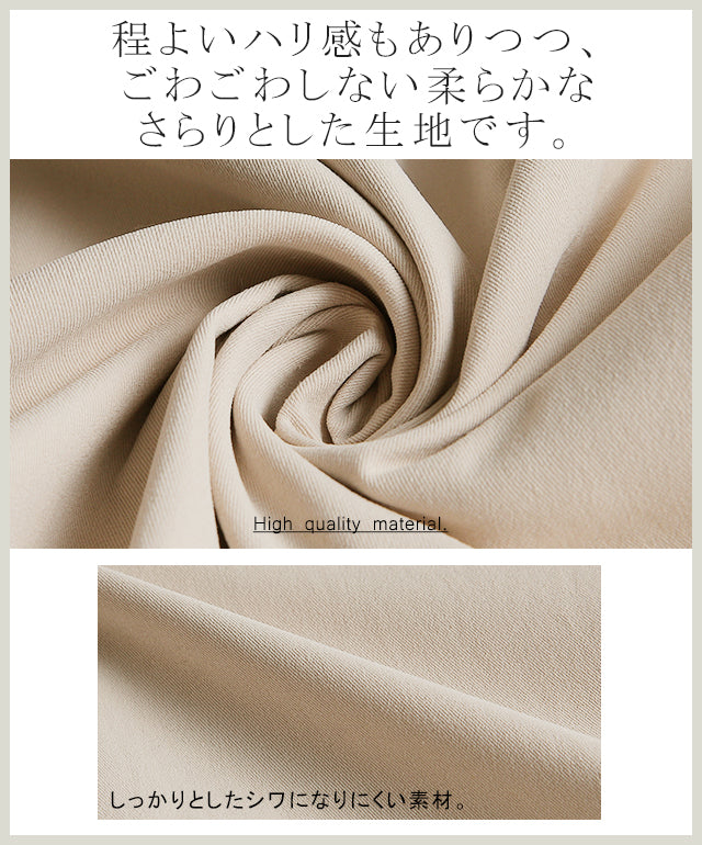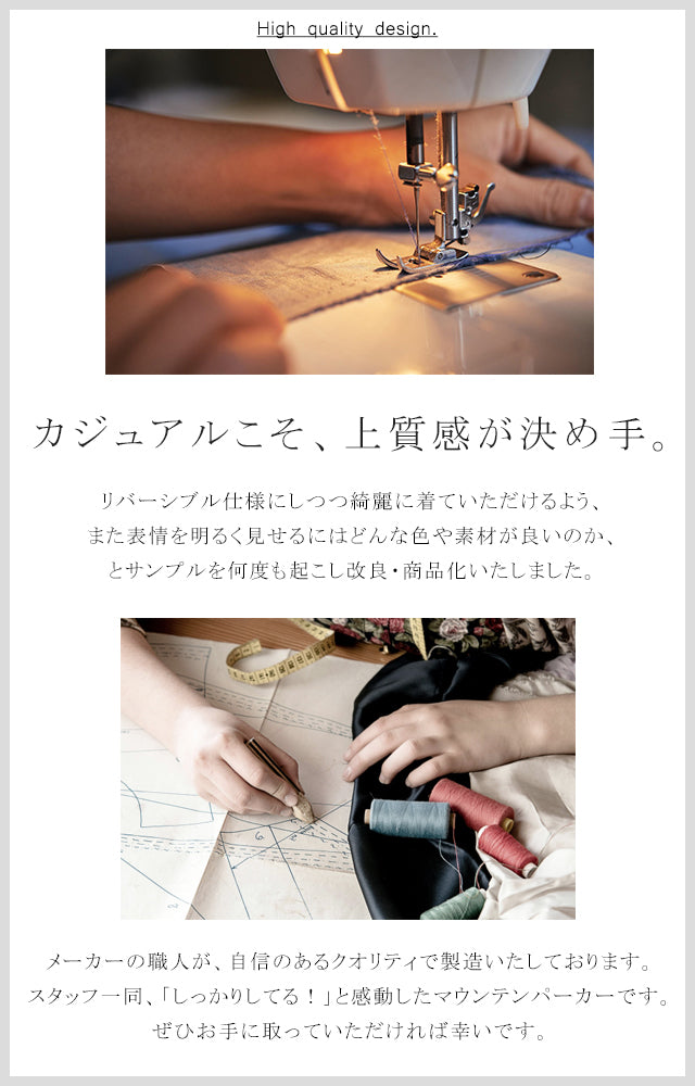程よいハリ感があるものの、ごわつかず柔らかなさらりとした生地が使用されています。高品質な素材はシワになりにくく、耐久性も考慮されています。両面どちらで着てもシルエットと機能性が損なわれません。