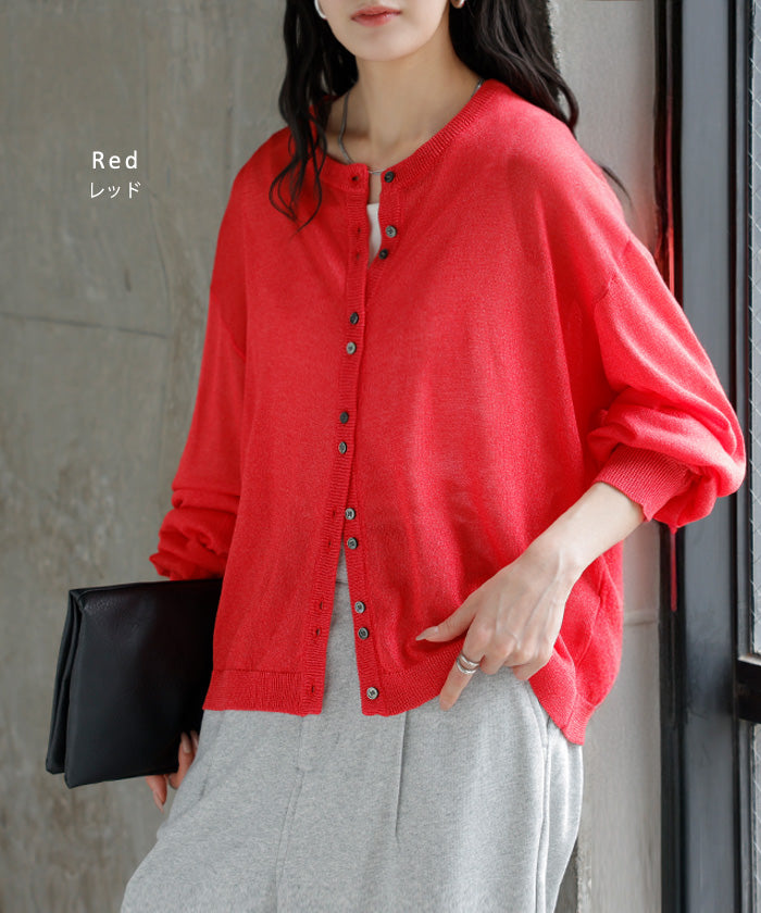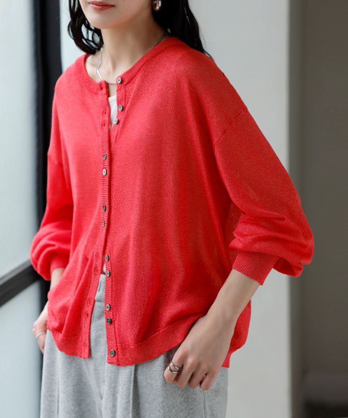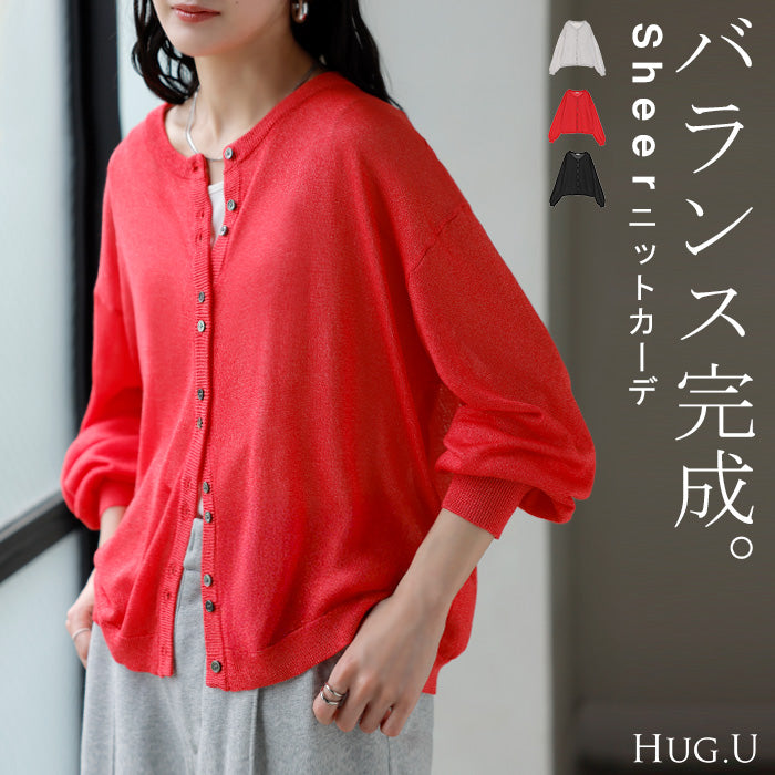 2026SS新作 カーディガン シアーニット レディース ■一部5月中旬入荷 長袖 ラメ シアーニットカーデ 羽織り トップス 短丈 ショート丈 薄手 スタイルアップ レイヤード 重ね着 軽い ダブルボタン 体型カバー 冷房対策 日除け カジュアル きれいめ レッド グレー 春 夏 HUG.U