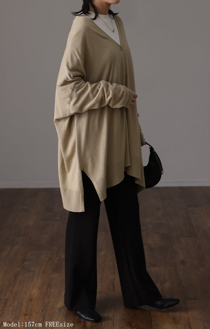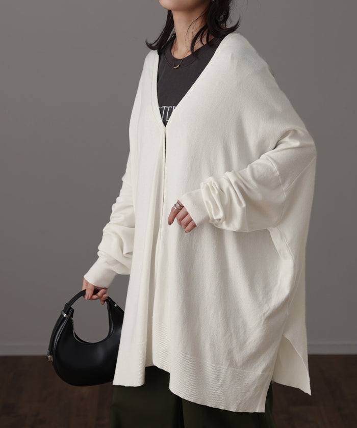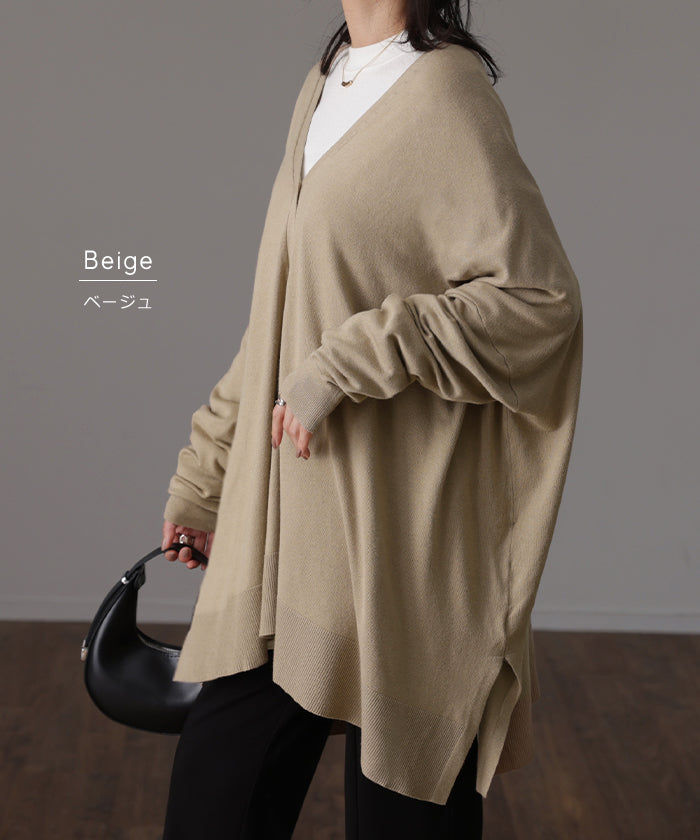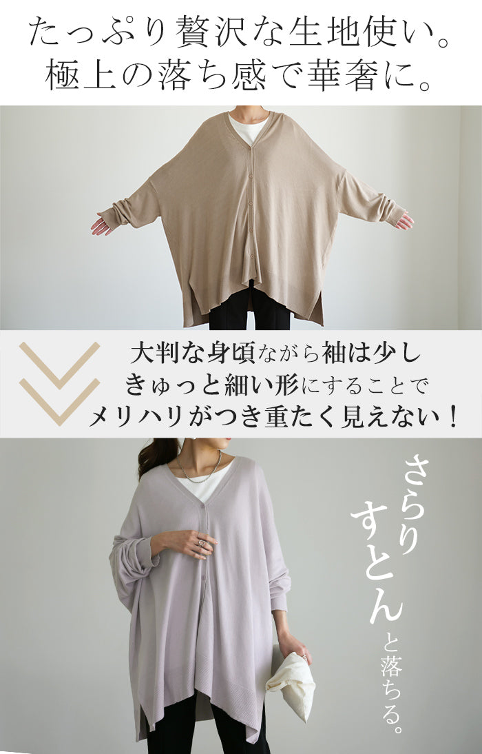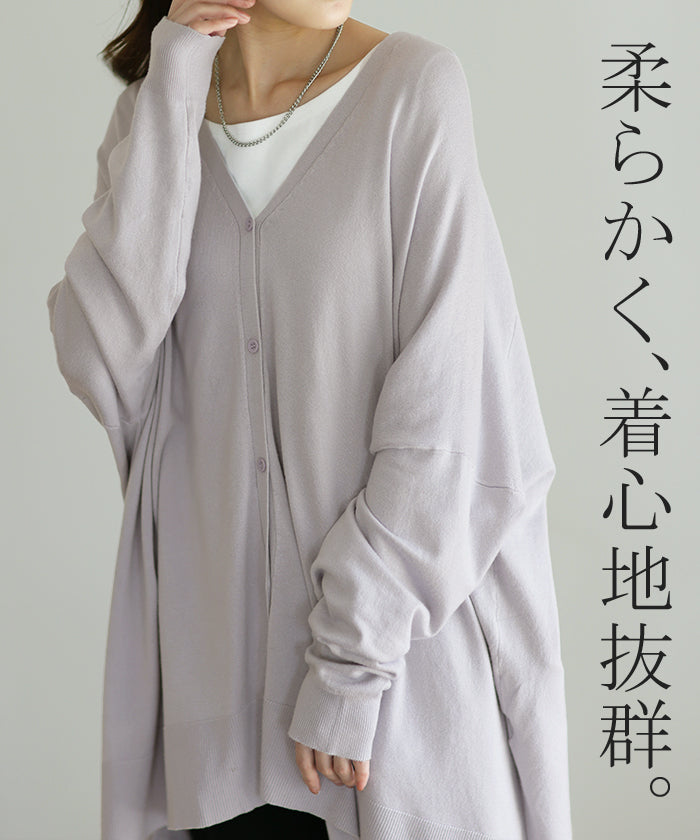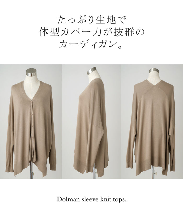 柔らかく優しい風合いのドルマンニットカーディガンです。ゆったりなシルエットでインナー合わせも楽々。どんなボトムスとも好相性でお洒落な雰囲気がある一着です。※ニットの特性上、実際の製品の寸法とサイズ表記に差が生じることがございます。予めご了承下さいませ。