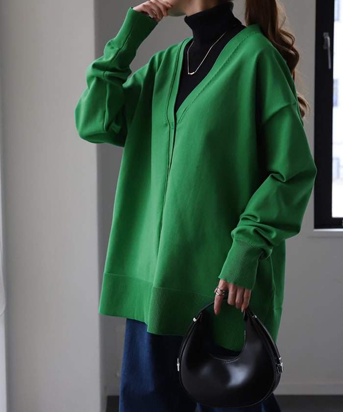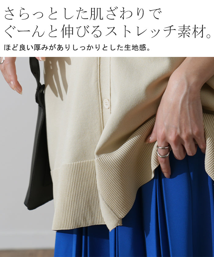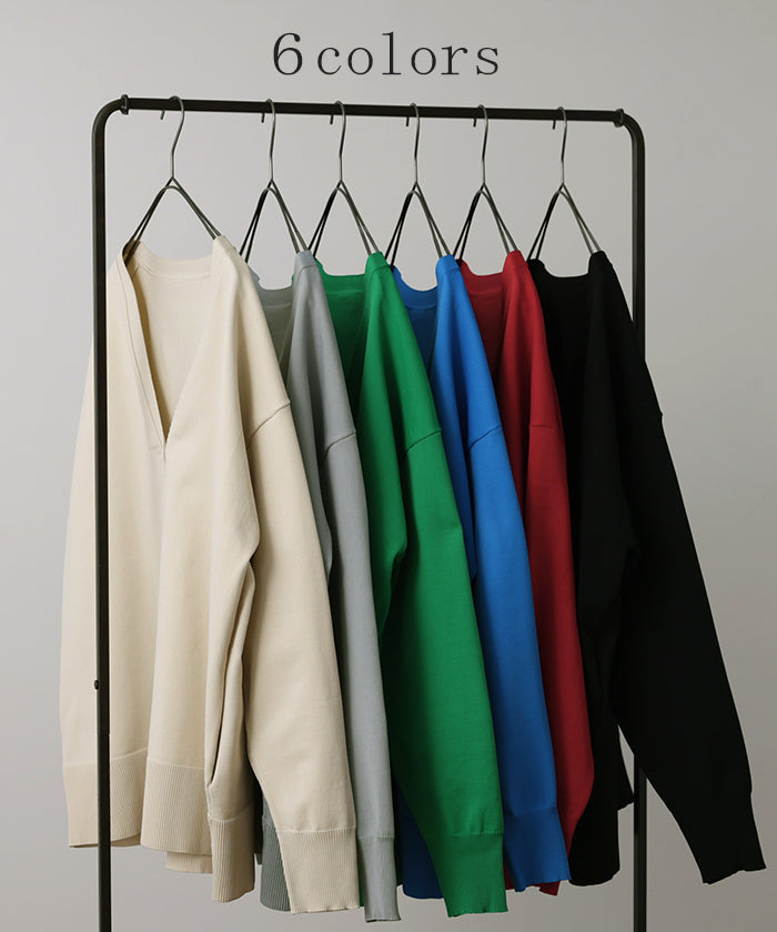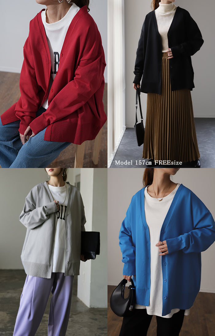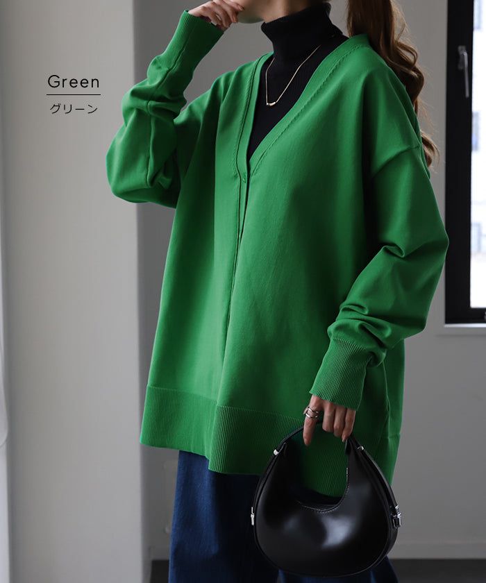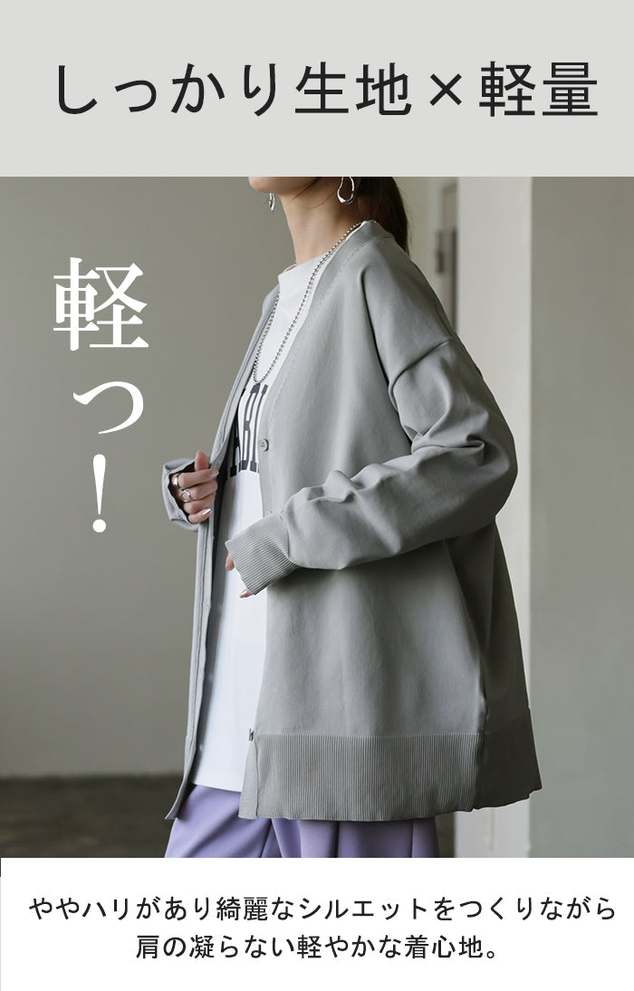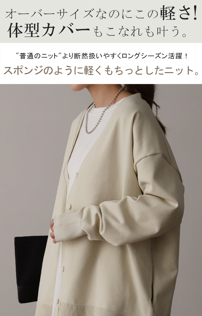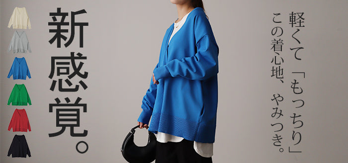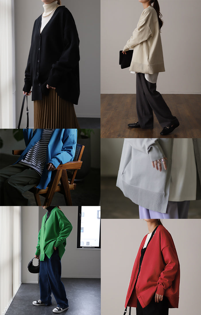 グリーンを購入しました。こちらのお店に来るようになってから、黒族でしたがカラー物が好きになりました。 こちらは、ニットとありますが、所謂、毛羽立ちしない、例えが合っているかわかりませんが、ちょっと肉厚なトレーナーに近い生地感で、軽いし、サイズ感も大きすぎず、丈感もこちらのお店にしては多少短めで丁度良かったです。 また、肉厚感が表に出ないので、寒がりな私にはかなり有り難く、猛暑じゃ無い日なら、オールシーズン着れそうで、良い買い物をしました!実際に、前日着ましたが、腕まくりすれば着れました!