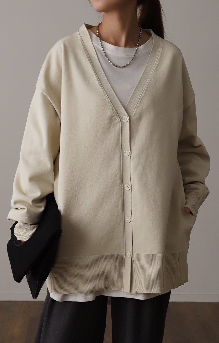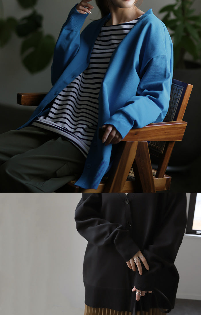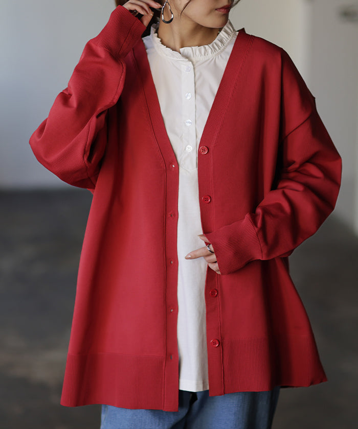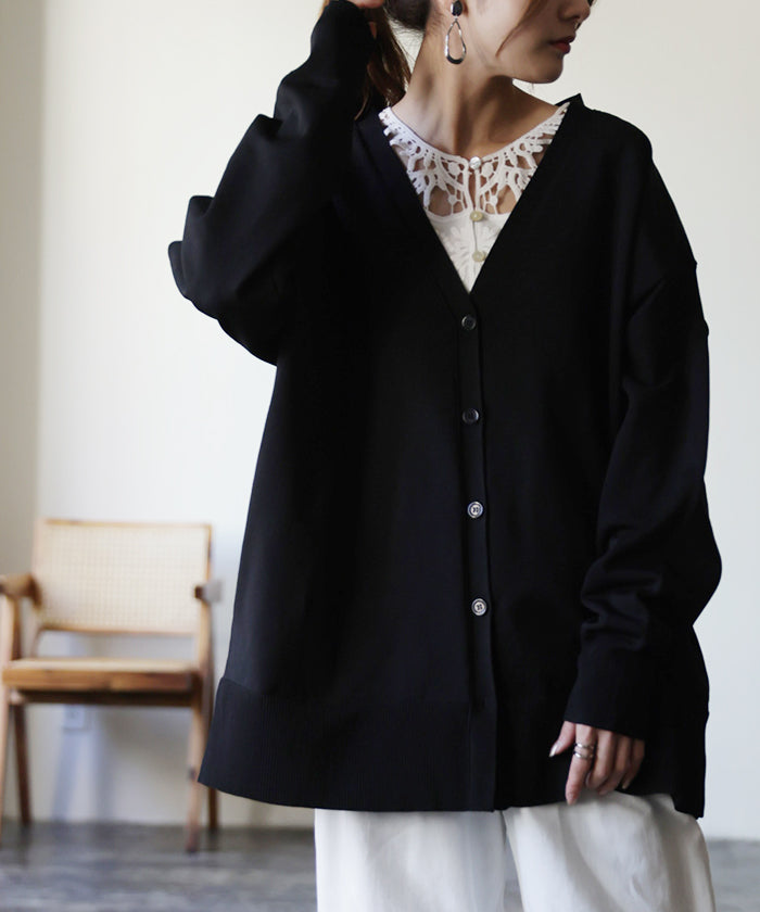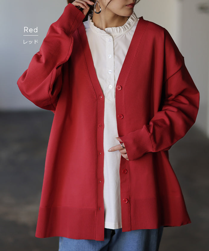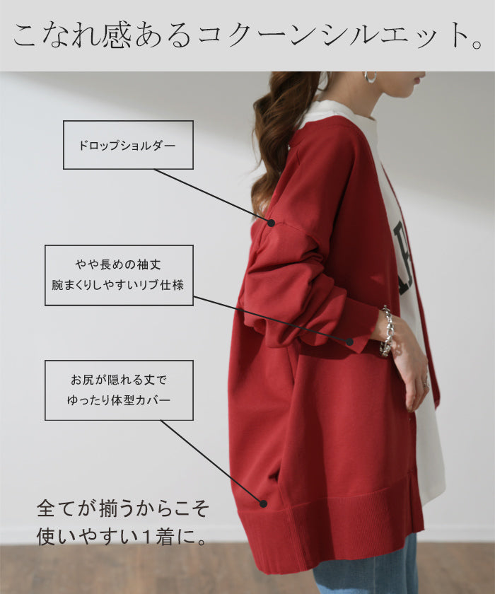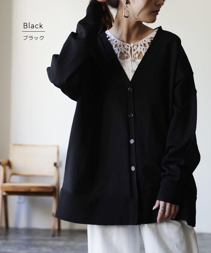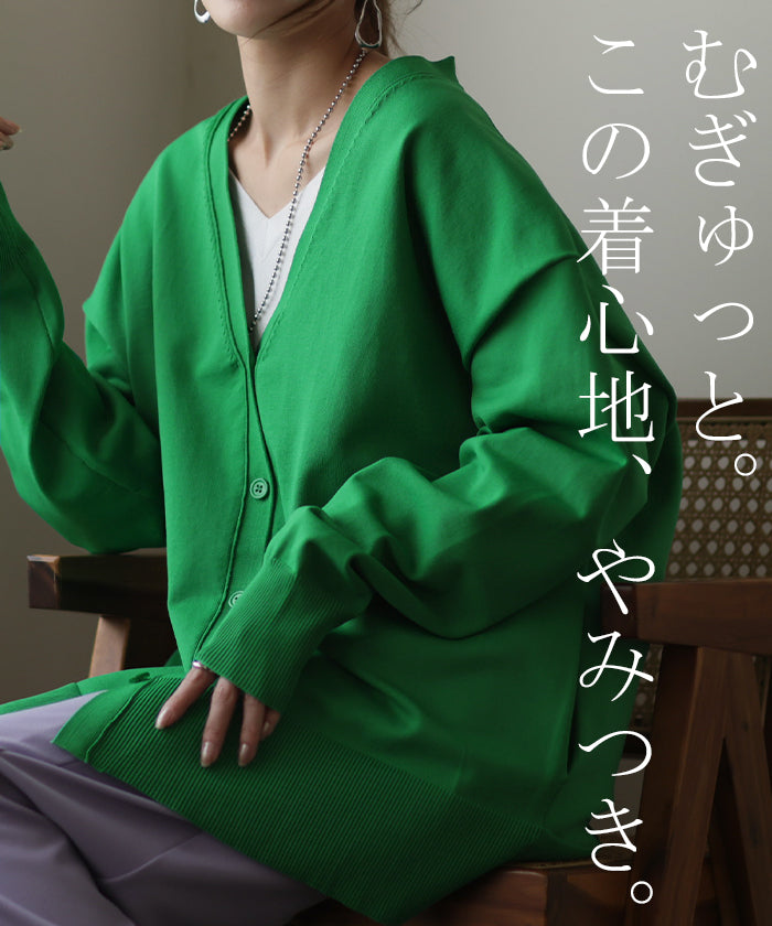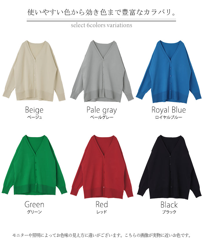 グリーンを購入しました。こちらのお店に来るようになってから、黒族でしたがカラー物が好きになりました。 こちらは、ニットとありますが、所謂、毛羽立ちしない、例えが合っているかわかりませんが、ちょっと肉厚なトレーナーに近い生地感で、軽いし、サイズ感も大きすぎず、丈感もこちらのお店にしては多少短めで丁度良かったです。 また、肉厚感が表に出ないので、寒がりな私にはかなり有り難く、猛暑じゃ無い日なら、オールシーズン着れそうで、良い買い物をしました!実際に、前日着ましたが、腕まくりすれば着れました!