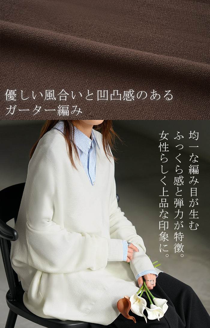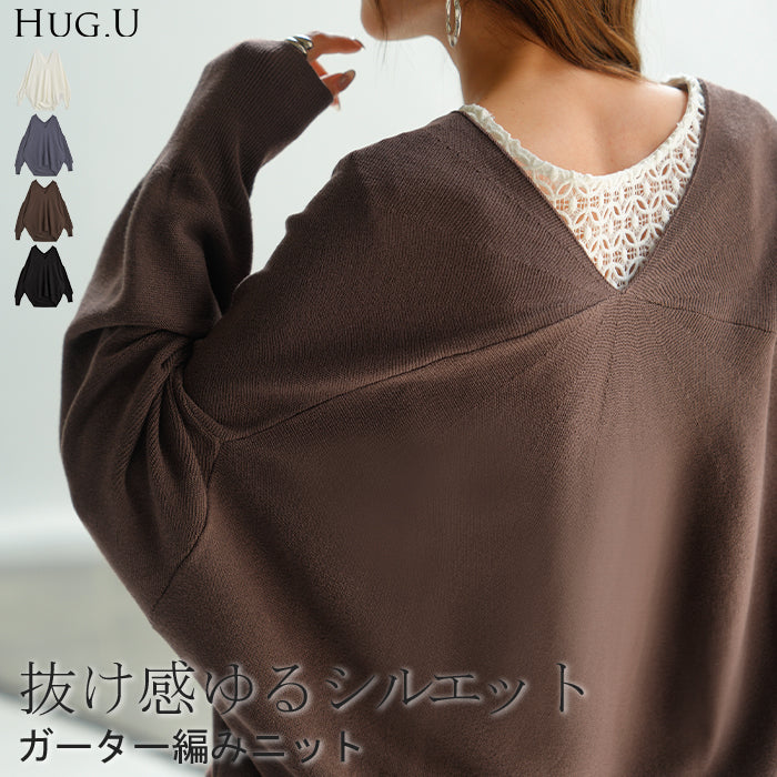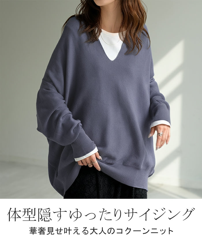 2025AW新作 ニット Vネック コクーン レディース トップス ロング セーター オーバー プルオーバー 長袖 長い レイヤード リブ チュニック ドルマン チクチクしない ゆったり 薄い 柔らかい 体型カバー 大きいサイズ お尻が隠れる カジュアル 黒 白 秋 冬 HUG.U