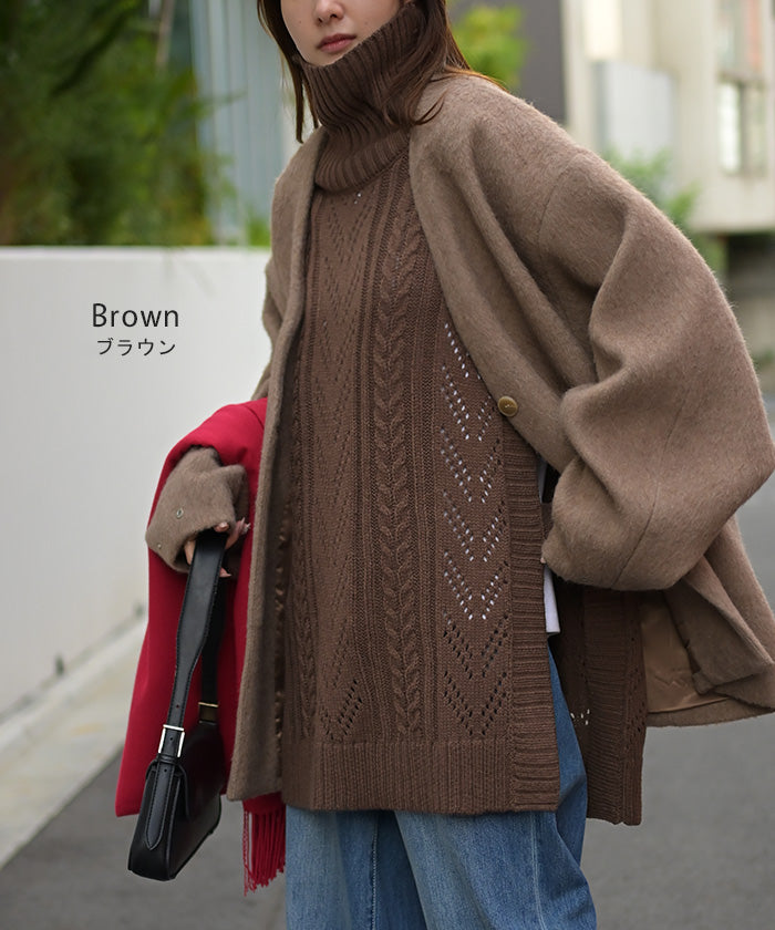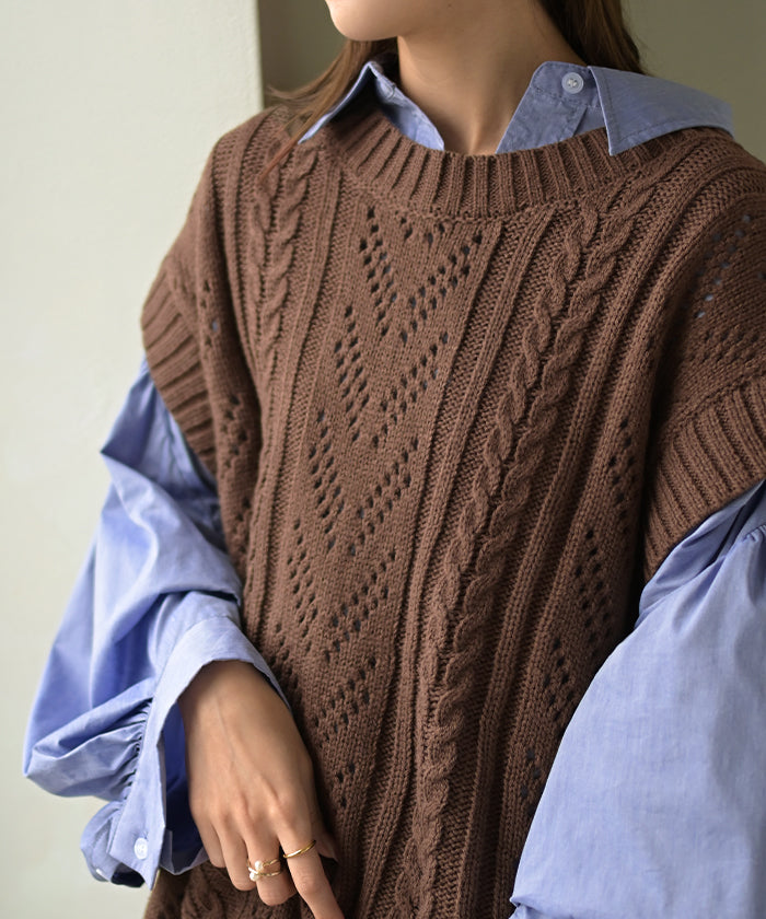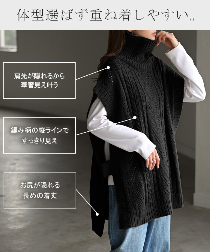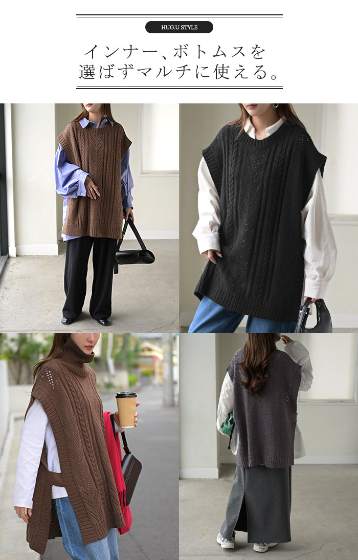 2025AW新作 ニット ベスト ケーブル編み " ■一部12月下旬入荷 選べる 2ネック " ニットベスト 透かし編み レディース トップス ロング セーター ロングベスト 薄手 スリット ハイネック クルーネック レイヤード 体型カバー ゆったり お尻が隠れる 大きいサイズ 黒 グレー 秋 冬 HUG.U