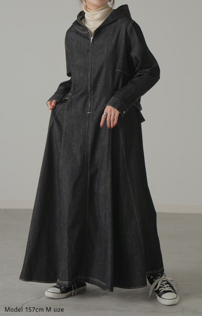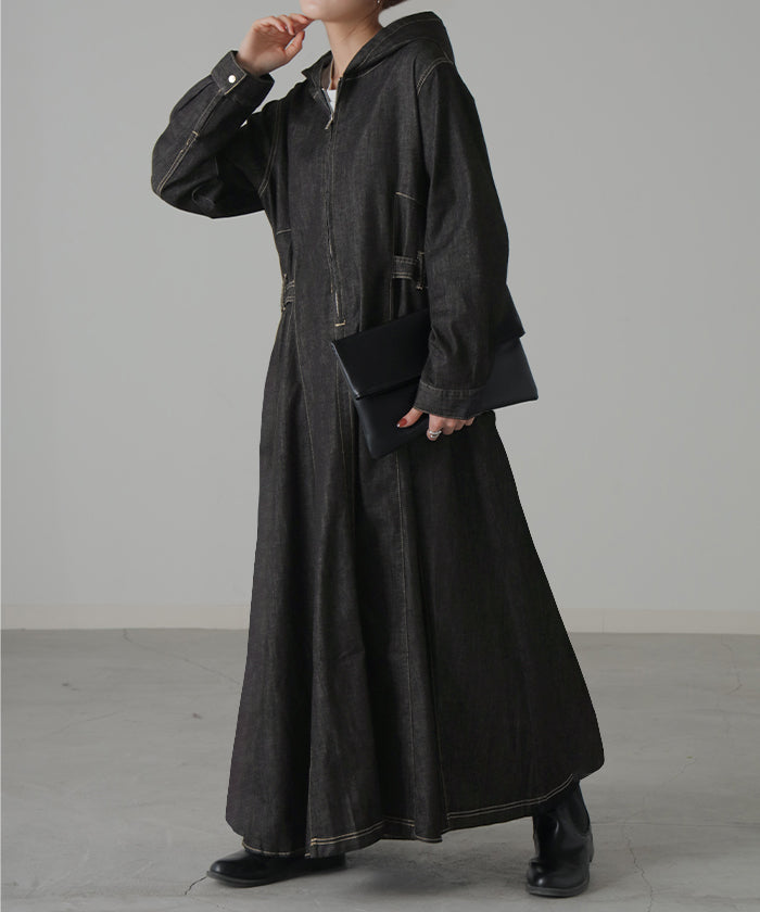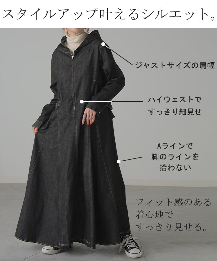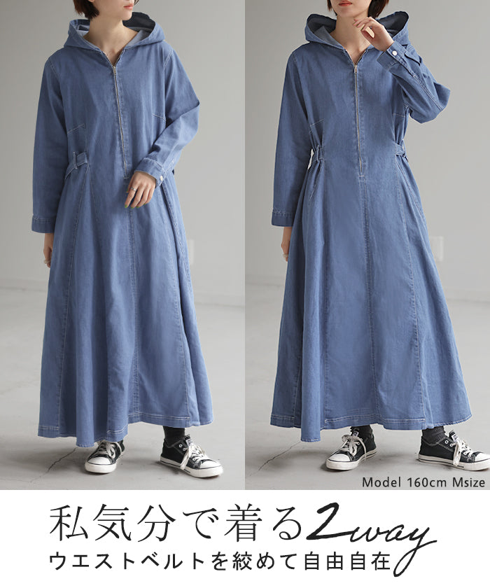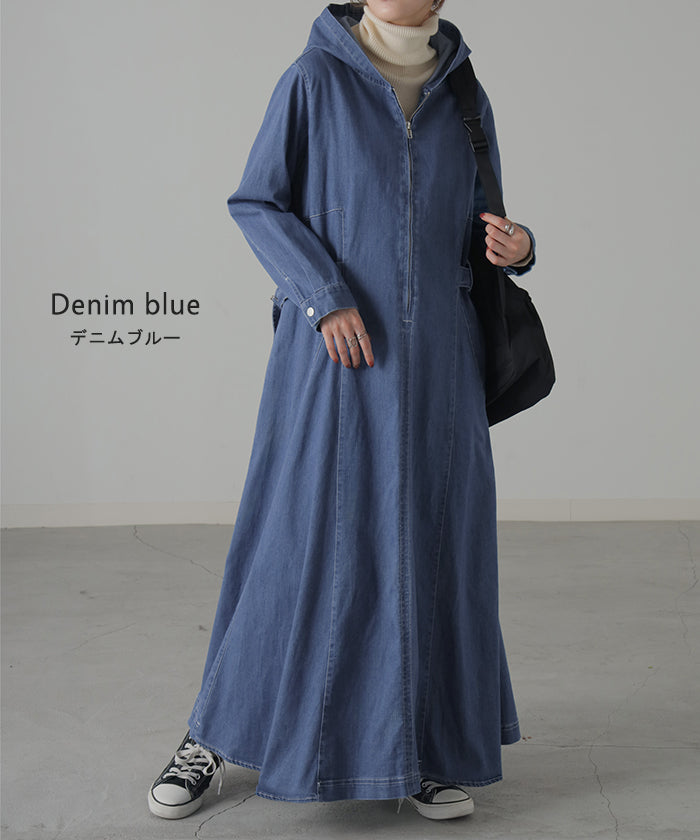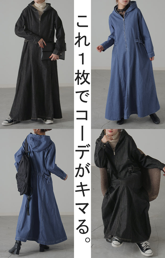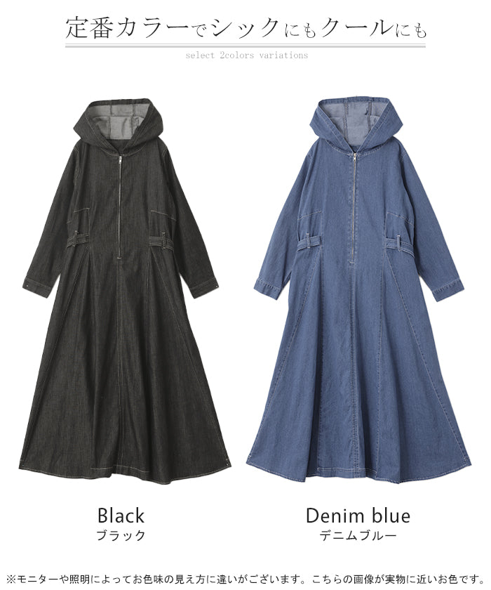 ワンピ デニム タイト目 ワンピース ■一部11月中旬入荷 ハーフジップ デニムワンピ デニムワンピース ロングワンピース レディース フーディー パーカー ロング ロングワンピ マキシ Aライン 長袖 薄手 フード パーカーワンピース パーカーワンピ ジップ 黒 春 夏 HUG.U