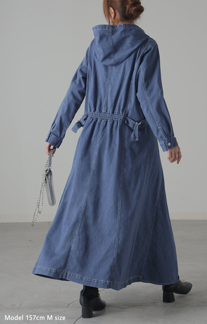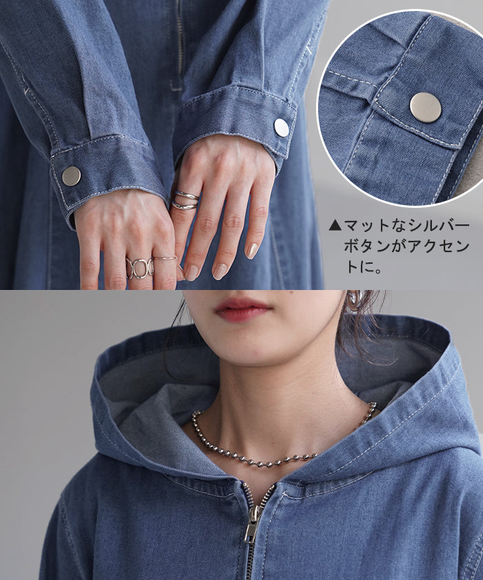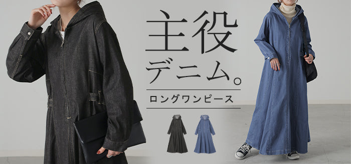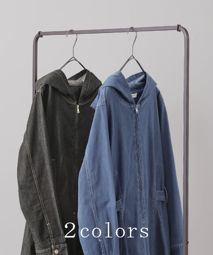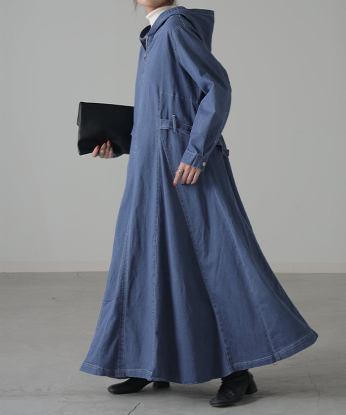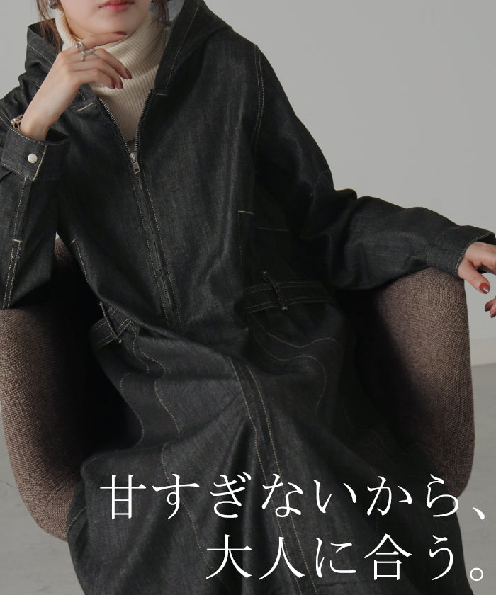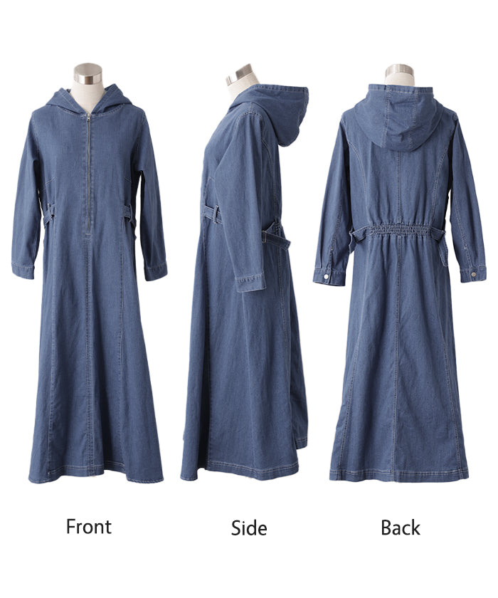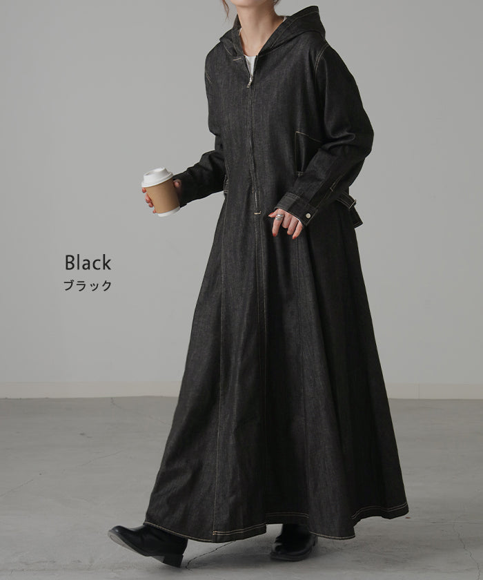 ワンピ デニム タイト目 ワンピース ■一部11月中旬入荷 ハーフジップ デニムワンピ デニムワンピース ロングワンピース レディース フーディー パーカー ロング ロングワンピ マキシ Aライン 長袖 薄手 フード パーカーワンピース パーカーワンピ ジップ 黒 春 夏 HUG.U