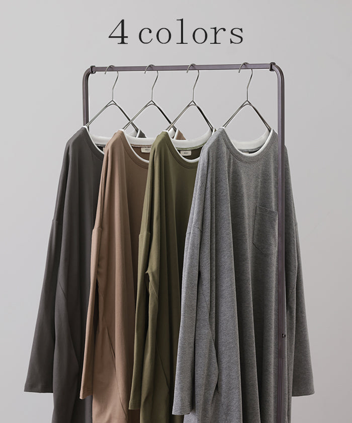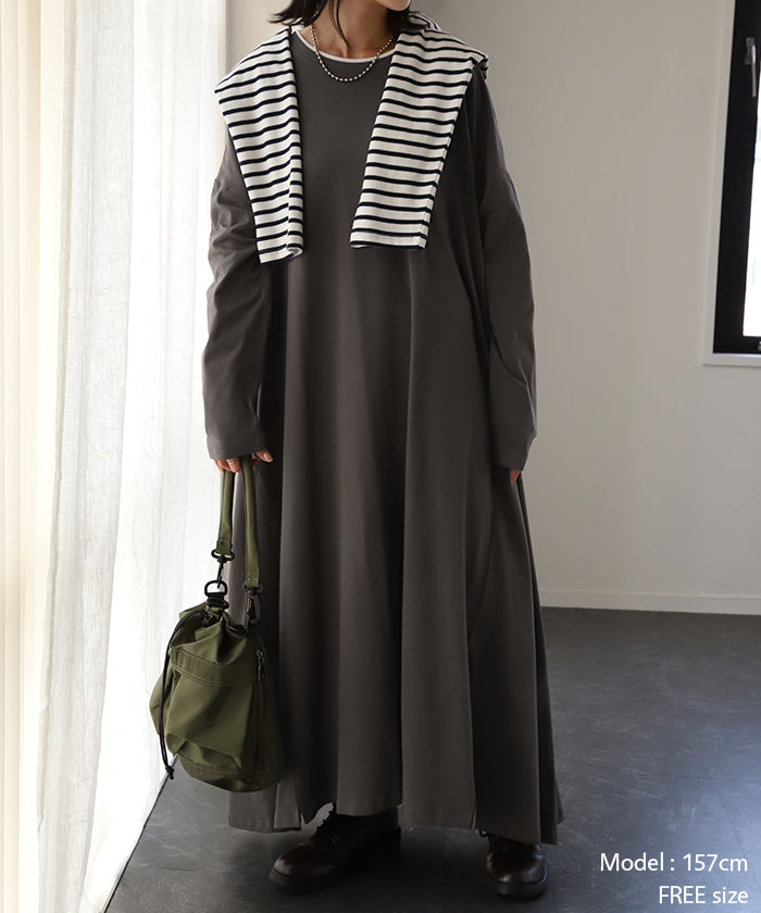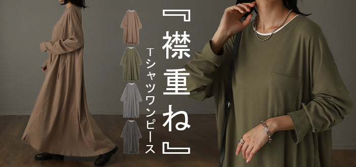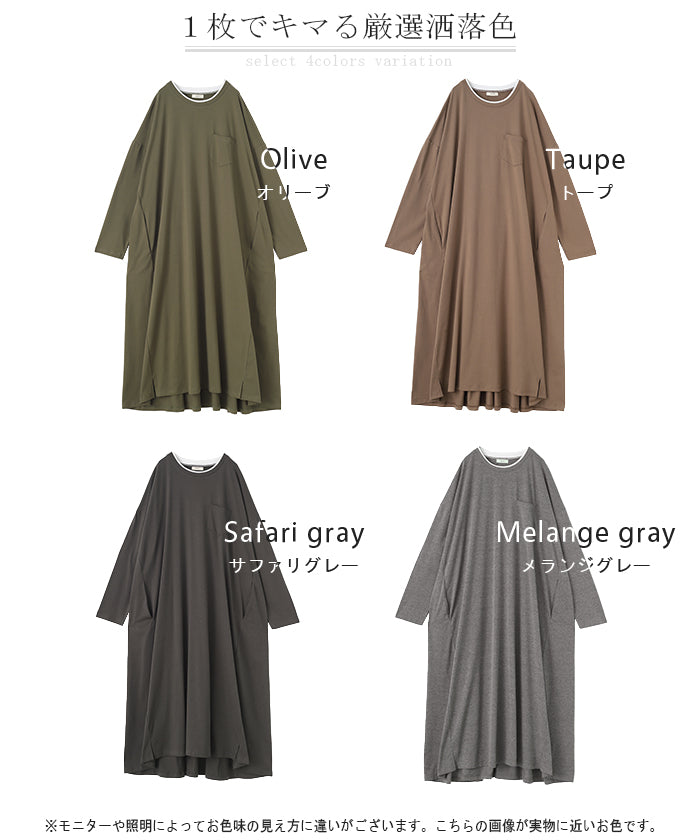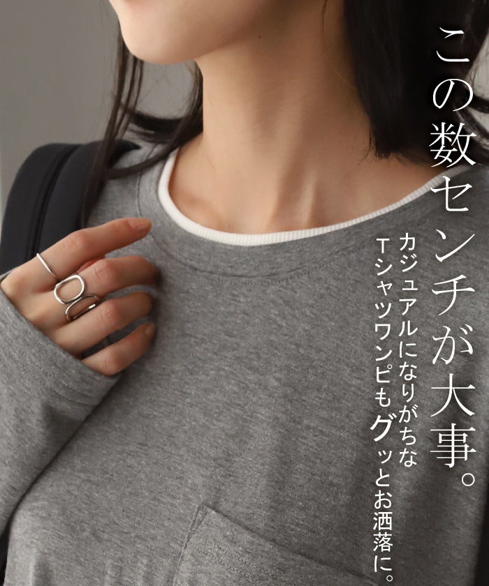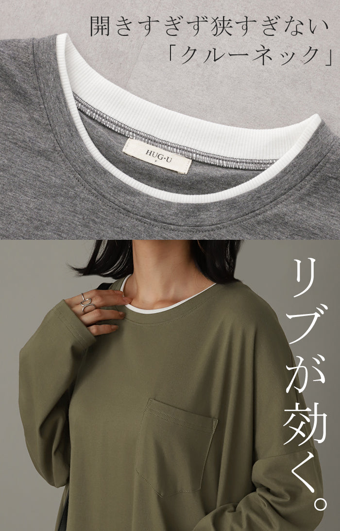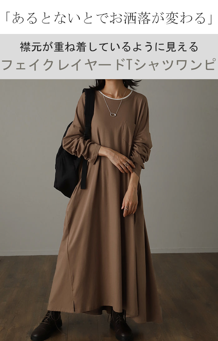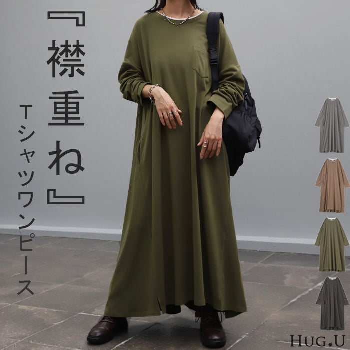 その1cm で変わる「 重 ね 襟 」ワンピース レイヤード レディース カットソー 長袖 ワンピ リブ Tシャツワンピース ロングワンピース ロングワンピ ロング Tシャツ ビッグ ロンT マキシワンピ 大きいサイズ フェイク 大人 体型カバー 春 夏 HUG.U