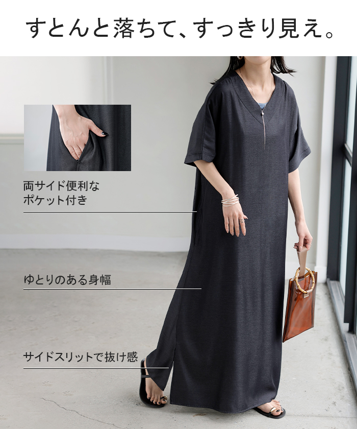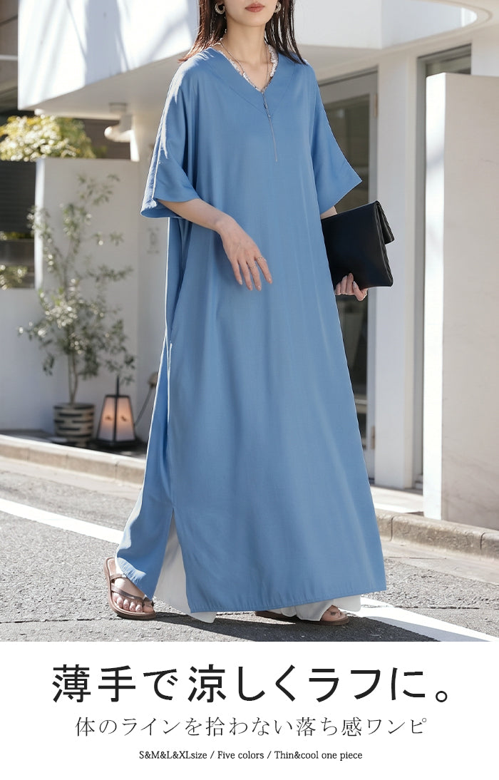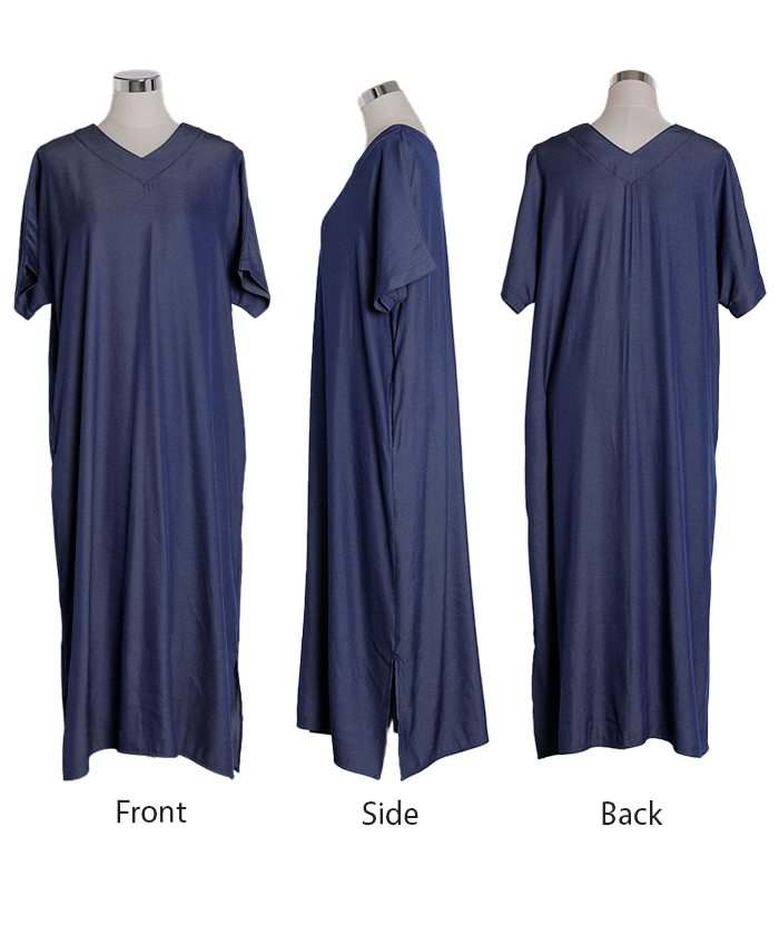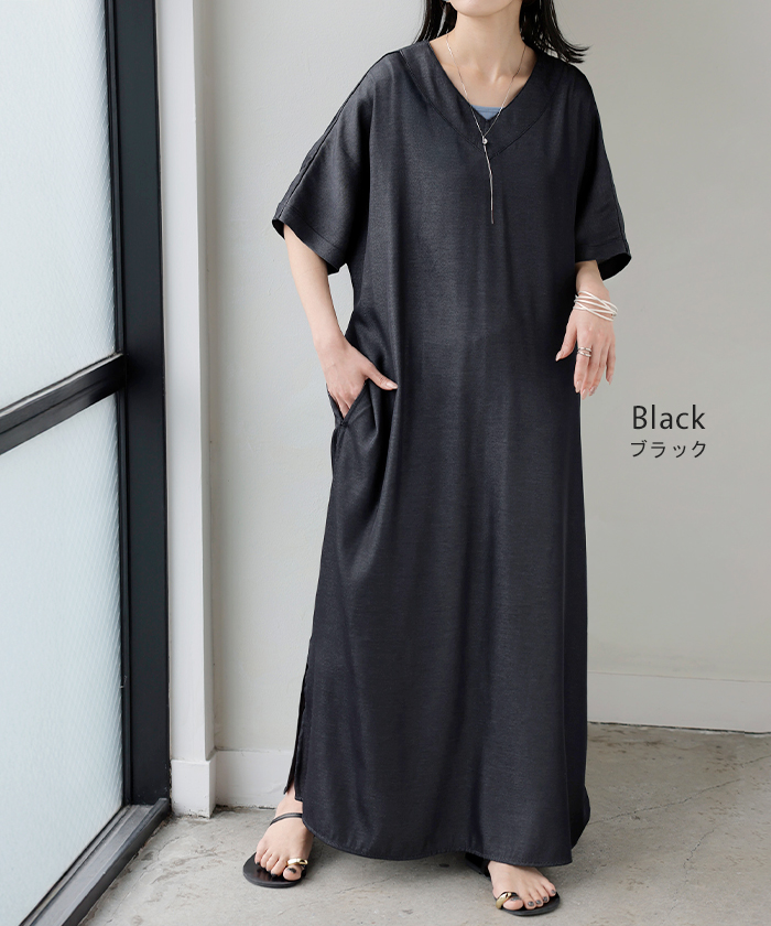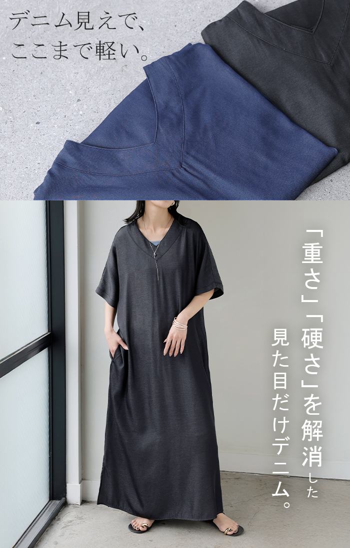 2026SS新作 ワンピース ロング レディース ロングワンピース マキシ丈 半袖 Vネック キーネック 薄手 軽い 軽量 デニム風 スリット ポケット 落ち感 とろみ Aライン 重ね着 体型カバー 二の腕カバー 大きいサイズ ゆったり きれいめ カジュアル 黒 白 春 夏 HUG.U
