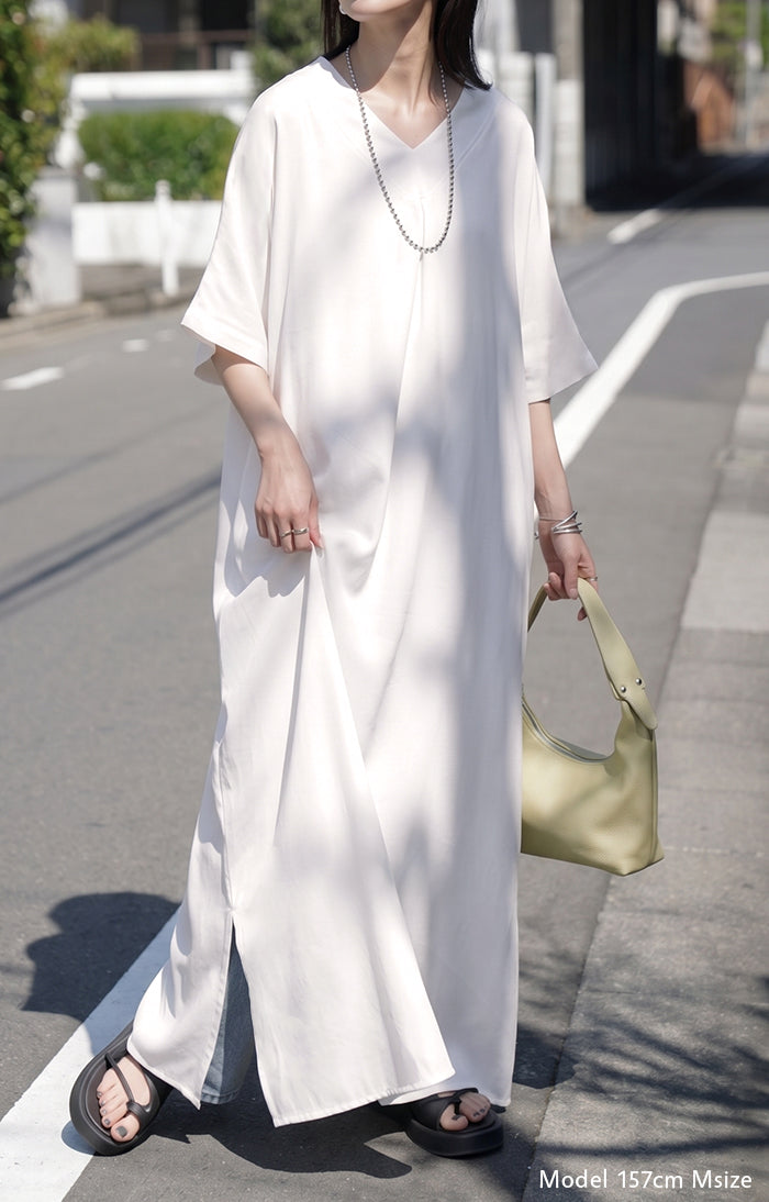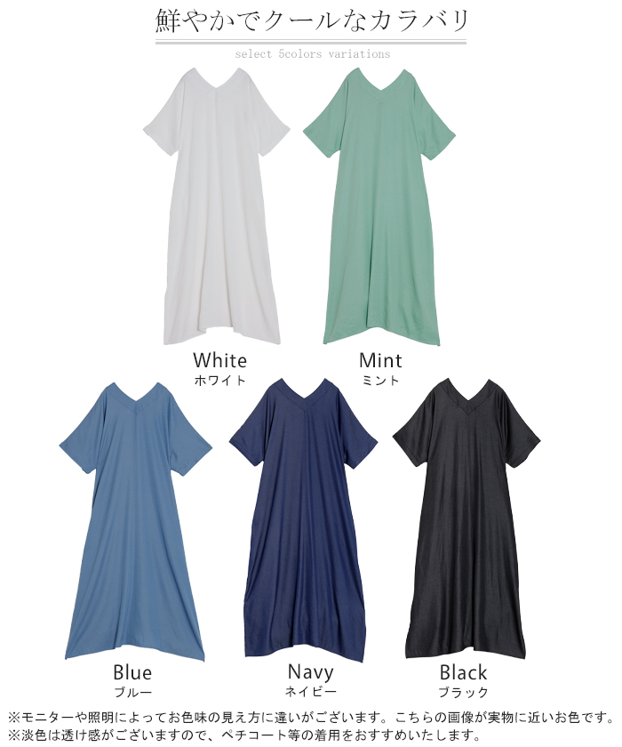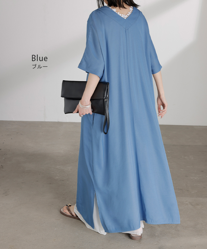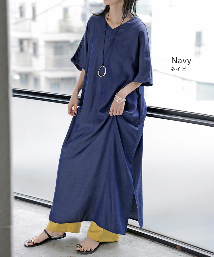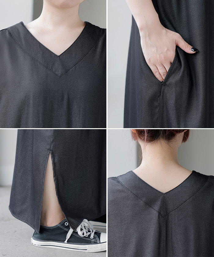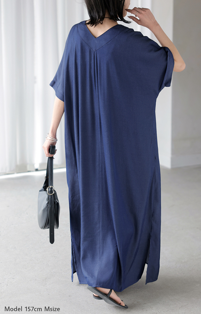 2026SS新作 ワンピース ロング レディース ロングワンピース マキシ丈 半袖 Vネック キーネック 薄手 軽い 軽量 デニム風 スリット ポケット 落ち感 とろみ Aライン 重ね着 体型カバー 二の腕カバー 大きいサイズ ゆったり きれいめ カジュアル 黒 白 春 夏 HUG.U