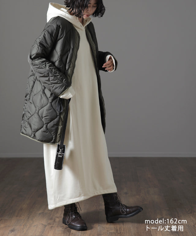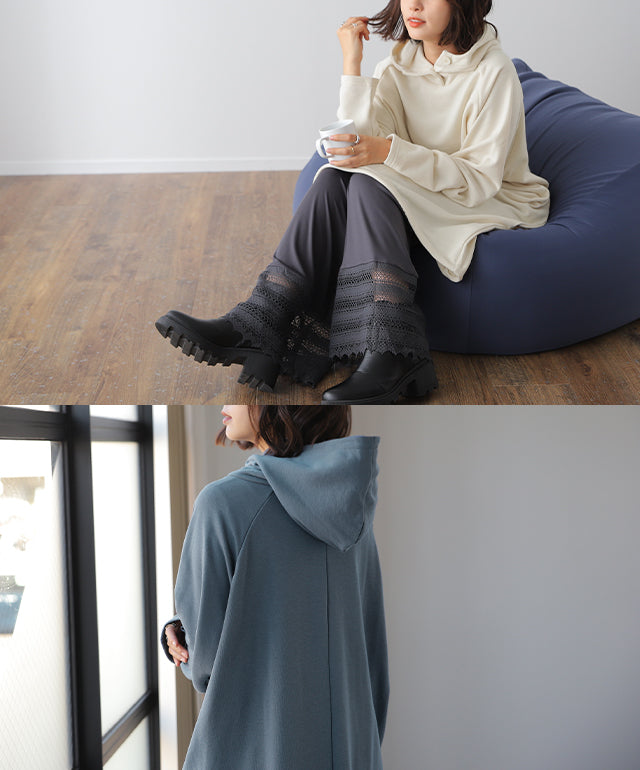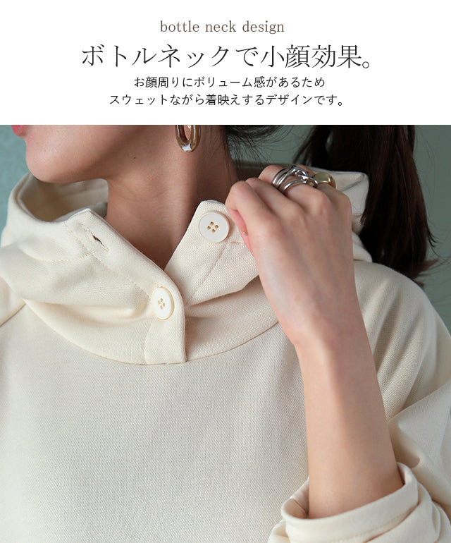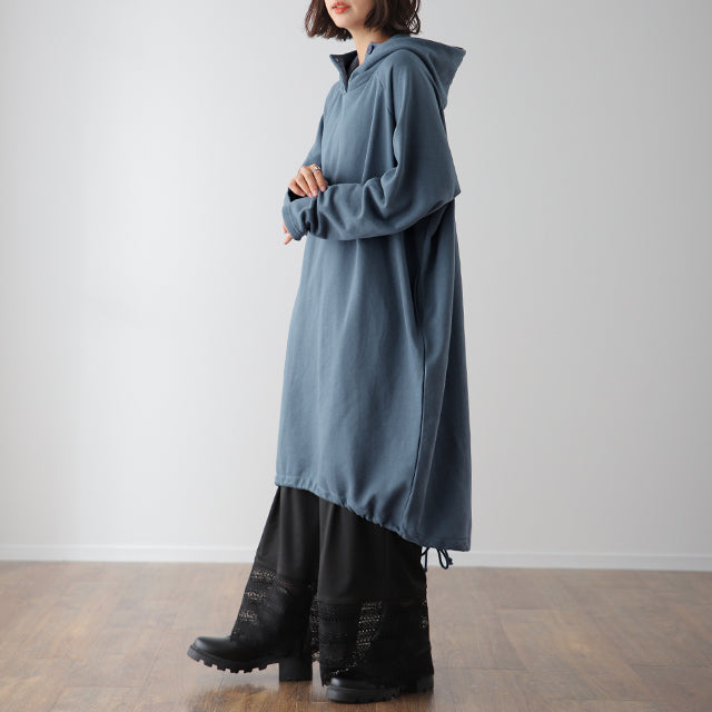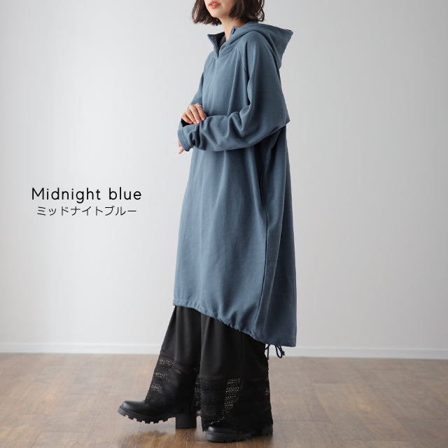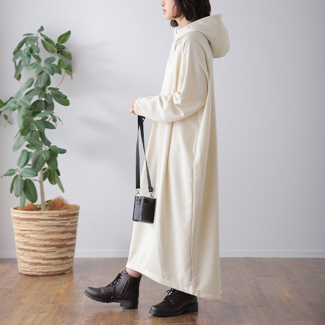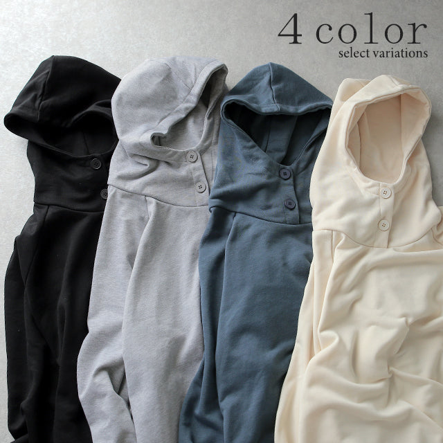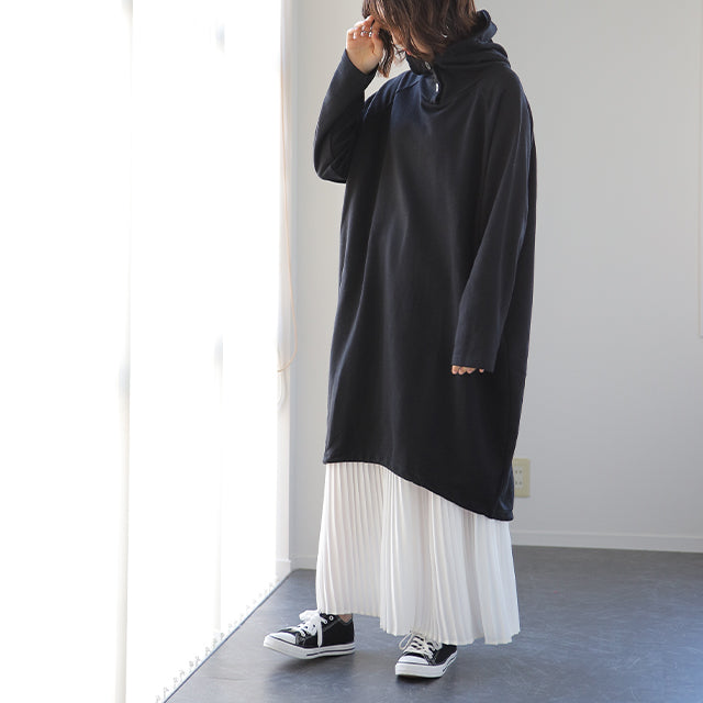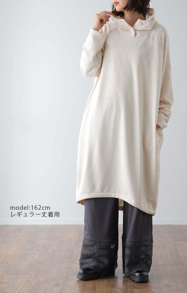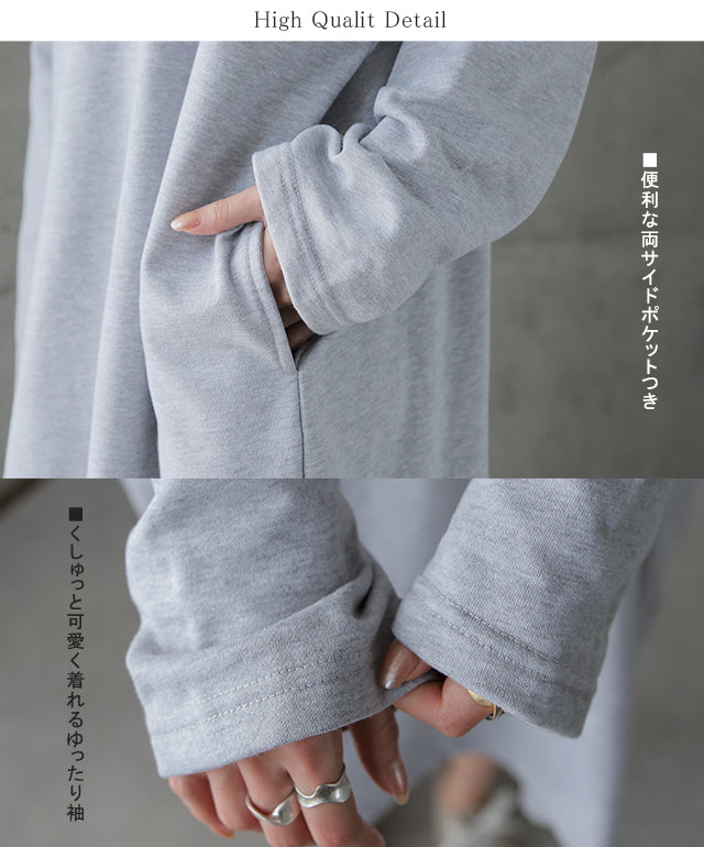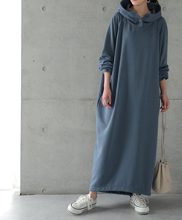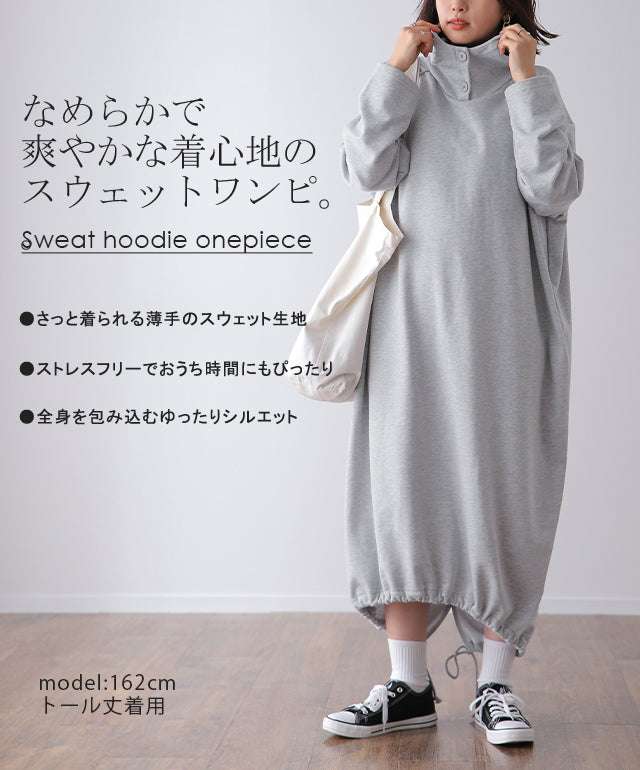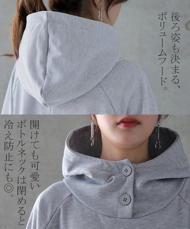 カジュアルながらに大人っぽく着こなせるパーカーワンピース。首元はボタン仕様のハイネックで珍しくスタイリッシュな印象に。おうちにいる時間でもリラックスして着用でき、ちょっとしたお出かけにも大活躍です。
