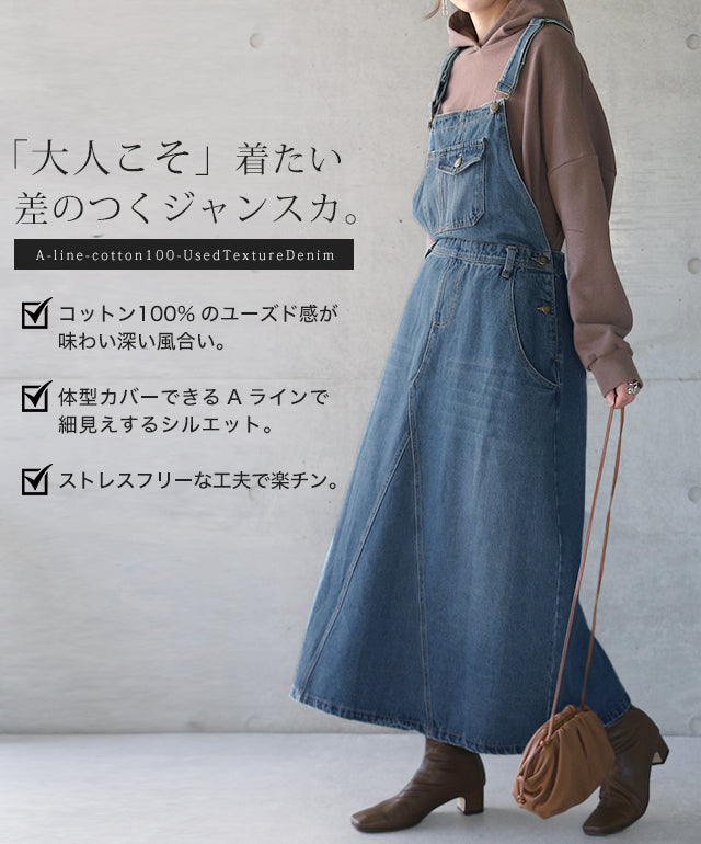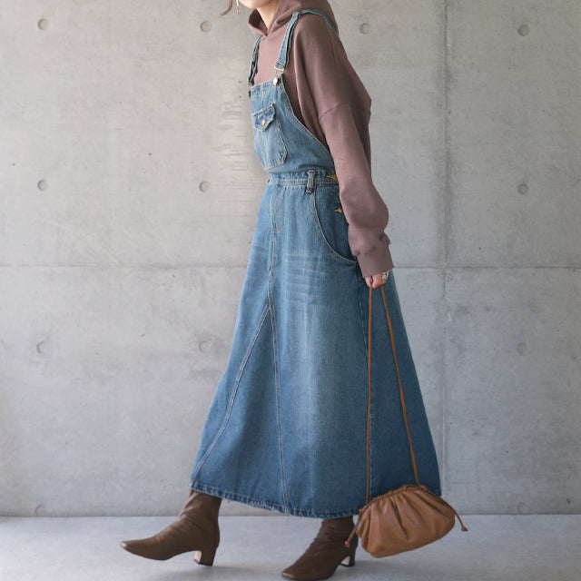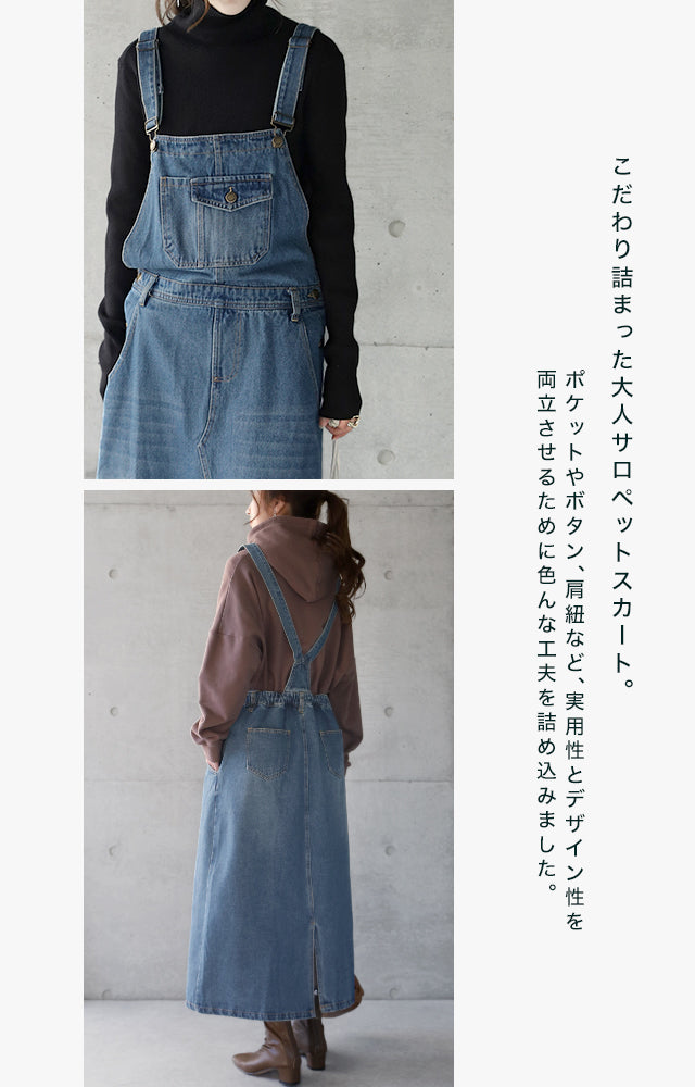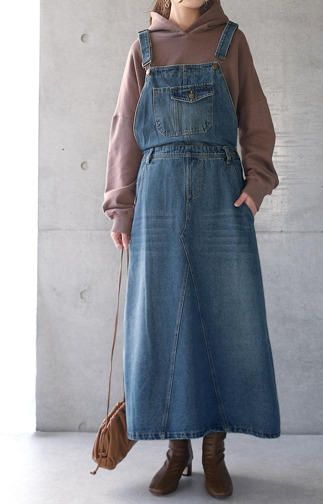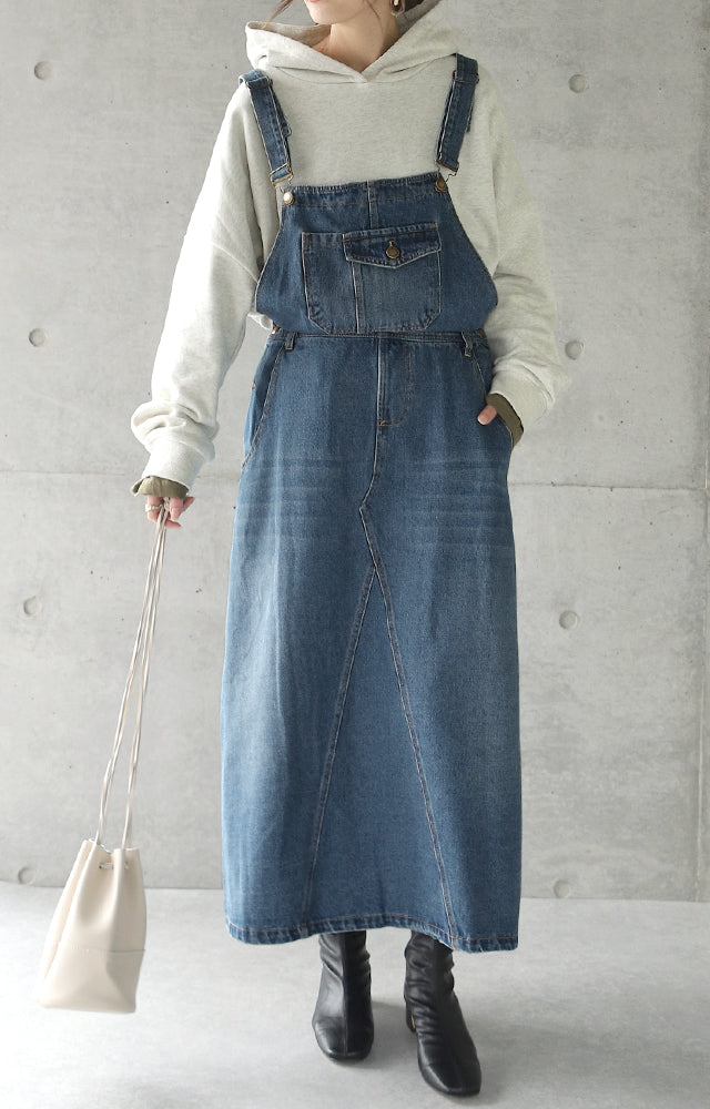 1年中大活躍間違いなし♪デニムジャンパースカートが登場しました。ロング丈でしっかりスラっと縦ラインを強調してくれるので、細見えするオトナ綺麗なカジュアルデニムコーデが完成します。