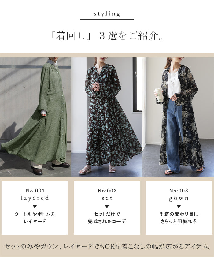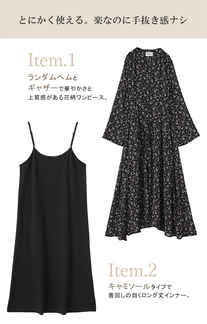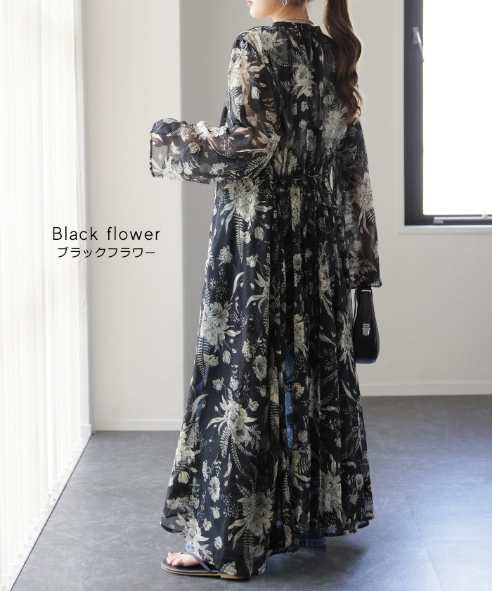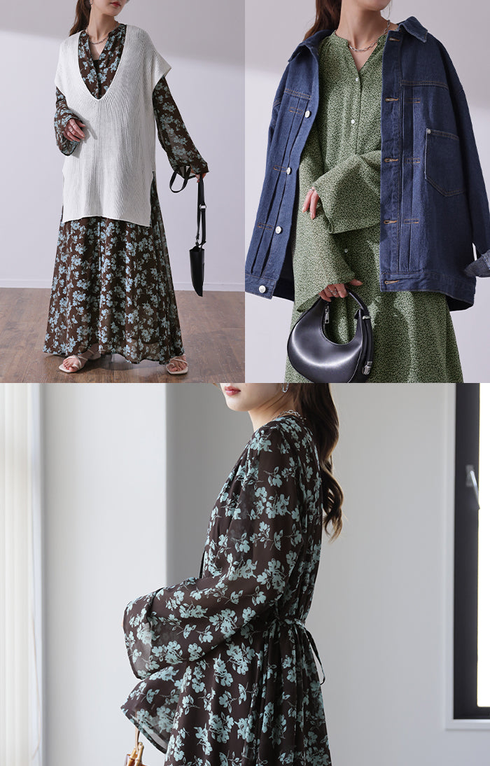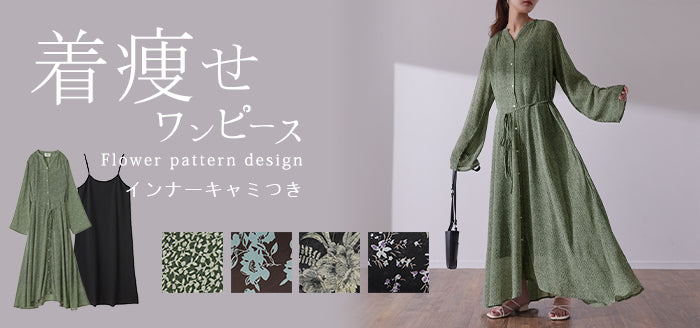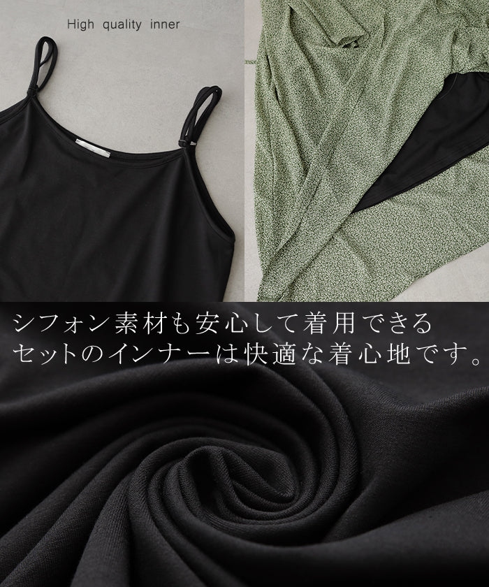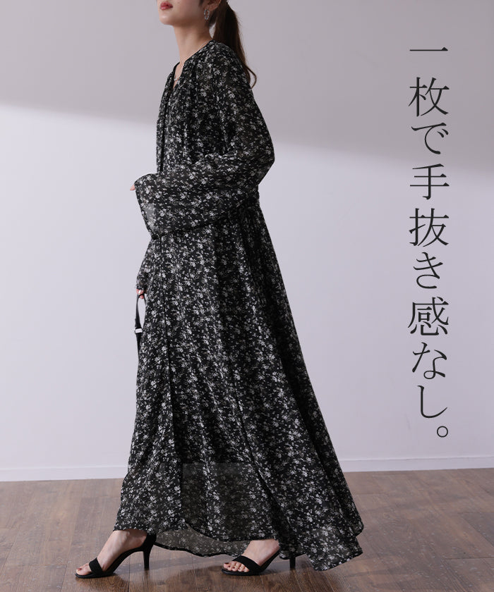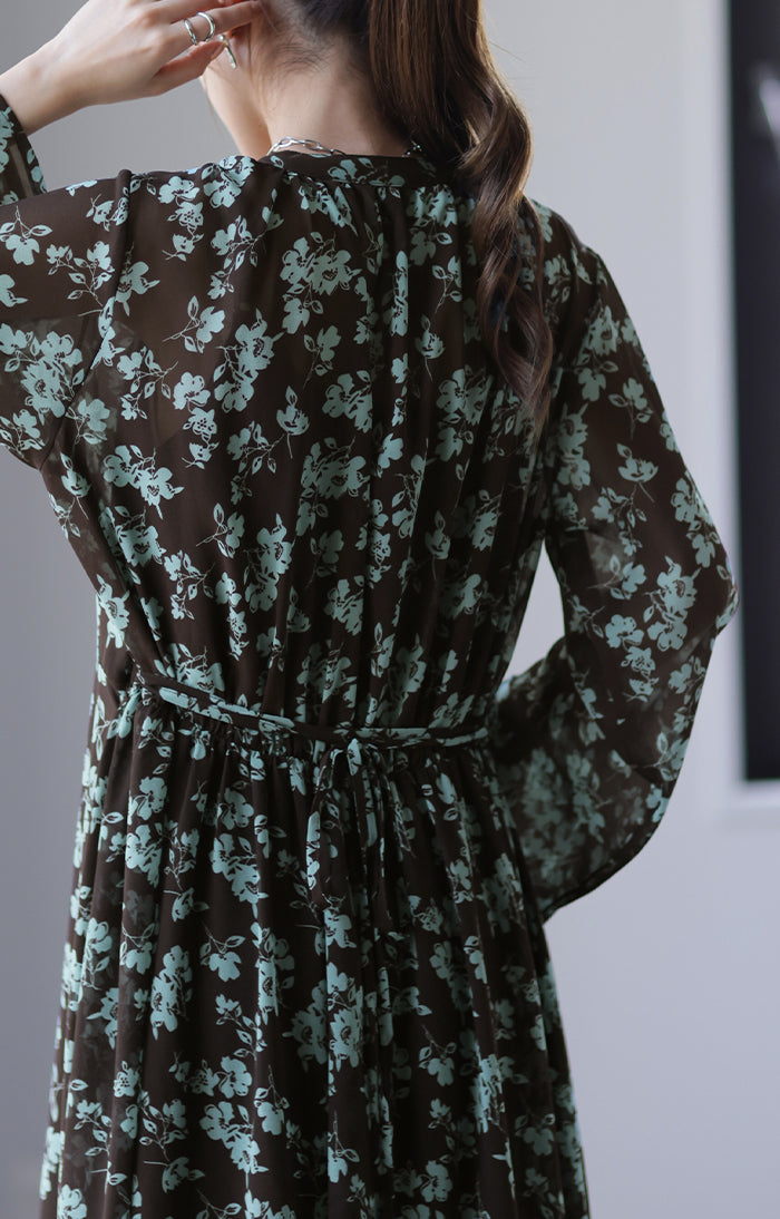 インナーキャミワンピがセットになったシフォンワンピースです。甘くなりがちな花柄ワンピですが落ち着いた色味で大人な印象に。ワンピースとしてはもちろん前開きでシフォンガウンとしても使えてロングシーズン活躍します。■モデル着用アイテム ⇒ トップス / パンツ■モデル着用アイテム(左) ⇒ トップス■モデル着用アイテム(右) ⇒ アウター■モデル着用アイテム(上) ⇒ トップス■モデル着用アイテム(下) ⇒ アウター※モデル着用商品は在庫切れ・販売終了・リンク切れの場合がございます。