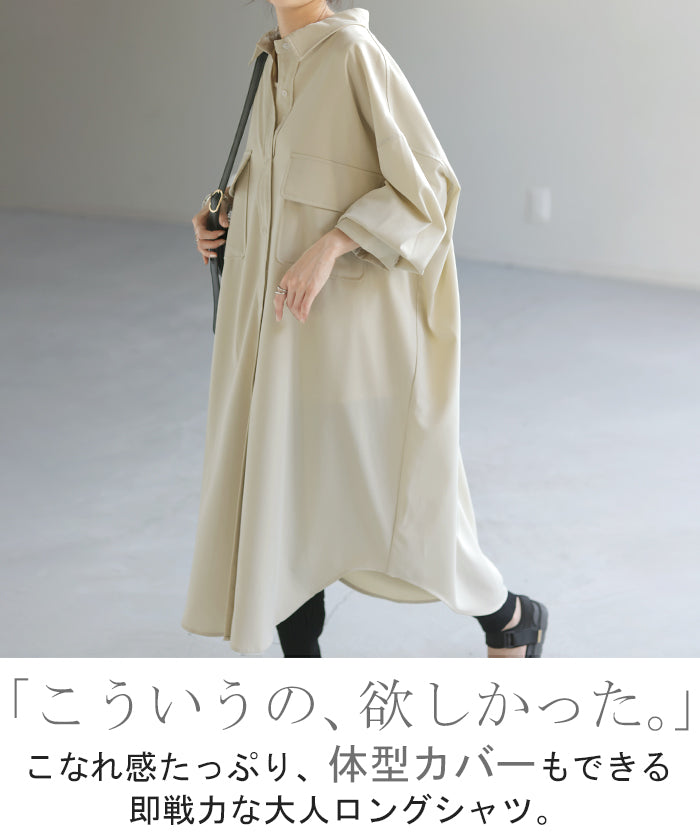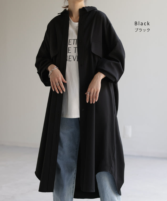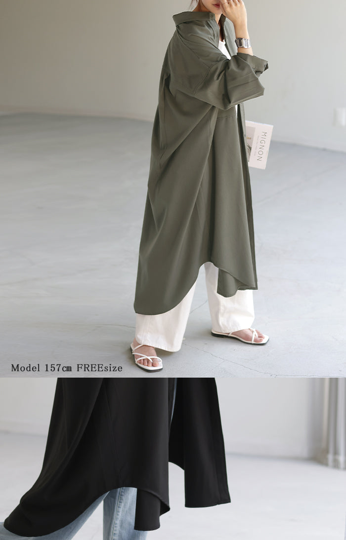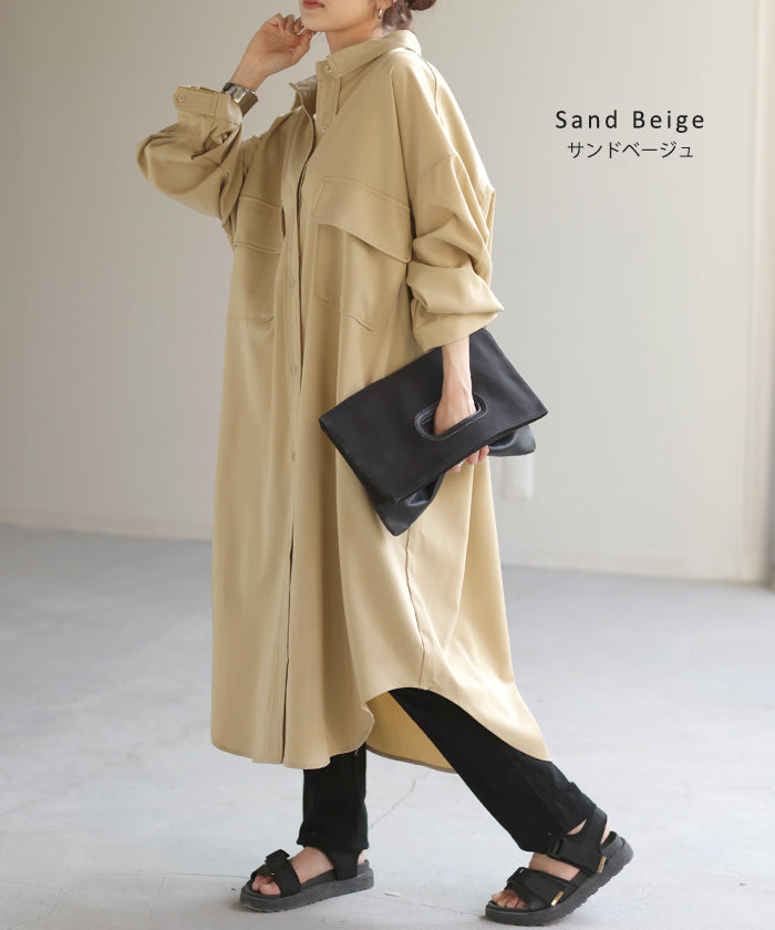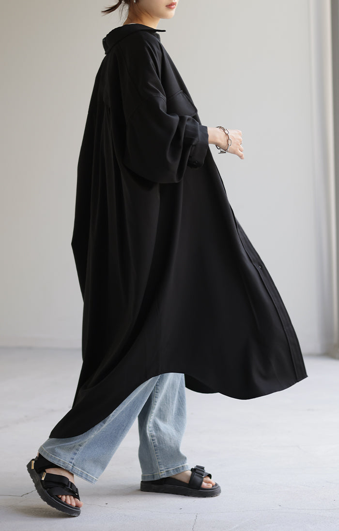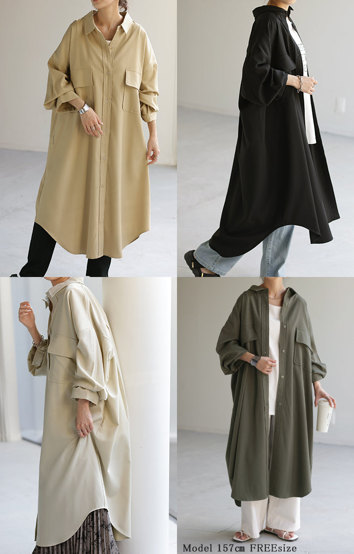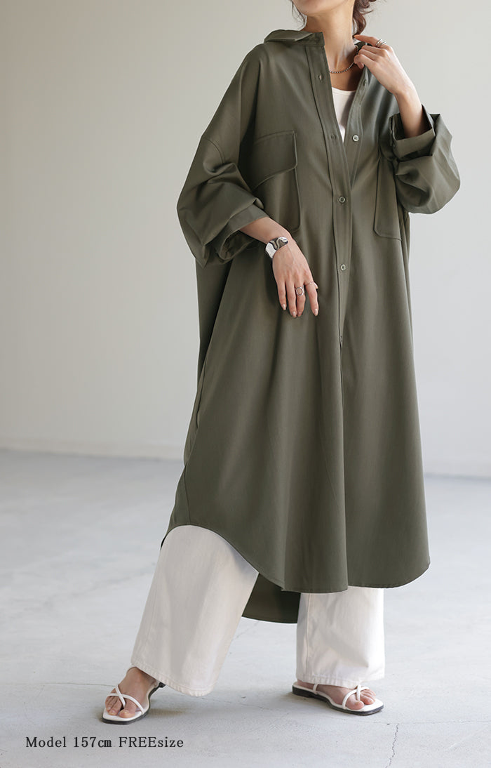 季節の変わり目に、羽織り物として購入。 生地感は厚過ぎず、薄過ぎず、羽織るとスルッと落ちて軽く、身体に負荷は感じらません。 デザインも前を開ければロングジャケットにも見えるし、閉じてワンピースとして着たり、ロングシーズン活躍してくれそうです。