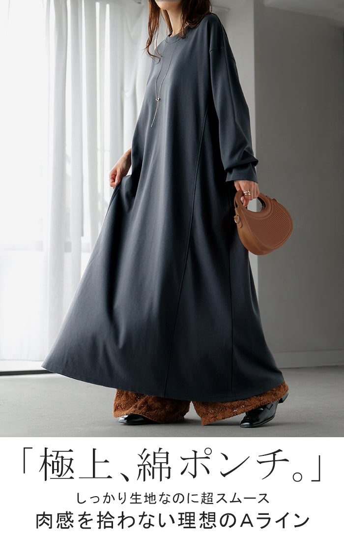 2025AW新作 ワンピ ロング ポンチ 防汚 " 選べる 2丈 " レディース ロンT ロングワンピース カットソー コットンポンチ Aライン マキシ マキシワンピース ロングワンピ クルーネック カラバリ ストレッチ カジュアル 高身長 長袖 大きいサイズ 無地 黒 白 秋 冬 HUG.U