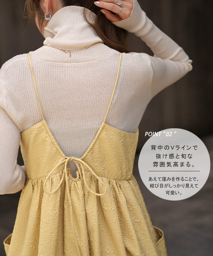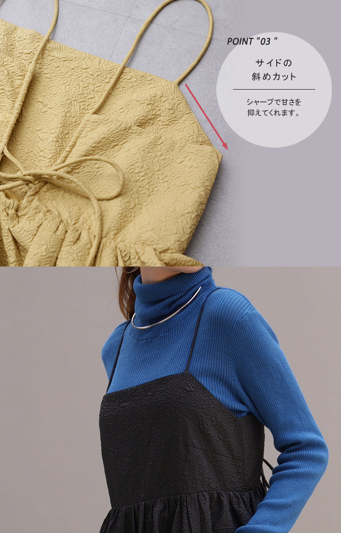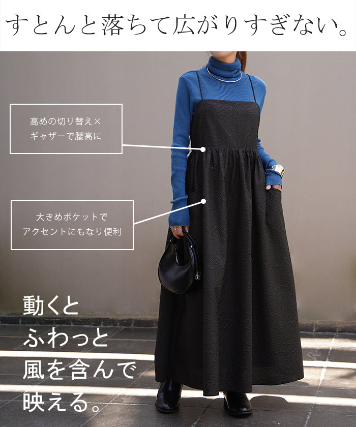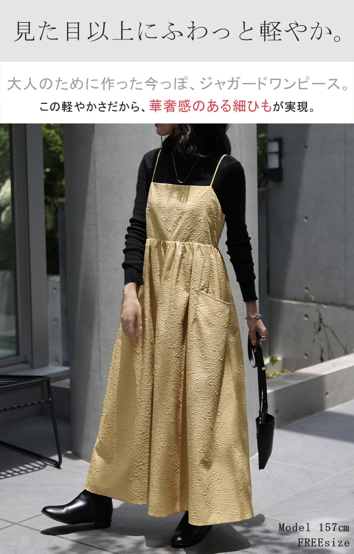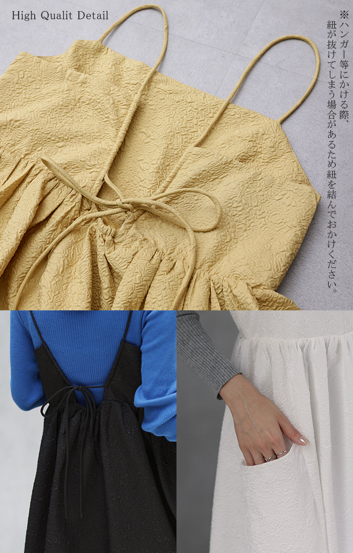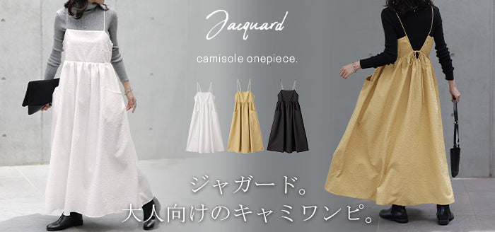 凹凸感のあるジャカード素材がパッと目を引くキャミワンピースです。ギャザーがたっぷり入ったAラインのシルエットが今っぽい。インナーを重ねてレイヤードしたり上に羽織を合わせたスタイリングなど幅広く楽しめます。■モデル着用アイテム ⇒ トップス■モデル着用アイテム ⇒ トップス■モデル着用アイテム ⇒ トップス■モデル着用アイテム ⇒ トップス■モデル着用アイテム ⇒ トップス■モデル着用アイテム ⇒ トップス※モデル着用商品は在庫切れ・販売終了・リンク切れの場合がございます。