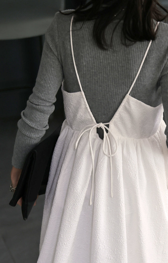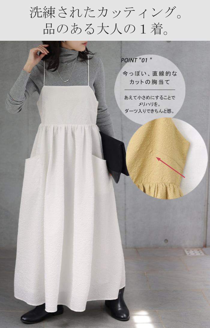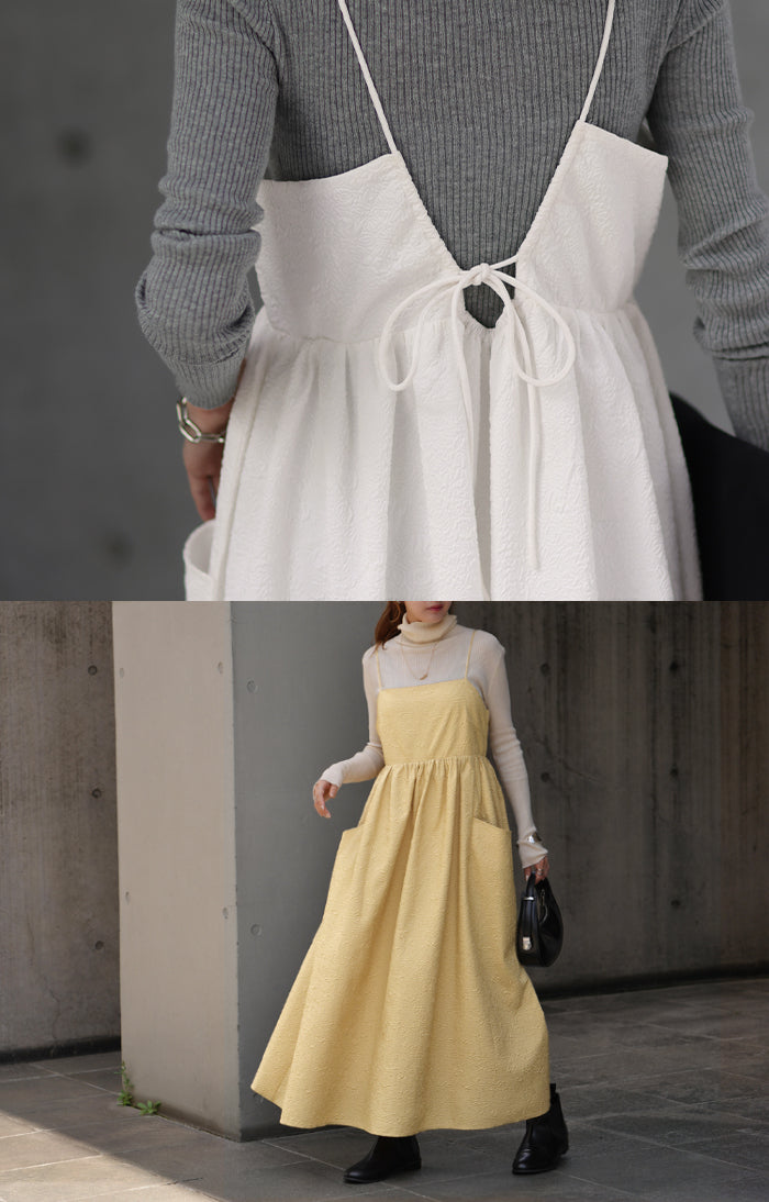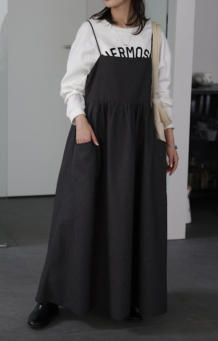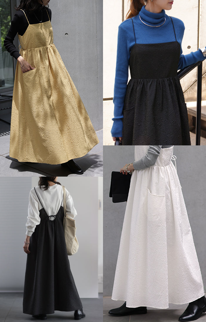 写真で見たらゴツゴツしてるかな?とおもったのですが、じっさい手に取ったら生地は柔らかく、シワにもならないし、形成がフワッとしているのでシルエットが細く見えてよいかんじです。スカートの長さも肩紐で調節可能なのが良いです。