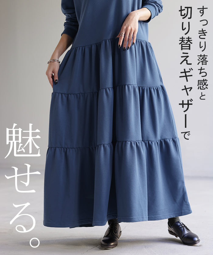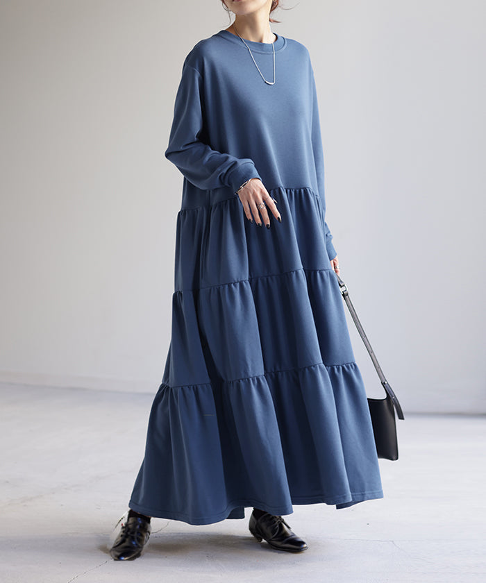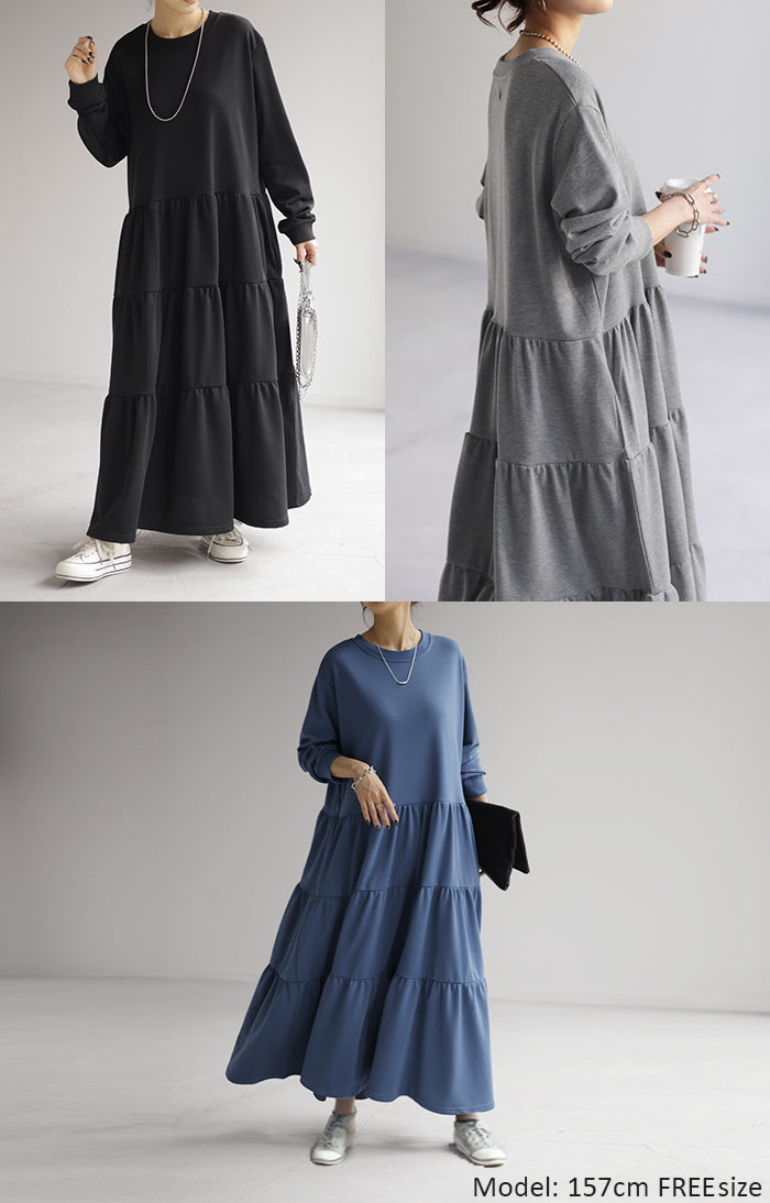 ワンピ ティアード スウェット ワンピース ■一部1月下旬入荷 ロングワンピース スエット トレーナー 薄手 レディース ロングワンピ マキシ ティアードワンピ 長袖 ロング Aライン ティアードワンピース フレア ゆったり 体型カバー 大きいサイズ ブルー 黒 春 夏 HUG.U