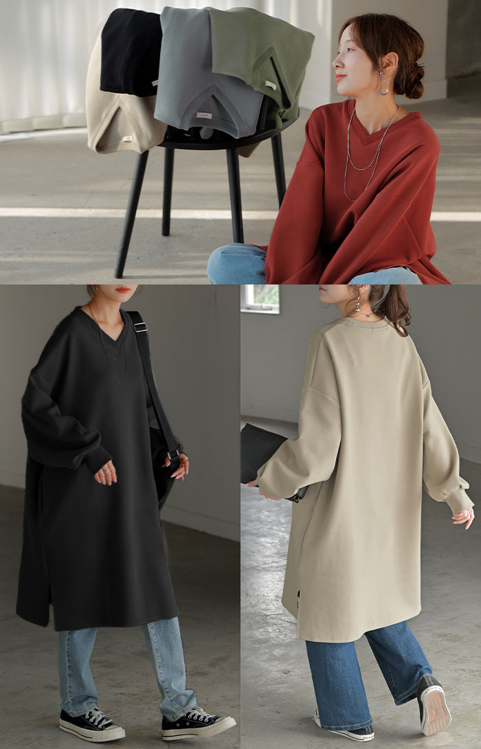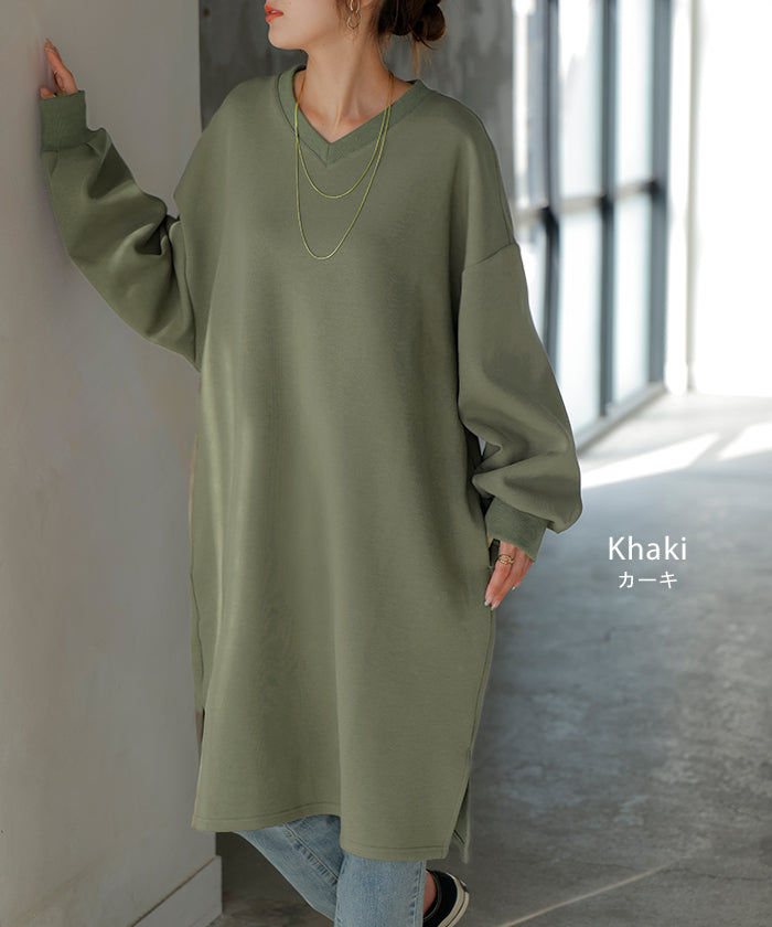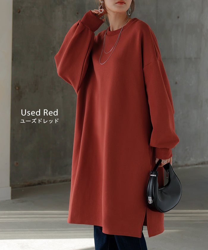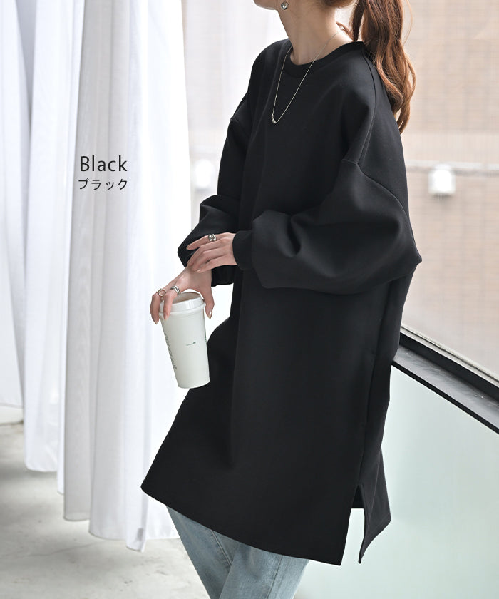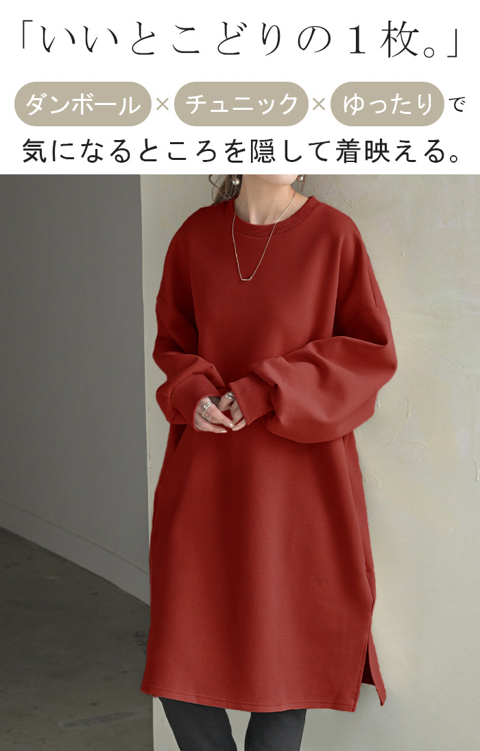 ワンピース ダンボール チュニック レディース トップス ロング スウェット プルオーバー シワになりにくい 無地 長袖 ワンピ クルーネック リブ レイヤード ドルマン オーバーサイズ ゆったり 体型カバー 大きいサイズ 黒 グリーン 春 夏 HUG.U