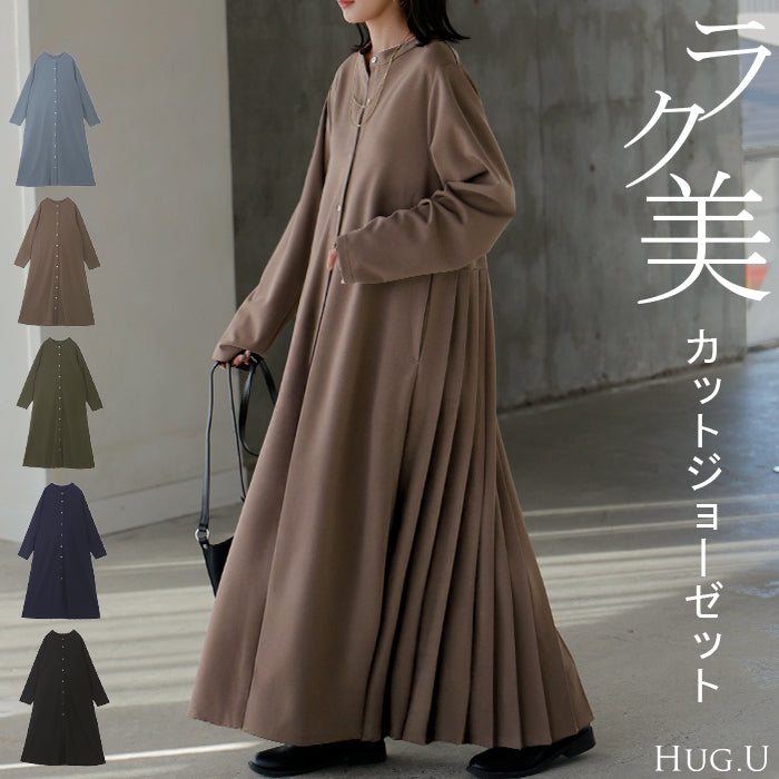 2025AW新作 ワンピース プリーツ ノーカラ― レディース ロング ロングワンピース Aライン マキシ マキシワンピース ワンピ ロングワンピ シャツ シャツワンピース シャツワンピ 長袖 羽織 きれいめ 体型カバー 大きいサイズ 無地 黒 秋 冬 HUG.U